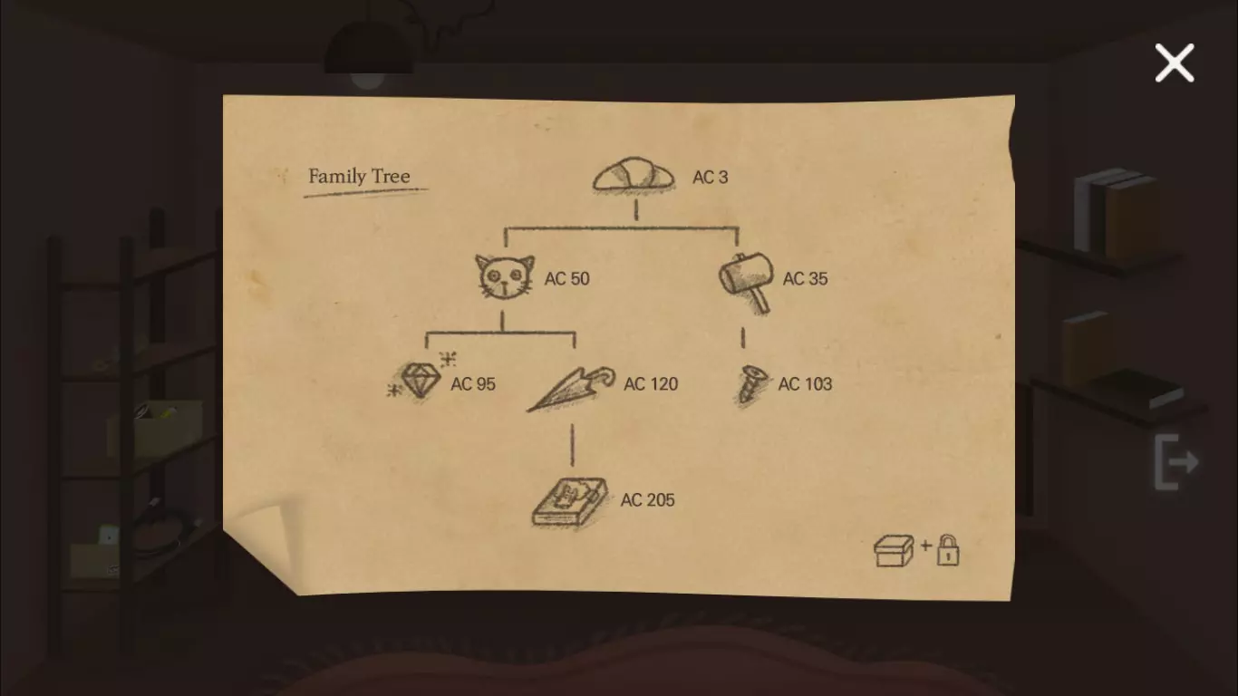 与穿着树装的女孩娜米对话。拿起黄色颜料和开瓶器。将黄色颜料用在镜子上。 向右走并点击拉杆。通过桥梁,观察画框。回到电梯处,点击闪烁的绿灯。进入小门。 拿起油漆滚筒。打开最下面的抽屉,拿起折叠的纸。在物品栏中点击它,你会看到一个符号方程式。当你打开柜子并看到【家谱】(见下图)时,这就说得通了。每个图画都对应一个数字。