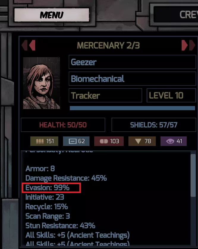 追踪者——为何选择他们? 谁能想到,《深空遗物》中最出色的队伍之一,会是由三名追踪者组成的阵容呢?不过,为什么是追踪者呢?原因其实很简单。 优势: 1. 该队伍能运用追踪者自带的两种潜行系统(“潜行突袭”和“紧急隐形”)。 2. 当英雄处于潜行状态时,敌人无法用直接攻击命中他们,除非使用范围技能。但这类技能非常罕见,使用它们的敌人也同样稀少,因此在游戏初期的大部分时间里,你无需为此担忧。 3. 极高的伤害上限。造成的伤害越高,战斗结束得就越快,受到的伤害也就越少。基本上,这样能增加你的 credits 收入。更快的战斗节奏意味着你每小时能击败更多敌人,而受到更少伤害则意味着无需花费 credits 治疗英雄。 极高的 initiative。你能更早开始回合——更早消灭敌人。就这么简单。 技能【标记目标】能将那些难以对付的敌人(高闪避或高伤害抗性)变成小菜一碟。 闪避。追踪者本身拥有游戏中最高的闪避率之一。看看我下面这些家伙,他们有着高达 99% 的闪避率(对闪避能力嗤之以鼻)。 缺点 但缺点呢?肯定会有一些,事实上也确实存在: 陷阱。你是否曾经好奇,当你穿过废弃飞船时听到的“哔-哔-哔”声是什么?这是陷阱的声音,除非你有一些【拾荒工具包】,否则你的队伍将缺乏任何拆除陷阱的技能。 幸运的是,你从陷阱中受到的伤害微乎其微,一旦你积攒足够的 credits 购买【拾荒工具包】,几乎就可以永远不用担心陷阱了。 任务相关技能。有些任务会让你进行技术性技能挑战,而我们缺乏这些技能,但这些任务并不影响我们的游戏进程,所以我们可以轻松忽略它们。 重复循环。重复性是这个队伍最糟糕(也可以说是唯一的)大缺点。每场战斗在技能/卡牌使用方面看起来都和上一场几乎一模一样。这会让你很快感到厌烦。