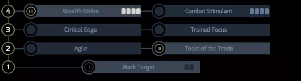 战斗 战斗相当简单直接。每回合,你的每个追踪者都会选择他们拥有的伤害最高的卡牌。由于他们拥有高伤害和【先手值】,你可以轻松在敌人回合开始前就消灭1到2个敌人。剩余的敌人通常也很难在死亡前突破你的护盾。 通常每场战斗会持续2-3回合。在达到4级之前,我们都将采用这种战术。 装备 武器 - 在达到4级之前,我们使用自己选择的远程武器,这类武器能提供高额伤害输出,并且比我们当前使用的武器拥有更少的卡牌。 武器改装 - 如果运气好,捡到提供0卡牌的改装件,就立即装备它们。否则,花一两分钟考虑一下安装那个模块。它的属性可能不错,但会额外增加2-3张卡牌。这可能会打乱我们持续的每秒伤害输出,因为每回合我们会抽到更多无用的卡牌,所以我们应该直接卖掉这个模块。 护盾方面,尽量频繁升级护盾模块。换成能提供最多护盾值且附带最少卡牌的模块。始终优先选择只附带1张卡牌的护盾模块。 工具方面,对我们最有帮助的是【拾荒者工具】,因为它能提供【制作补给】卡牌。这张卡牌不会给我们的牌组增加额外卡牌,反而能稳定牌组——让我们从牌组中选择一张想要的卡牌并立即使用(当你没有合适卡牌时非常有用)。扫描仪/能量升级 这部分升级可根据你的选择进行。升级那些你认为当前对你最有益的项目(通常优先升级能量,其次是背包),因为到游戏中期你会有足够的钱来轻松升级所有项目。 队伍等级2 当我们达到2级时,英雄们将学习以下技能: 输出型角色 - 在【贸易工具】上投入3点 支援型角色 - 在【敏捷】上投入2点 我们开始让队员专注于各自的角色定位。支援型角色增加一些他所缺乏的【闪避】,而输出型角色则进一步提升他们的伤害。 队伍等级3 3级也很简单: 输出型角色 - 在【敏捷】上投入1点 支援型角色 - 不分配点数,留到后面再用。 队伍等级4 太棒了!我们达到4级了,这才是乐趣的开始。技能点分配:在【潜行打击】上投入3点 辅助:在【潜行打击】上投入3点 【潜行打击】是我们的核心技能,也是我们在游戏全程最常使用的技能。由于该技能仅适用于近战,我们应在4级前为英雄们准备3把能量刃,否则将完全无法使用该技能。 若从常规状态(非潜行)使用此技能,伤害为110%;若从潜行模式使用,则伤害提升至170%,并会使英雄脱离潜行状态(与其他技能效果相同)。 因此,我们需卖掉远程武器,仅使用近战武器。 专精(子职业):伤害输出者选择【化学家】专精。你可以改用【军需官】,因为他在低等级时表现更出色,但该子职业的最终加成与【化学家】相比微乎其微,这就是本build只使用【化学家】子职业的原因。 支援者 - 选择【外科医生】专精。立即投入2点技能点到【净化】技能,并在卡组中添加1张卡牌。目前这样就足够了。 战斗 现在的战斗流程总是如下: 1. 由于我们拥有高 initiative,我们先行动并使用【潜行打击】(确保攻击低闪避或0闪避的敌人),这样我们就能进入潜行模式并变得隐形(无法被攻击)。 2. 点击【跳过】按钮,跳过我们的下一回合。这会给我们自身施加一个增益效果【能量充能】,该效果能让我们在下一回合多使用一张卡牌,并且增加手牌上限。 3. 我们使用第一张卡牌【潜行突袭】进行攻击,造成170%的伤害,然后再次使用这张卡牌(如果没有就用其他卡牌)来重新进入潜行状态。实际上,这会让我们处于无敌状态。 4. 重复上述步骤直到战斗结束。 通过这种方式,我们所有的英雄始终处于潜行状态,敌人根本无法触及我们。我们通常能在2-3回合内结束战斗,有时也会用4回合。 我们可能会遇到的一个问题是那些烦人的使用范围攻击的敌人——即使我们处于潜行状态,他们也有可能击中我们,但这种情况很少发生。为了应对那些会给自己施加增益效果(例如格挡+反击)的烦人防敌,我们可以使用外科医生的技能【净化】。该技能也会使我们现形(目前如此,直到我们达到更高等级),但至少我们能再次攻击那些敌人了。 技能点分配参考:这是你在4级时的技能分配建议。左侧是输出职业的分配,右侧是辅助职业的分配。