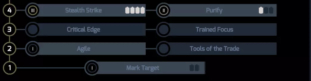 队伍等级5 在这个等级,所有英雄都会习得技能【紧急隐形】。 这是一个能无数次拯救我们的技能。本质上,当我们受到敌人大量伤害(10点伤害)时,会自动立即进入潜行模式。不过这个被动技能有4回合的冷却时间,所以我们不能每回合都滥用它。 队伍等级6 等级6时,我们继续学习以下技能: DD职业 - 投入2点到【敏捷】 支援职业 - 投入2点到【标记目标】 在游戏的这个阶段,很多敌人要么: a) 拥有高额基础闪避; b) 拥有提升闪避的技能。 为了应对这种情况,我们使用【标记目标】卡牌,它能使敌人的任何闪避效果无效。目前几张这样的卡牌就足够了(在达到更高等级前,2张卡牌即可)。队伍等级7 我们深入研究技能,在这个等级我们拥有: 驱逐舰——在【精准瞄准】上投入3个技能点 支援者——在【敏捷】上投入1个技能点,剩余2个技能点可分配给以下技能之一: 【自我净化系统】——非常出色的被动技能,因为它能让支援者每回合清除自身可能存在的任何负面效果。对于喜欢施加【恐惧】或【眩晕】的敌人非常有用——由于支援者总是先手行动(高 initiative),他将有很高的几率(满级时高达95%)摆脱任何负面效果。 【纯粹主义者】——满级时拥有高达60%的几率抵抗任何负面效果。效果与上述【自我净化系统】类似,只是运作方式不同。精准瞄准——我们的辅助首先是追踪者,其次才是辅助,所以他也能造成可观的伤害。我们可以帮他造成更多伤害。 我自己选择了自我净化系统,因为我喜欢在玩辅助英雄时稳妥一些,尽量避免被那些难缠的敌人感染。