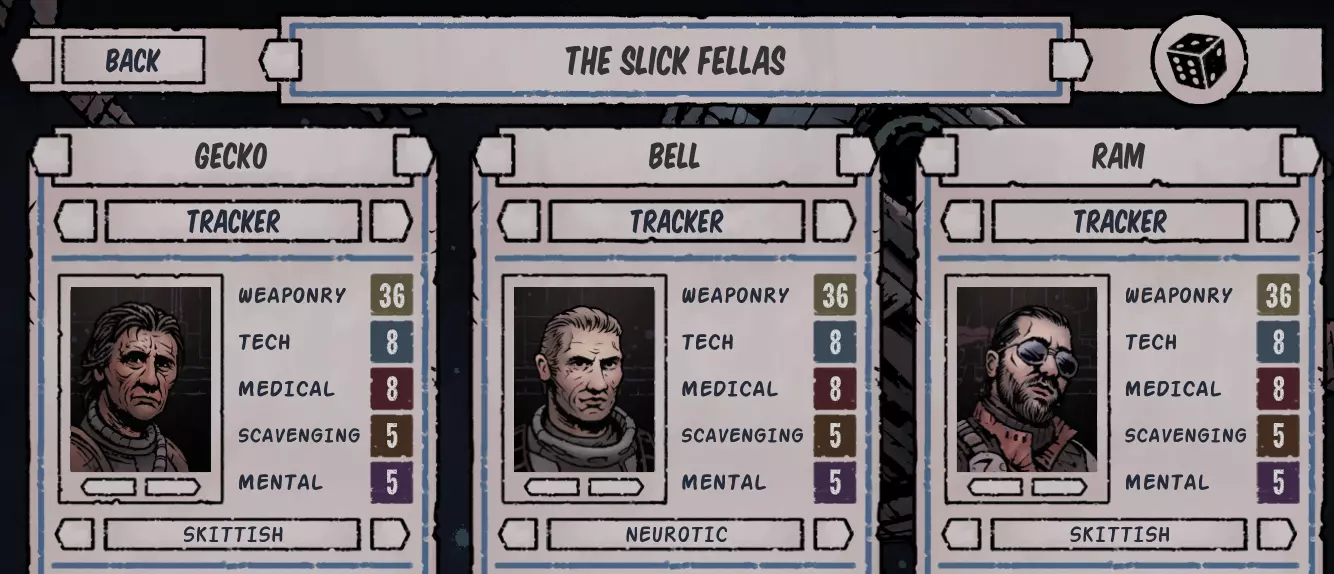 队伍创建 我们已经挑选好了所需的三名追踪者。其中两名将获得“胆怯”被动加成(+5%闪避率)。虽然初期看似效果不显著,但到了游戏中后期,这将成为改变战局的关键(尤其是当闪避率达到50%-60%甚至90%时)。 这两名追踪者将作为我们整个游戏过程中的主要伤害输出者。 剩下未做调整的那名追踪者将获得“神经质”特性(+2 initiative),这样他就能始终先手行动,为我方队伍施加增益效果或对敌人施加减益效果。这名追踪者最终会成为队伍的支援角色,但要注意,他的伤害依然会相当可观。
