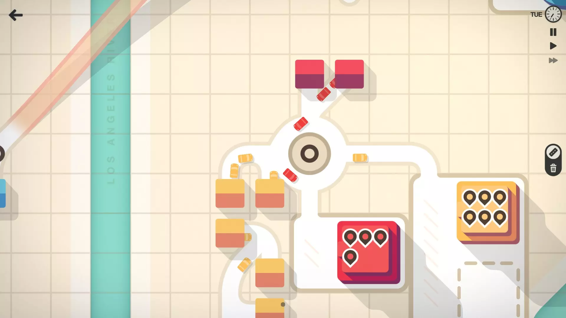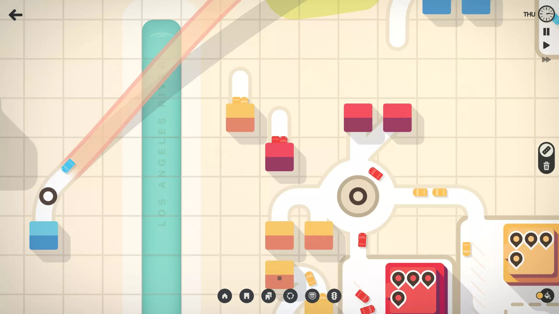 初期用最少的道路将房屋连接到目的地。 避免在早期构建复杂的布局。简单的设计能让交通管理更轻松。 专注于直达路线以减少行驶时间。行驶时间越长,满足需求所需的房屋就越多。 保持颜色区分 目的地和房屋都有颜色编码。尽量让每种颜色的路线保持独立。 为避免交通拥堵,不要在同一条道路上混合不同颜色的路线。这样能更好地分散交通流量。 要分隔不同颜色的路线,可以使用高速公路或环岛等升级设施。