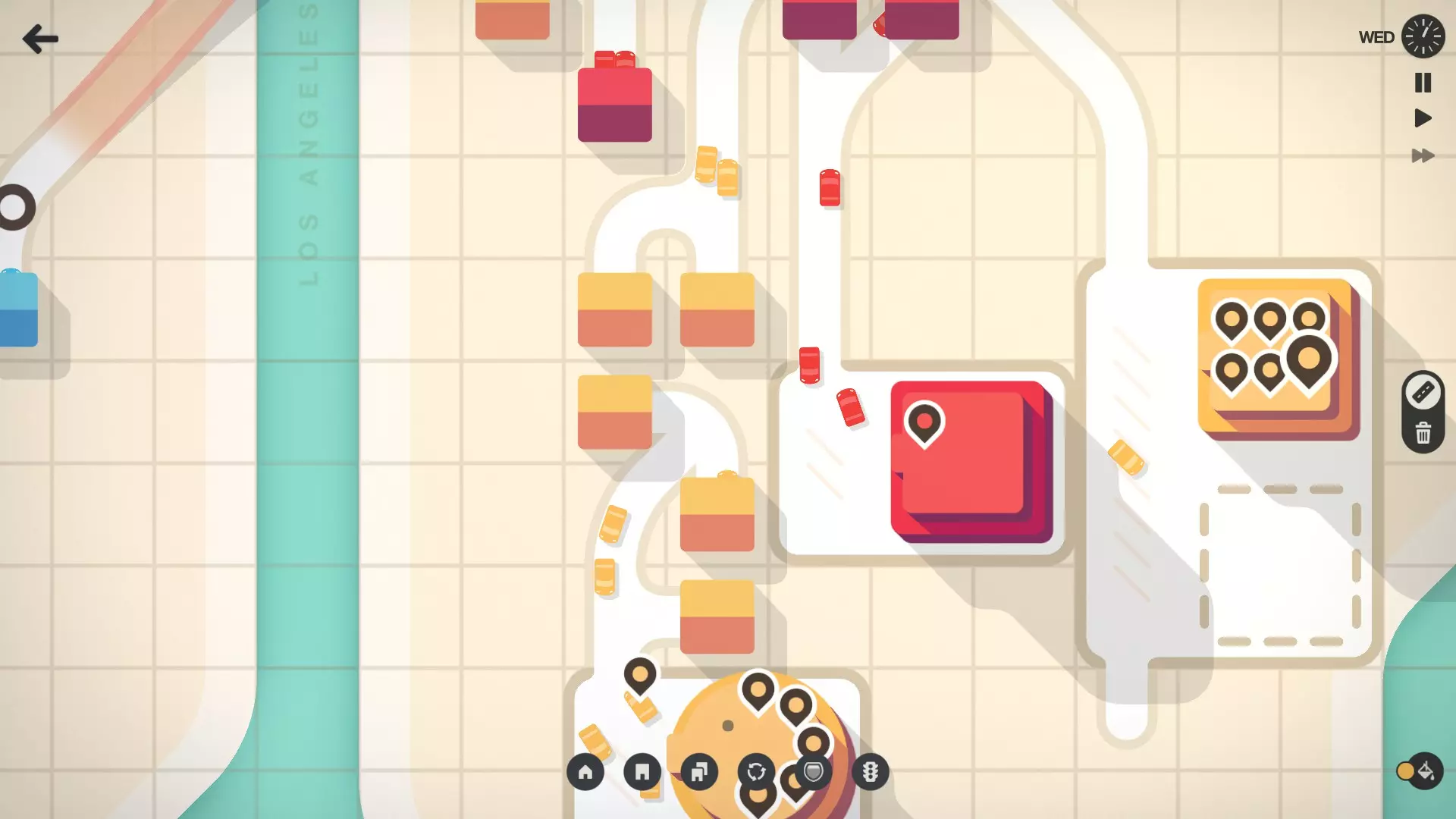 在这类情况下,你可以使用环岛来更好地管理交通。如果使用得当,它们可能会带来【游戏规则改变】般的效果。 减少交叉路口 交通拥堵和减速是由交叉路口引起的。 限制十字交叉路口和T型路口的数量。 为了保持顺畅的交通流,可以使用高速公路或环岛,但尽量保留至少一条高速公路以备紧急情况。(这只是个人偏好,你可以忽略最后这一点)。 提前规划 尝试在交叉路口等繁忙区域附近留出一些额外空间,以便将来添加道路或进行升级。目的地(游戏后期会变成圆形的小方块,也是已连接房屋的车辆前往的地方)需要至少3x2的空 tiles 空间才能生成。因此,为了防止出现无法连接的不必要生成,只需在任何3x2或更大的封闭空间中添加一小块2x1的道路。 选择升级和放置道路时,提前规划你认为城市未来的发展方式。 在城市变得过于拥堵之前,随时可以暂停游戏来重新设计部分城市布局。不过不建议一次性重新设计整个布局,尤其是在游戏后期,因为通常需要一段时间才能收回像桥梁这样的升级成本,而桥梁在重新设计布局时通常是必不可少的。 永远不要耗尽道路 tiles。这些基本上是必不可少的,可能会决定你的游戏成败。如果你用完了道路砖块,尽量选择能提供最多砖块的升级。不过,也有例外情况。 明智选择特殊砖块 如果出现高速公路选项,99%的情况下你都应该选择它,即使它提供的道路砖块更少。在我看来,这是最好的升级,每局游戏最多只能获得九个。高速公路的覆盖范围无限,且建造时不需要消耗道路砖块,还能跨越大部分(如果不是全部的话)障碍物。 其次值得选择的升级是隧道或桥梁,具体取决于你所在的关卡。它们有时可以替代高速公路使用,用于跨越河流或山脉,这同样取决于你所在的地图。在这些之后,次佳的升级选择是环岛。环岛对于管理繁忙的交叉路口,或者当交叉路口有两种不同颜色的道路时非常有用。 目前为止最没用的升级——至少在我看来——是交通信号灯。虽然它并非毫无用处,但确实没那么实用。交通信号灯的工作方式和现实中的一样,通过交替放行不同方向的车辆来管理交通。在紧急情况下,比如你正试图让尽可能多的车辆到达那个可能导致游戏结束的带计时器的大标记点时,交通信号灯表现也不太好,因为它们可能会阻止车辆到达需要去的地方。不过,在没有更好选择的情况下,交通信号灯也有其适用场景。明智使用特殊道路模块 桥梁:建造于水道之上,有时可作为高速公路的替代方案用于短距离连接。 环岛:在拥挤的路口表现出色,能保持交通顺畅运行。 交通信号灯:尽量少用,因为环岛在大多数情况下通常更为高效。 高速公路:是快速长距离路线的理想选择,可避开交通拥堵,也非常适合应对紧急情况。