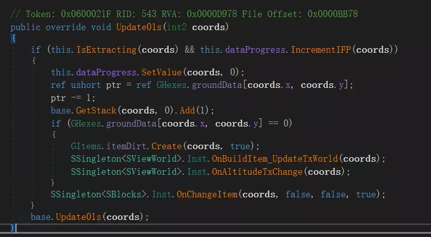 修改完成! 你可以自行修改quantityMax设置的值来改变生成数量。作为参考,当前版本游戏默认值为450。 由于游戏内采用ushort存储矿物,任何试图修改至65536及以上的尝试都会引起(可能存在的)溢出。 如果游戏后续加入新的矿物,需要更改修改列表minerals_list以适配。 Part2 矿机行为修改 注意:本部分笔者将默认你具有一定的计算机基础,会略过许多细节,仅讲述核心思路。如果你遇到了无法解决的问题,建议退回第一种方法。 准备软件 准备一个dotnet逆向工具,笔者在此选择dnSpy,后续步骤也会以本软件为基础。当然,如果你是面包机或者已经机械飞升的种族,你的大脑加上一个十六进制编辑器也是可以的 修改游戏二进制 用dnspy打开【家园:Plan B】【家园:Plan B】_Data Managed Assembly-CSharp.dll 菜单栏 编辑 搜索程序集 搜索CItem_ContentExtractor.Update01s 可以找到一个名为Update01s的函数,内容如图