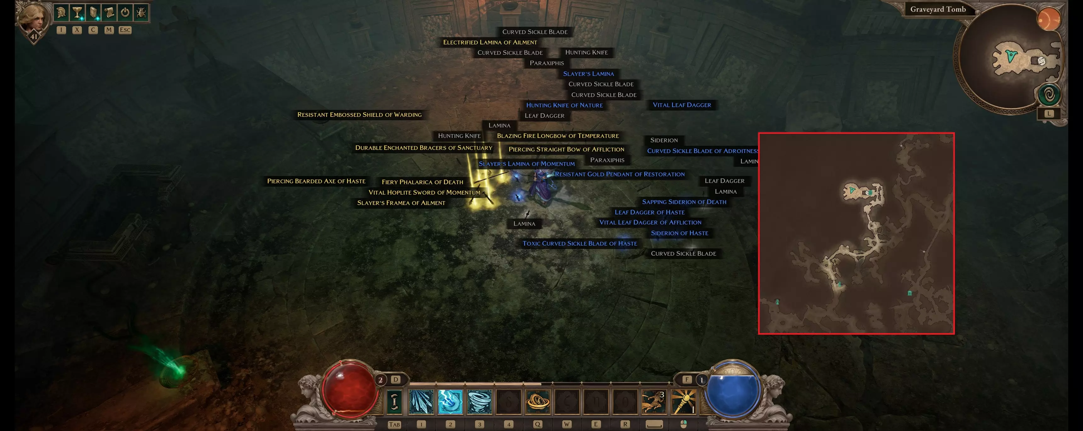 项链:得墨忒尔二元精华(遗物) 提升生命值和生命再生能力可降低你的“脆弱性”,提高生存能力。 其他强力选择: 第三个遗物:我选择了赫尔墨斯之履(用于提升移动速度) 坚硬甲壳:提升护甲和生命值 抗性 技能循环 如前所述,技能循环极其简单直接: 1. 确保已激活风暴环云 2. 保持气旋持续生效并 spam 冰碎片。 farming 方法 首先,你应该放松下来,给自己泡一杯温暖的好茶,享受游戏剧情。完成剧情后,如果你想升级并获取一些好装备,我推荐 farming 阿里斯多门尼斯。 阿里斯多门尼斯可以在第一章的墓地陵墓中找到。阿里斯托梅尼斯是个绝佳的刷怪点,原因如下: 他移动速度极慢,很容易风筝。 他的技能数量很少,攻击模式也非常容易预判,真正有威胁的只有熔岩喷发(小范围圆形区域),但也能轻松躲避。 他会召唤大量骷髅,因此能获得大量经验值。 如前所述,我在开启+5敌人等级的情况下也能轻松farm他。由于骷髅提供的经验值非常可观,即便是40级以上,每击杀他一次也能升一级。