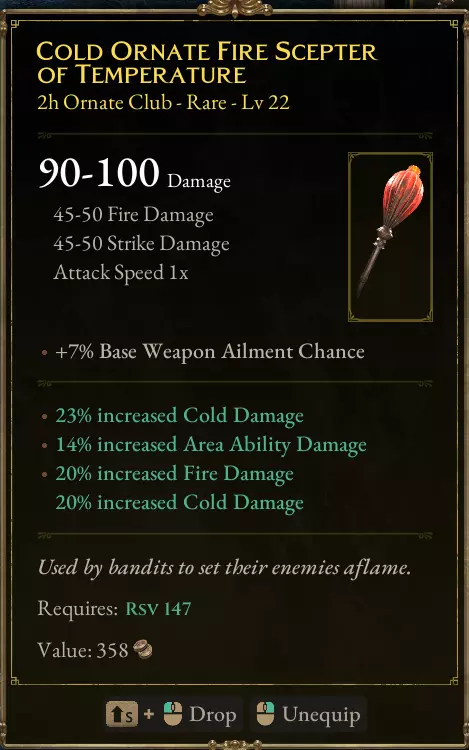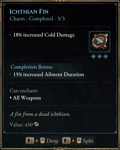 武器:鱼人鳍(护符) 18%的冰冷伤害加成非常出色,我确信这是该部位的最佳选择。 值得注意的是:鱼人护符比塔尔塔洛斯之寒精华遗物更好(!)(18%对15%的冰冷伤害加成)。塔尔塔洛斯提供武器冰冷伤害,而这对该流派来说并非必需。
