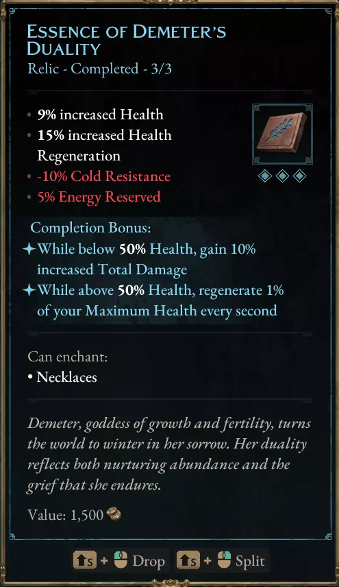 尽管这把武器的伤害较低,但我一直用到40多级还在用这把22级的法杖。【+43%冰冷伤害】基本上就是你所需要的全部了。 遗物与护符 我仍在尝试新的遗物和护符。我不会在这里列出每一个遗物和护符,只分享我目前认为“非常好”或“必备”的选择。 按对该build的重要性排序: