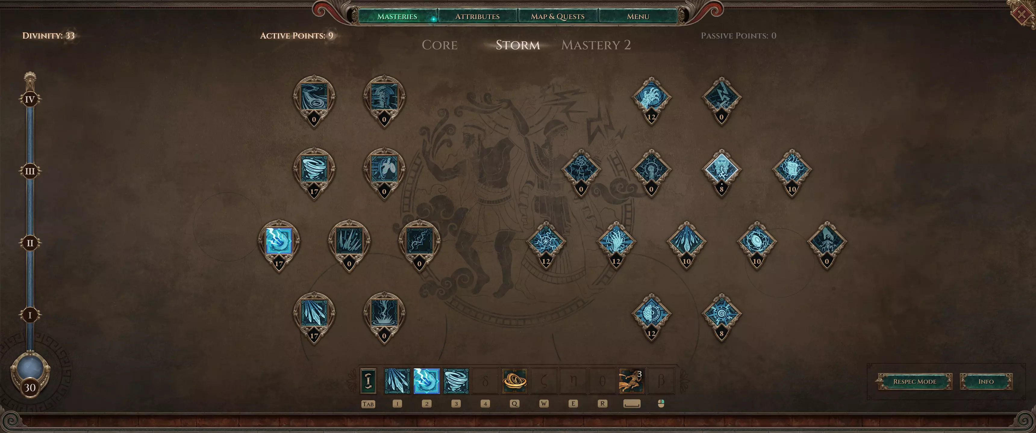 现在你可以为风暴调和投入点数,这将进一步提升你的整体伤害。 推荐属性: 法术伤害 投射物伤害 之后,你可以随意将剩余的被动点数投入到提升冰冷伤害或法术伤害的技能中。 如果你已将上述3个主动技能全部点满,可以将所有剩余点数投入核心(闪避和屏障)。 作为参考,这是我45级时的技能配置: