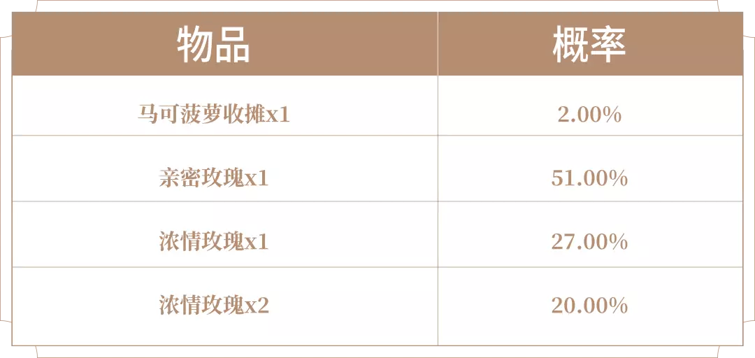 购买红蓝对决(1日),可额外获赠一个礼包,打开后可随机获得以下之一:马可菠萝收摊x1、亲密玫瑰x1、浓情玫瑰x1、浓情玫瑰x2。累计20次至少可获得马可菠萝收摊x1
