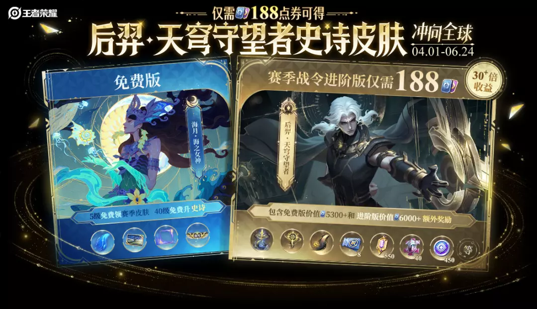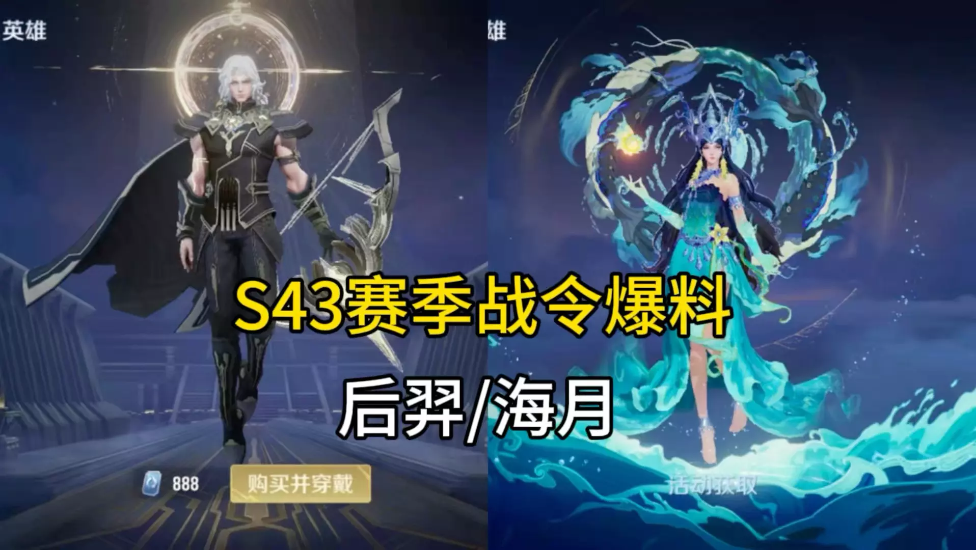 海月-海之女神】S43赛季战令免费版获取,并且可免费提升至史诗品级;【后羿-天穹守望者】S43赛季战令进阶版获取,进阶战令仅188点券