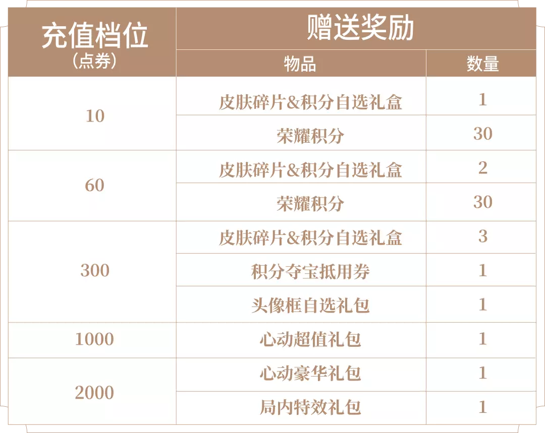 ❖皮肤碎片&积分自选礼盒:打开礼包可任意选择以下奖励之一:荣耀积分*10或皮肤碎片*1