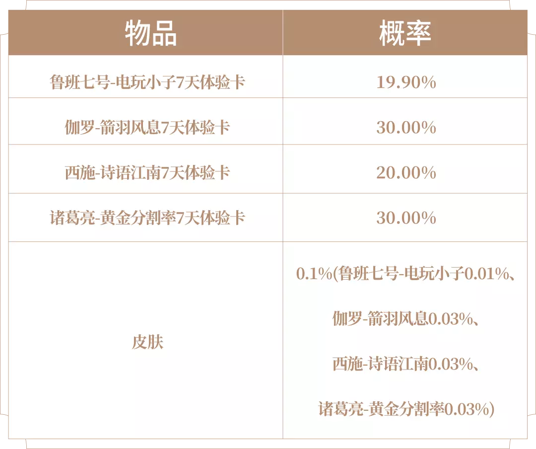 打开后必得皮肤碎片x2、铭文碎片x100和以下随机奖励之一:皮肤或皮肤体验卡(7日)1张(鲁班七号-电玩小子、伽罗-箭羽风息、西施-诗语江南、诸葛亮-黄金分割率)