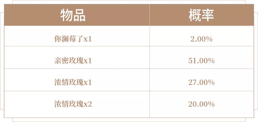 购买红蓝对决(1日),可额外获赠一个礼包,打开后可随机获得以下之一:你澜莓了x1、亲密玫瑰x1、浓情玫瑰x1、浓情玫瑰x2。累计20次至少可获得你澜莓了x1。