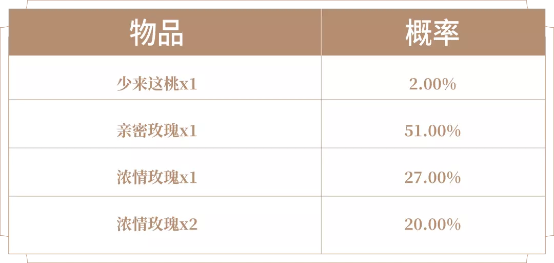购买红蓝对决(1日),可额外获赠一个礼包,打开后可随机获得以下之一:少来这桃x1、亲密玫瑰x1、浓情玫瑰x1、浓情玫瑰x2。累计20次至少可获得少来这桃x1。