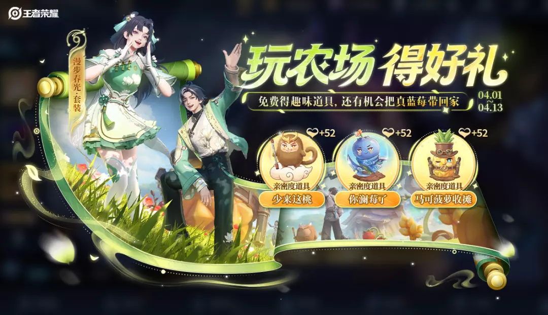 参与“玩农场得好礼”活动,完成登录、农场相关任务可获得积分,消耗积分可兑换【次元套装-漫步春光】、【亲密度道具-你澜莓了】、【亲密度道具-少来这桃】、【亲密度道具-马可菠萝收摊】等惊喜好礼。累计活动积分可获得【头像框-顶级农民】,还有机会把真蓝莓带回家!