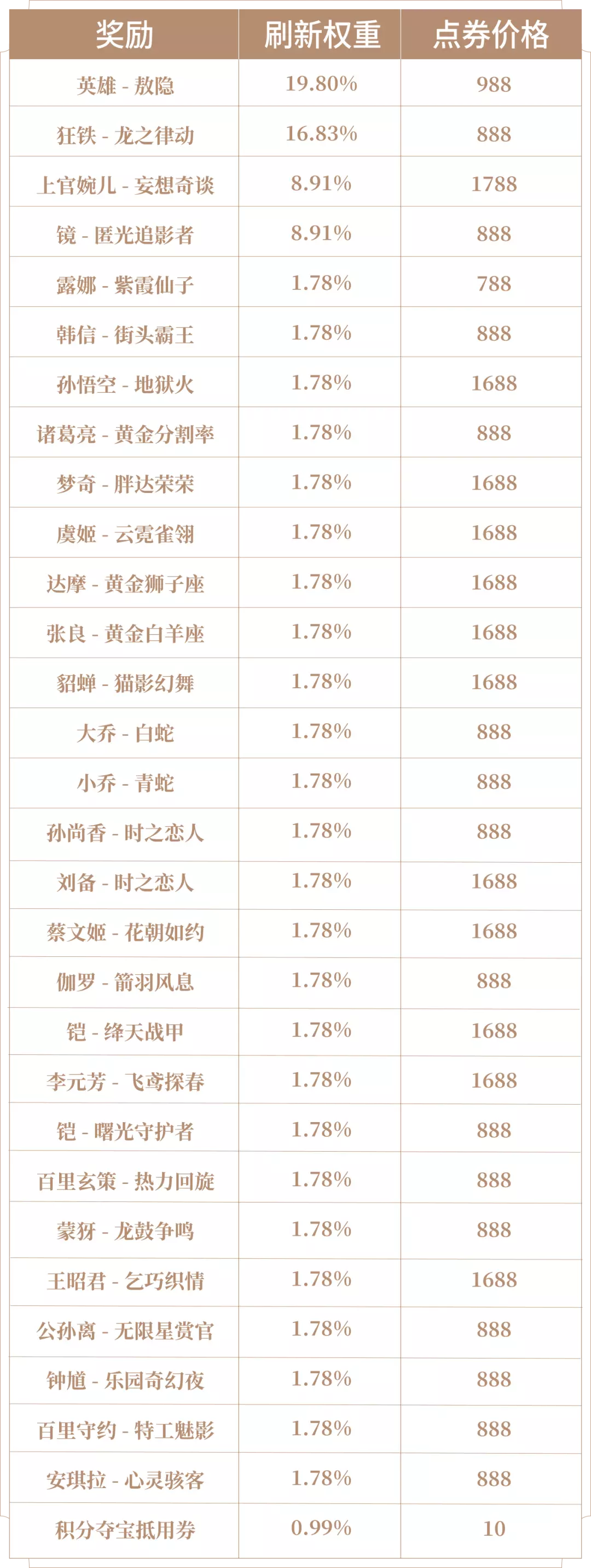 本次更新了2款限定返场皮肤:上官婉儿-妄想奇谈(传说)、镜-匿光追影者(史诗);刷新概率、折扣概率均保持不变,惊喜折扣奖池详情: