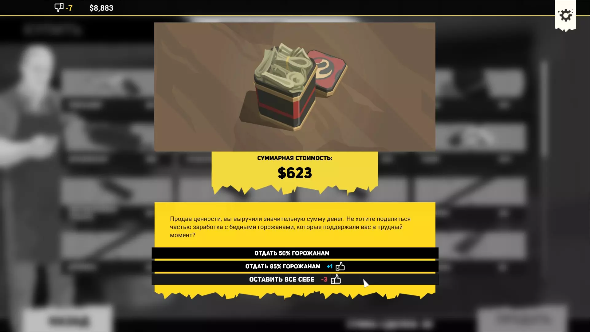 3. 将压缩包内容放入文件夹,替换现有的Save文件(或者先备份你的存档) 4. 启动游戏 获取成就 1. 进入游戏后,点击继续 2. 进入装备购买界面,至少卖出价值500美元的物品。之后会出现是否将部分收入分给市民的选项,选择全部留给自己。