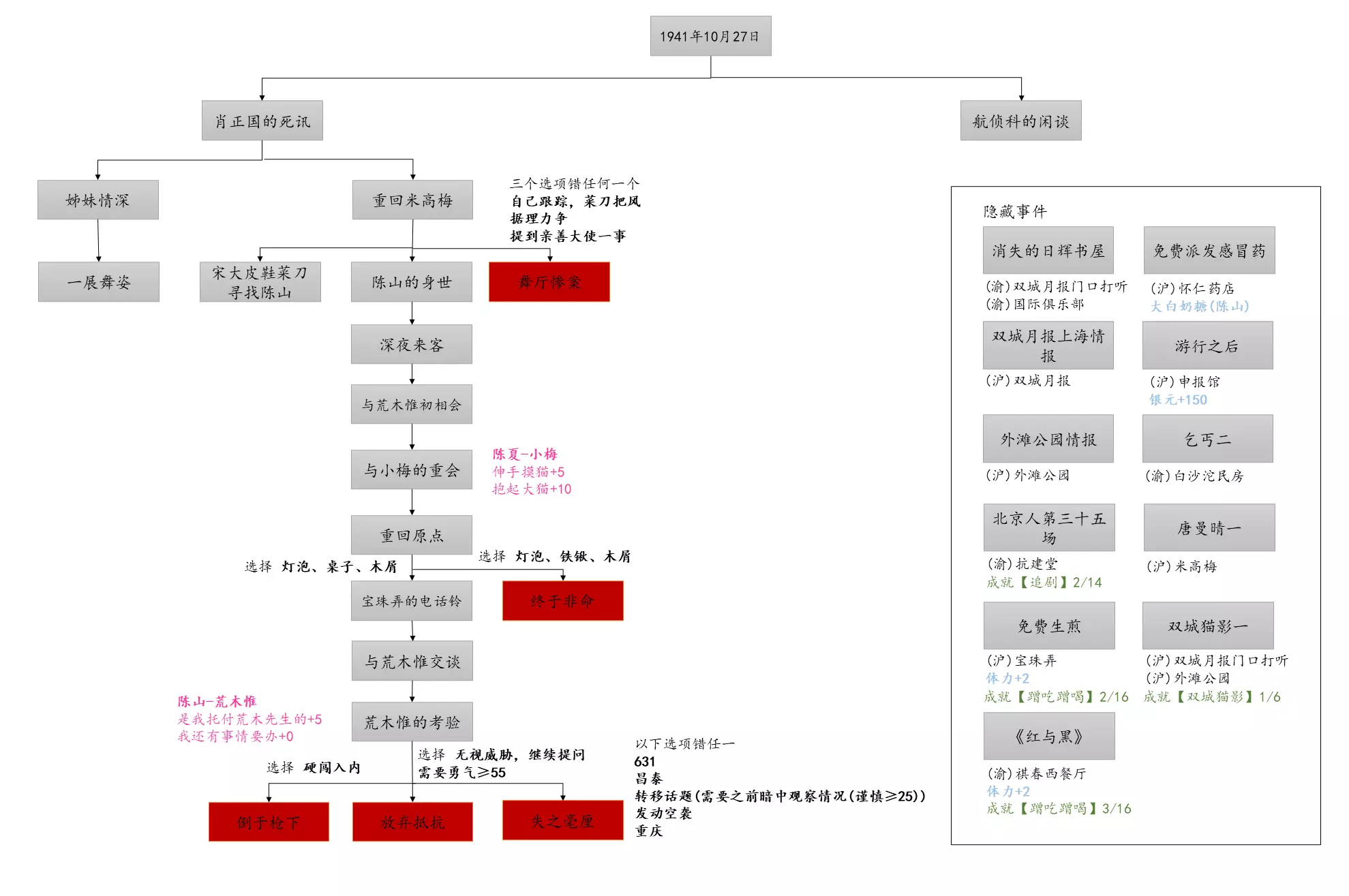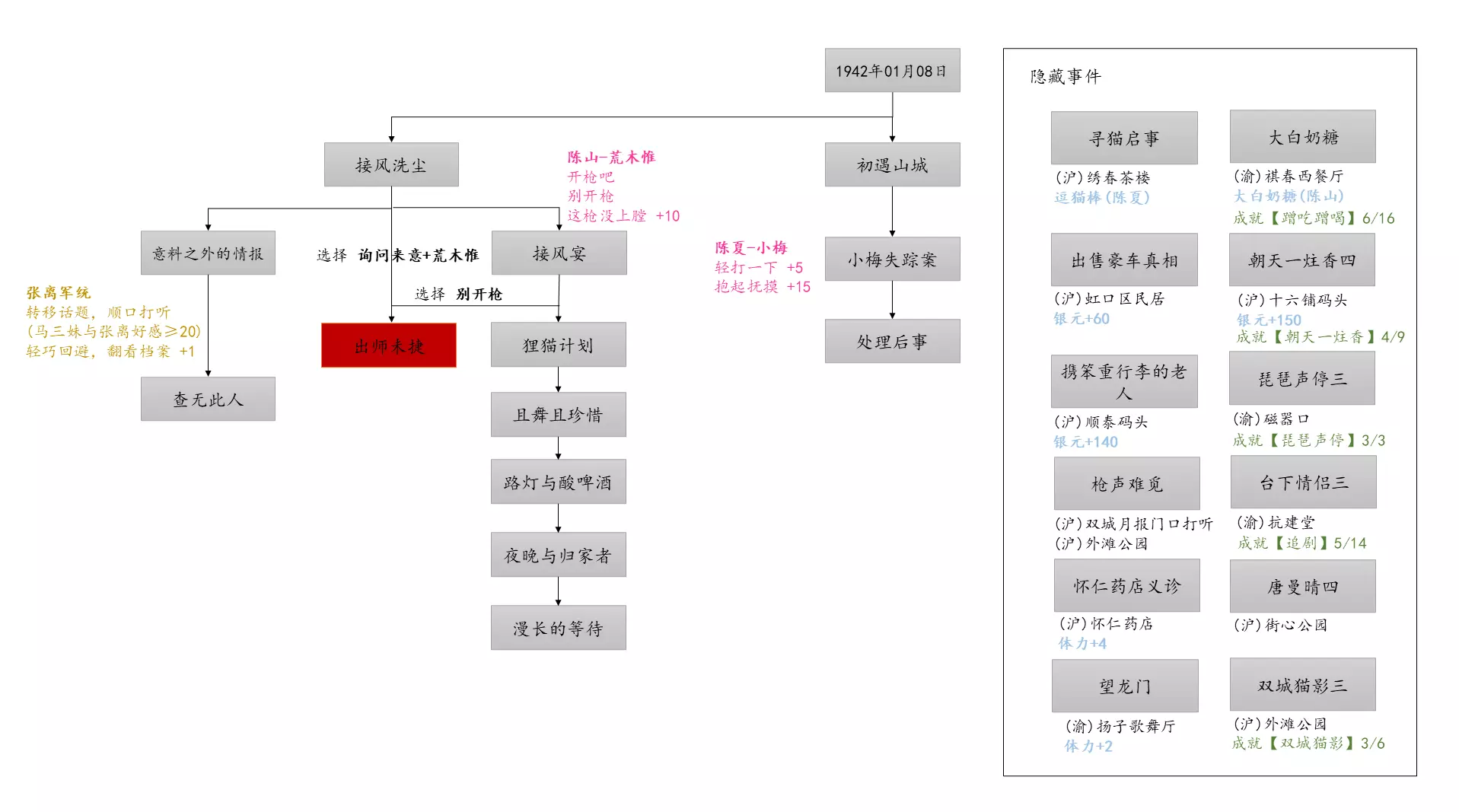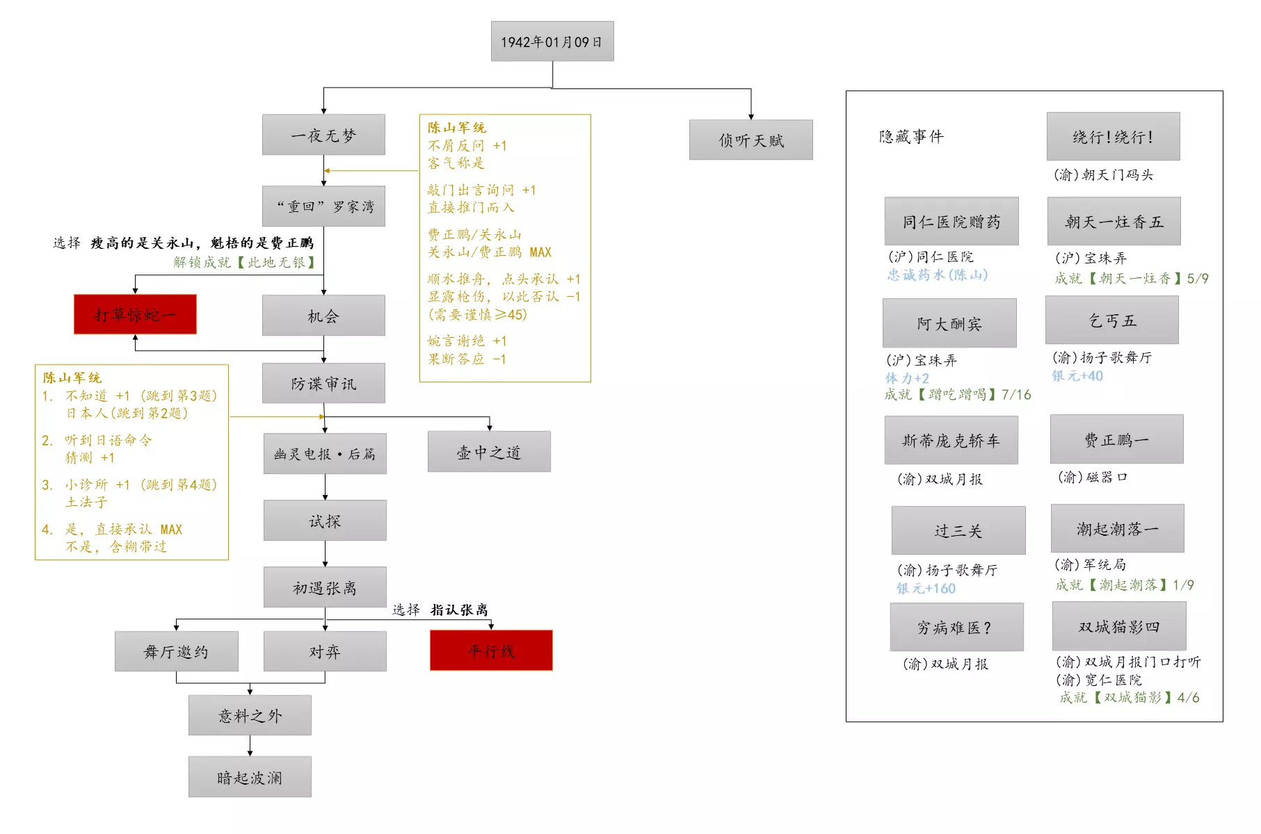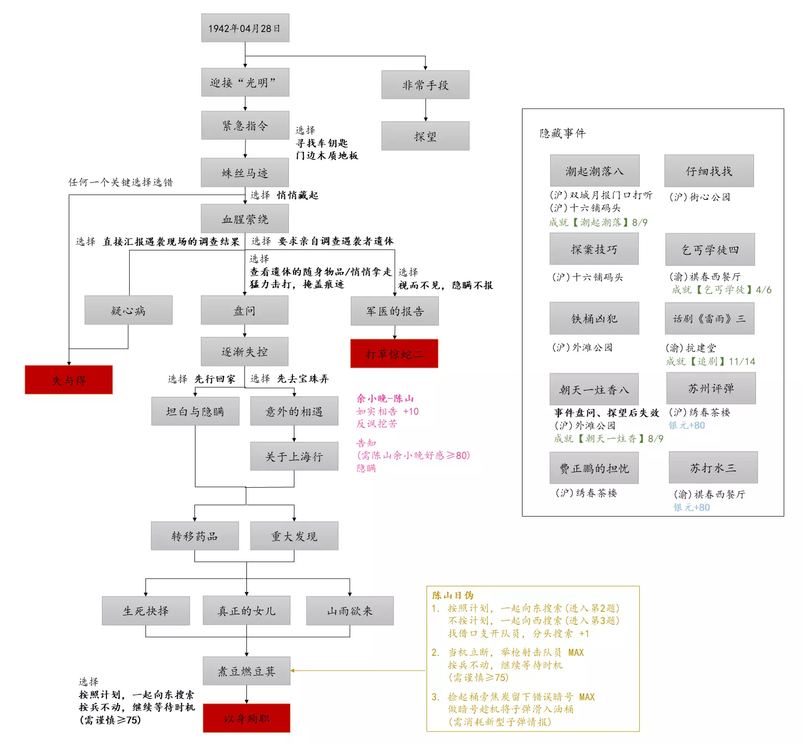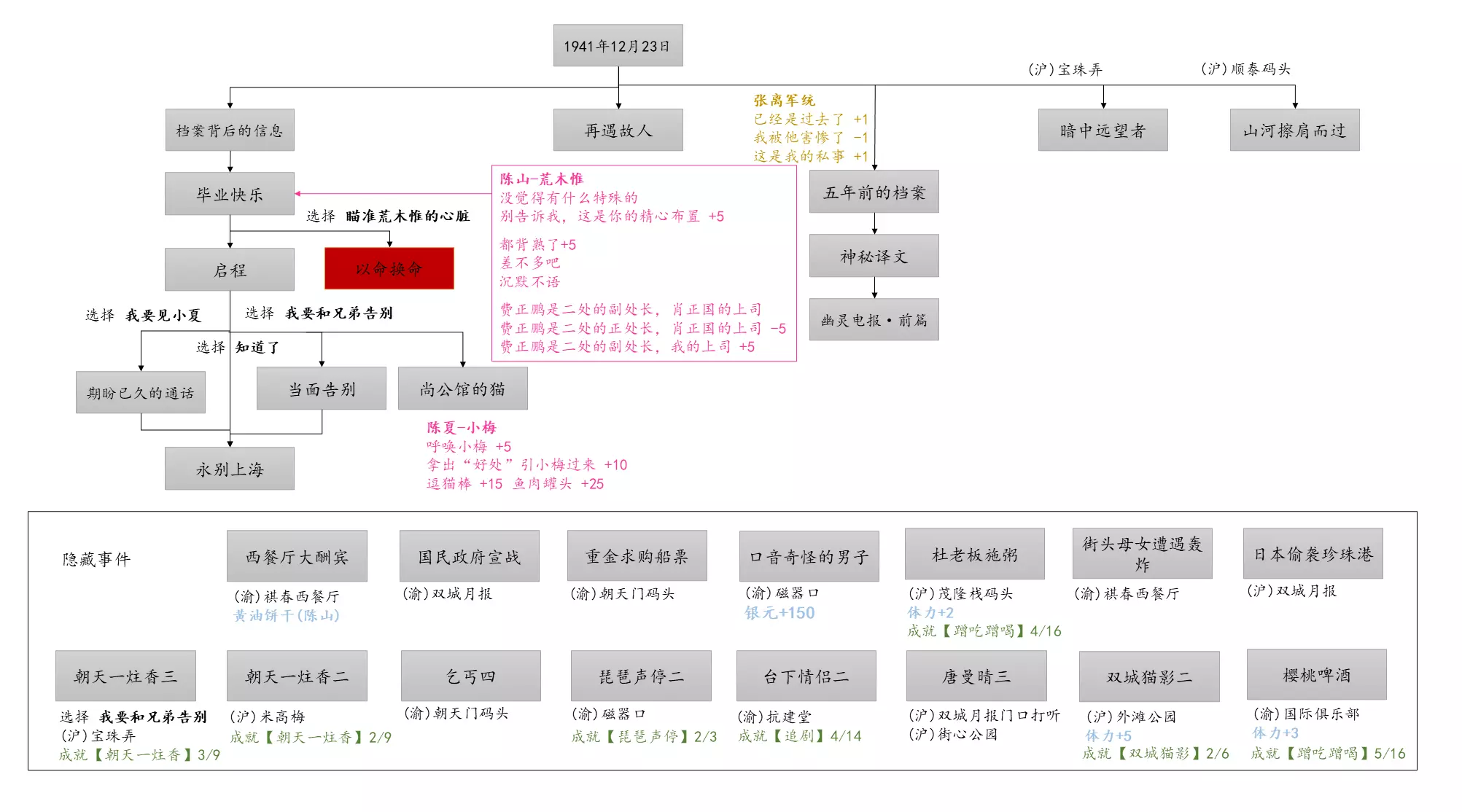 谢绝搬运。请尊重他人劳动成果! 本指南内含大量剧透!部分成就的达成方式如有错误,可随时指正我! 写在前面 本指南已按照时间(月份)分类,可直接通过右侧导航栏查找。 流程图只标注影响结局/成就的关键选项,因为绝大多数属性要求可通过购买道具达成,因此未在图中标注。 陈山-荒木惟,陈山-唐曼晴的好感度直接影响结局 陈山-荒木惟≥20,陈山-唐曼晴≥40 ,因此也在图中详细标注。 新新百货的商品每日日间更新,所以以防关键时刻买不到道具,最好提前备货!银元的获取可以通过隐藏事件奖励和地图上的墓碑。左侧【记事】选项卡把绿灯关了,选显示的摩斯密码获得成就【意外之财】和100银元。 相对重要的道具: 陈山:勇气、谨慎、忠诚 张离:勇气、智谋 陈夏:勇气 余小晚:勇气 好感度:陈山-余小晚,陈山-张离 综上所述勇气是最重要的,每个人都需要,此外张离的智谋以及陈山的谨慎会决定剧情能否继续推进(具体的检定要求见附录表2)。而完全没用的道具:余小晚:魅力。主包误以为这是非常有用的属性,于是大量囤积。 四个终篇结局的达成条件: 张离选择救陈山或余小晚,陈夏小梅好感度≥100(可获得成就【小梅喜欢的人】),千田英子好感度(根据评论区玩家反馈),是否获得成就【朝天一炷香】(根据评论区玩家反馈)。 基本上通关主线和所有隐藏事件可解锁所有成就,【八卦狂】和【生煎爱好者】需要另外注意。每天购买生煎的次数有上限,只打听隐藏事件必须的小道消息无法达到20条的要求! 1941年10月