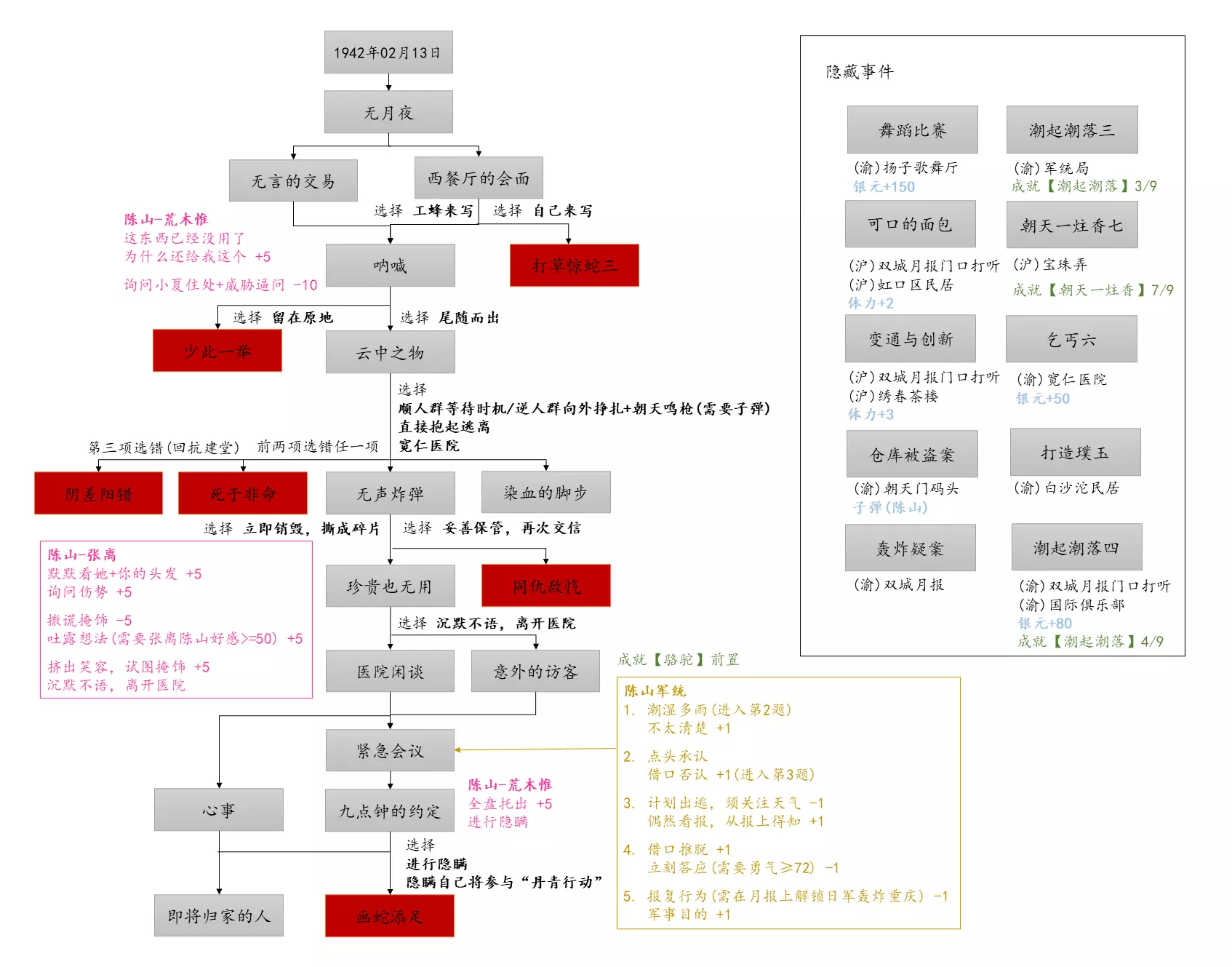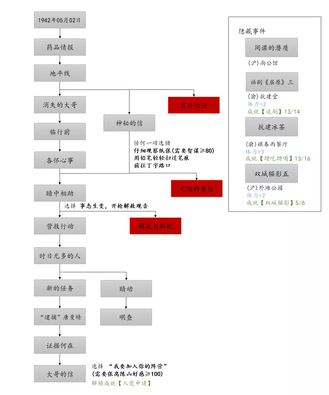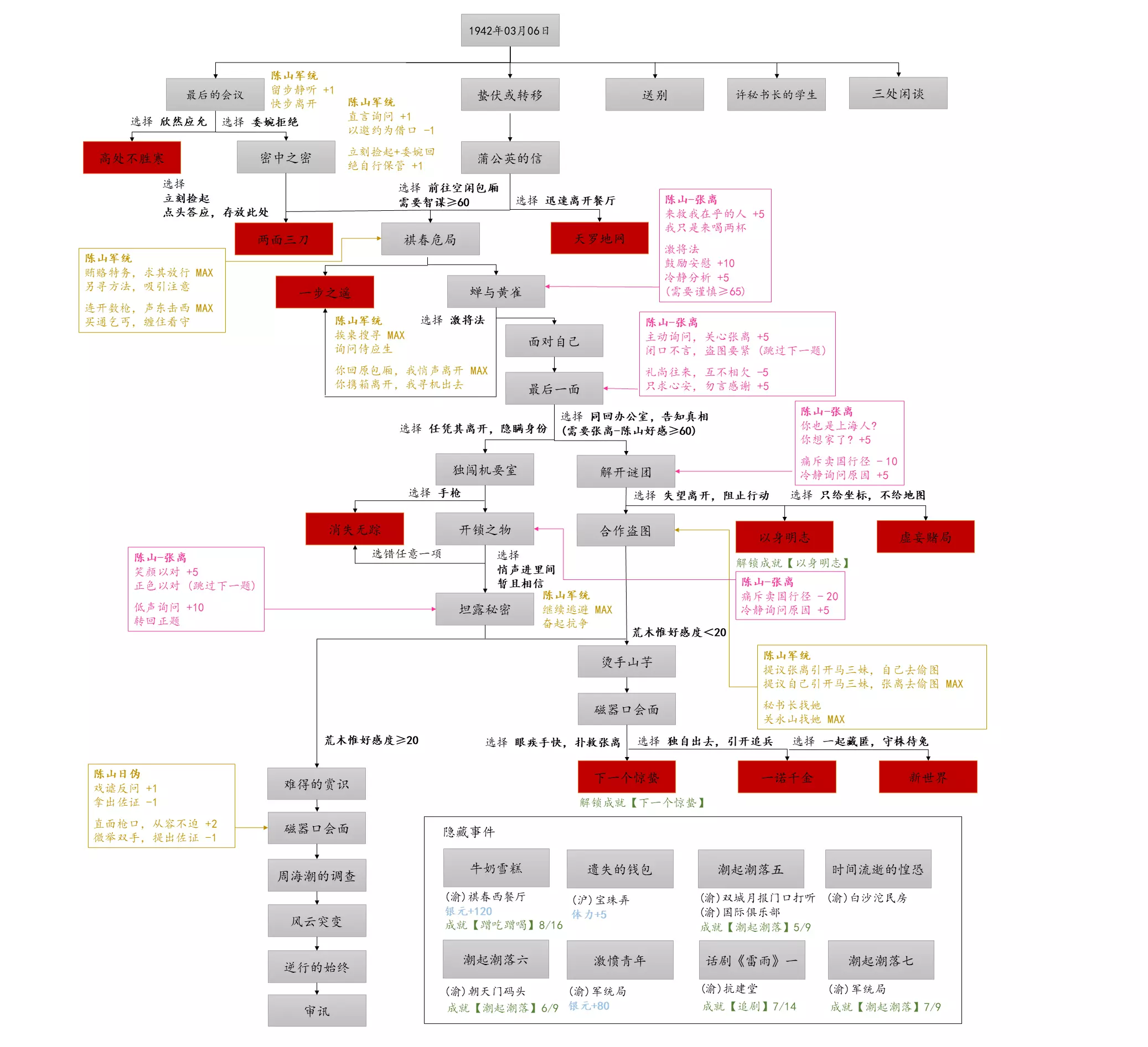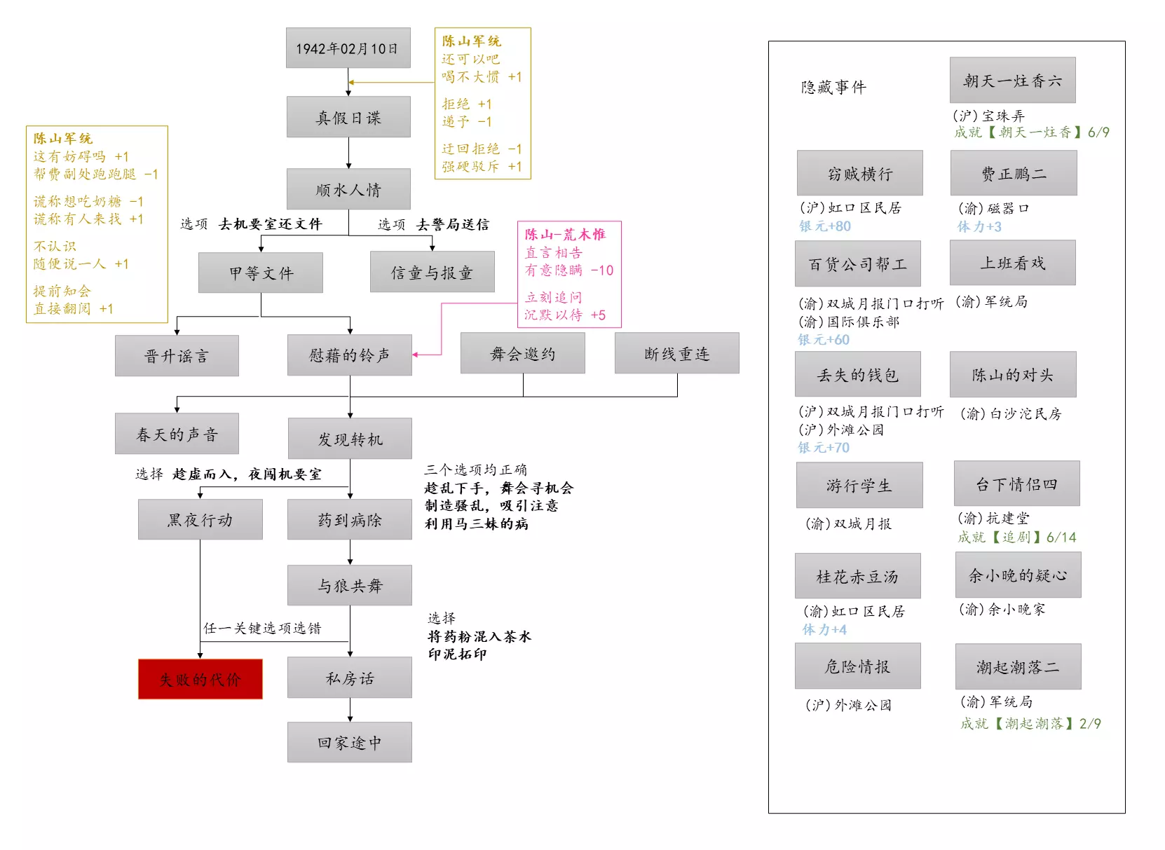 谢绝搬运。请尊重他人劳动成果! 本指南内含大量剧透!部分成就的达成方式如有错误,可随时指正我! 写在前面 本指南已按照时间(月份)分类,可直接通过右侧导航栏查找。 流程图只标注影响结局/成就的关键选项,因为绝大多数属性要求可通过购买道具达成,因此未在图中标注。 陈山-荒木惟,陈山-唐曼晴的好感度直接影响结局 陈山-荒木惟≥20,陈山-唐曼晴≥40 ,因此也在图中详细标注。 新新百货的商品每日日间更新,所以以防关键时刻买不到道具,最好提前备货!银元的获取可以通过隐藏事件奖励和地图上的墓碑。左侧【记事】选项卡把绿灯关了,选显示的摩斯密码获得成就【意外之财】和100银元。 相对重要的道具: 陈山:勇气、谨慎、忠诚 张离:勇气、智谋 陈夏:勇气 余小晚:勇气 好感度:陈山-余小晚,陈山-张离 综上所述勇气是最重要的,每个人都需要,此外张离的智谋以及陈山的谨慎会决定剧情能否继续推进(具体的检定要求见附录表2)。而完全没用的道具:余小晚:魅力。主包误以为这是非常有用的属性,于是大量囤积。 四个终篇结局的达成条件: 张离选择救陈山或余小晚,陈夏小梅好感度≥100(可获得成就【小梅喜欢的人】),千田英子好感度(根据评论区玩家反馈),是否获得成就【朝天一炷香】(根据评论区玩家反馈)。 基本上通关主线和所有隐藏事件可解锁所有成就,【八卦狂】和【生煎爱好者】需要另外注意。每天购买生煎的次数有上限,只打听隐藏事件必须的小道消息无法达到20条的要求! 1941年10月