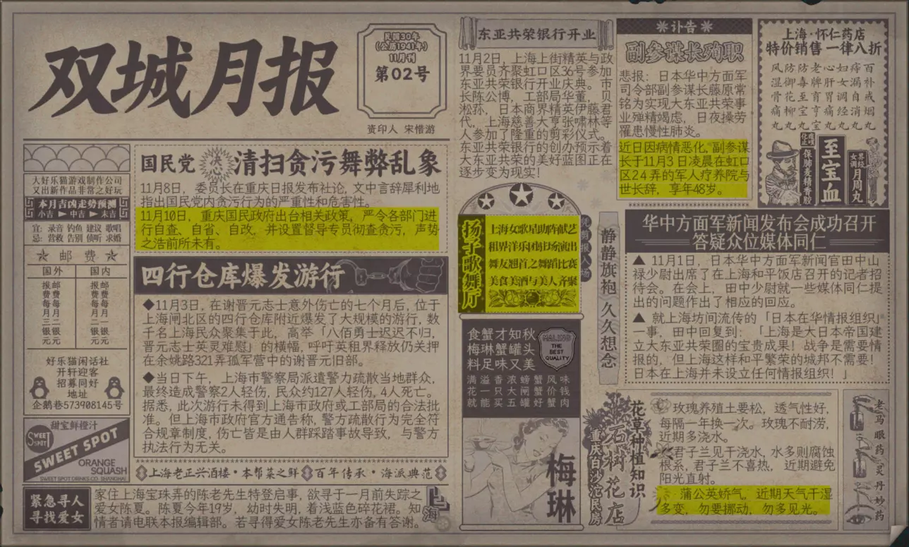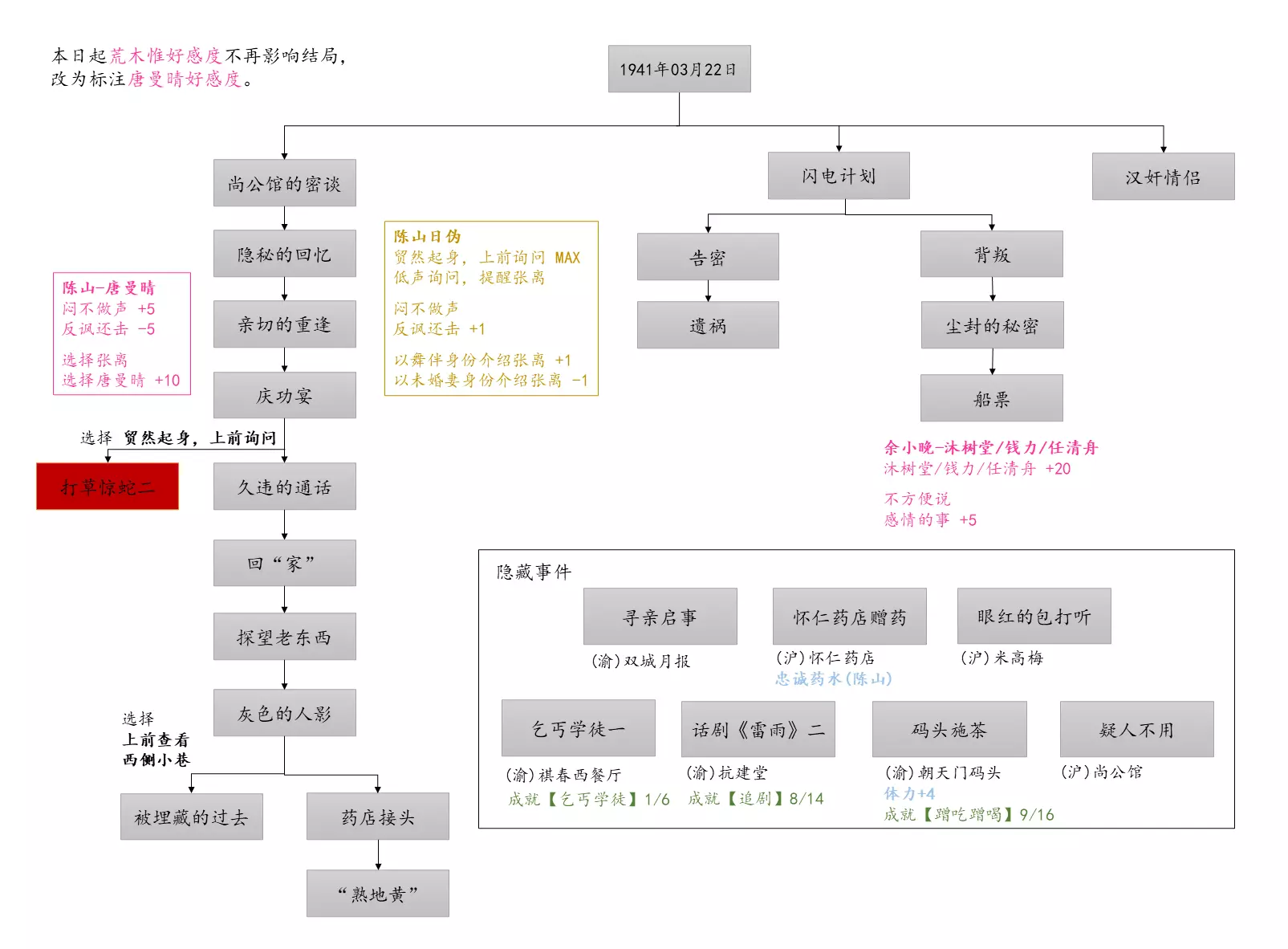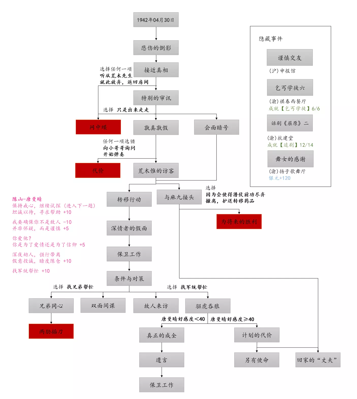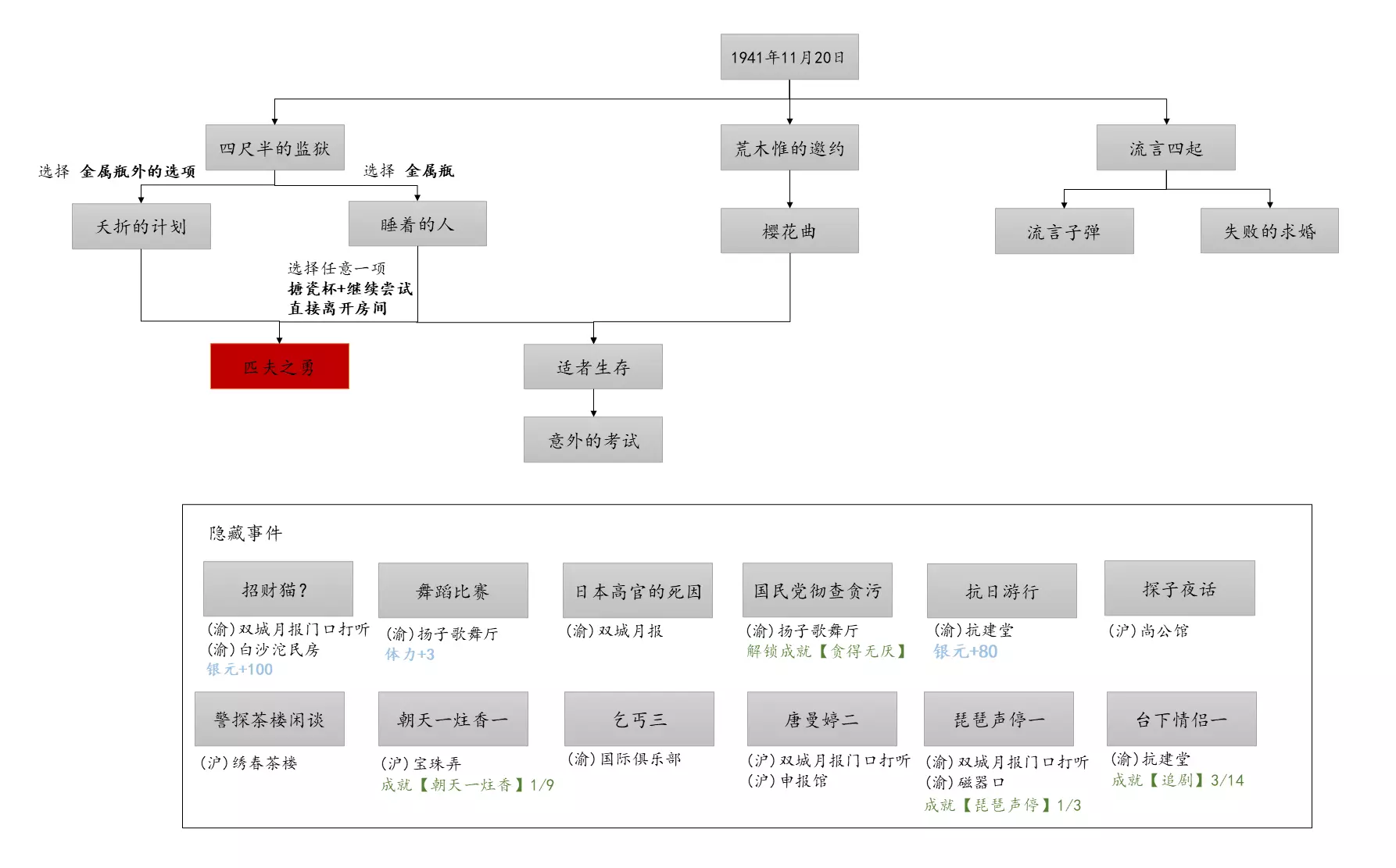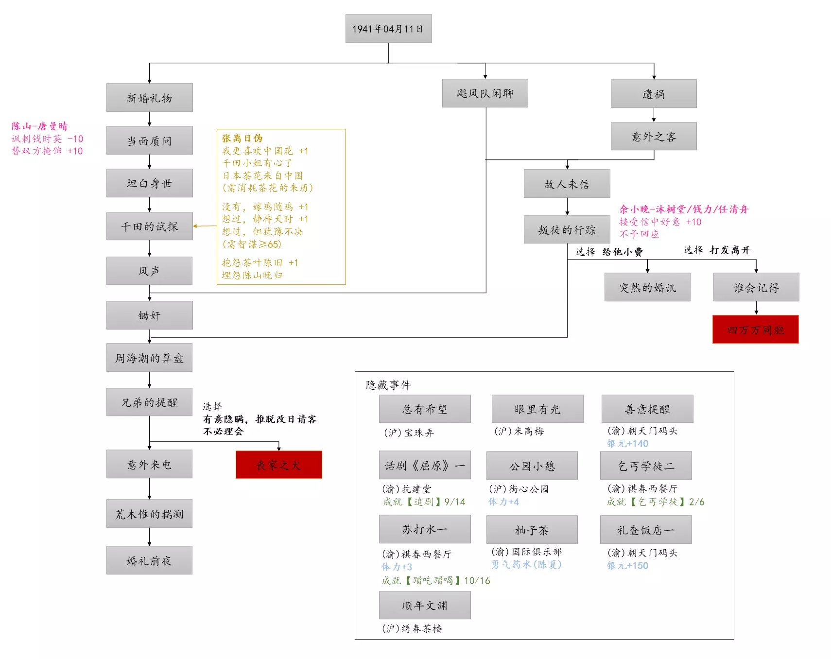 谢绝搬运。请尊重他人劳动成果! 本指南内含大量剧透!部分成就的达成方式如有错误,可随时指正我! 写在前面 本指南已按照时间(月份)分类,可直接通过右侧导航栏查找。 流程图只标注影响结局/成就的关键选项,因为绝大多数属性要求可通过购买道具达成,因此未在图中标注。 陈山-荒木惟,陈山-唐曼晴的好感度直接影响结局 陈山-荒木惟≥20,陈山-唐曼晴≥40 ,因此也在图中详细标注。 新新百货的商品每日日间更新,所以以防关键时刻买不到道具,最好提前备货!银元的获取可以通过隐藏事件奖励和地图上的墓碑。左侧【记事】选项卡把绿灯关了,选显示的摩斯密码获得成就【意外之财】和100银元。 相对重要的道具: 陈山:勇气、谨慎、忠诚 张离:勇气、智谋 陈夏:勇气 余小晚:勇气 好感度:陈山-余小晚,陈山-张离 综上所述勇气是最重要的,每个人都需要,此外张离的智谋以及陈山的谨慎会决定剧情能否继续推进(具体的检定要求见附录表2)。而完全没用的道具:余小晚:魅力。主包误以为这是非常有用的属性,于是大量囤积。 四个终篇结局的达成条件: 张离选择救陈山或余小晚,陈夏小梅好感度≥100(可获得成就【小梅喜欢的人】),千田英子好感度(根据评论区玩家反馈),是否获得成就【朝天一炷香】(根据评论区玩家反馈)。 基本上通关主线和所有隐藏事件可解锁所有成就,【八卦狂】和【生煎爱好者】需要另外注意。每天购买生煎的次数有上限,只打听隐藏事件必须的小道消息无法达到20条的要求! 1941年10月