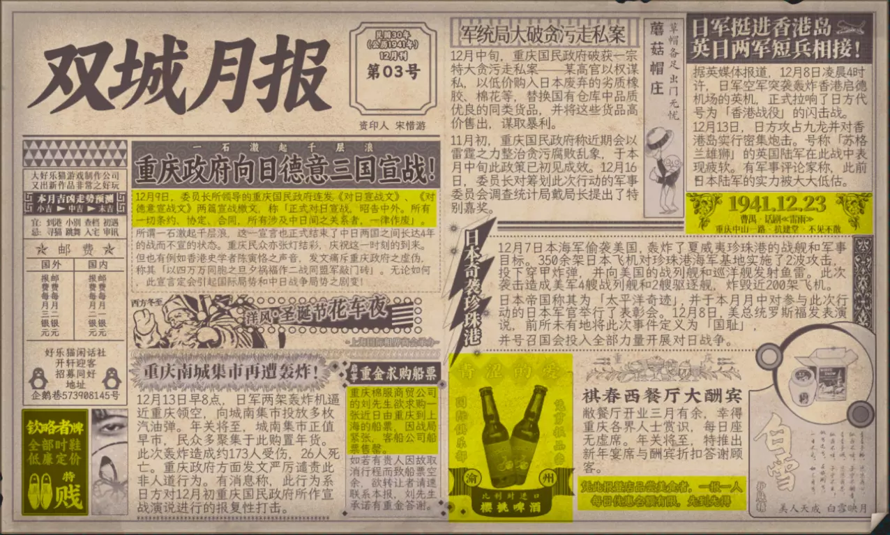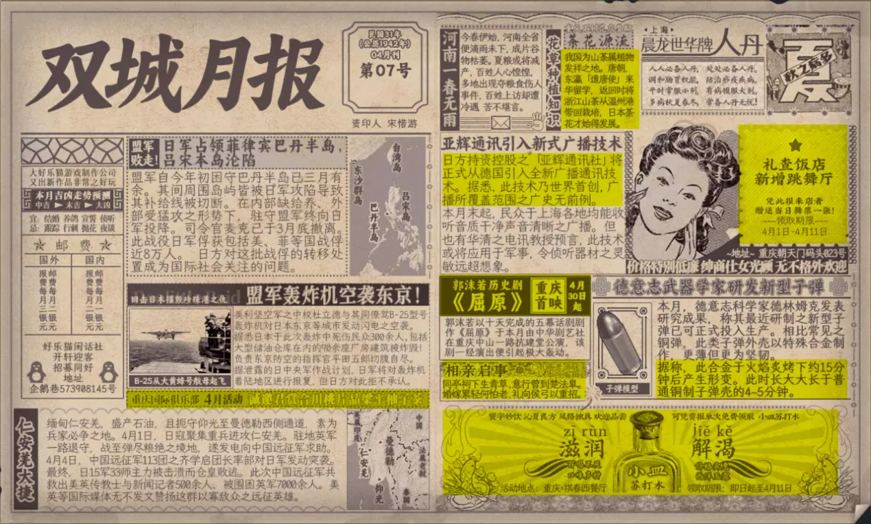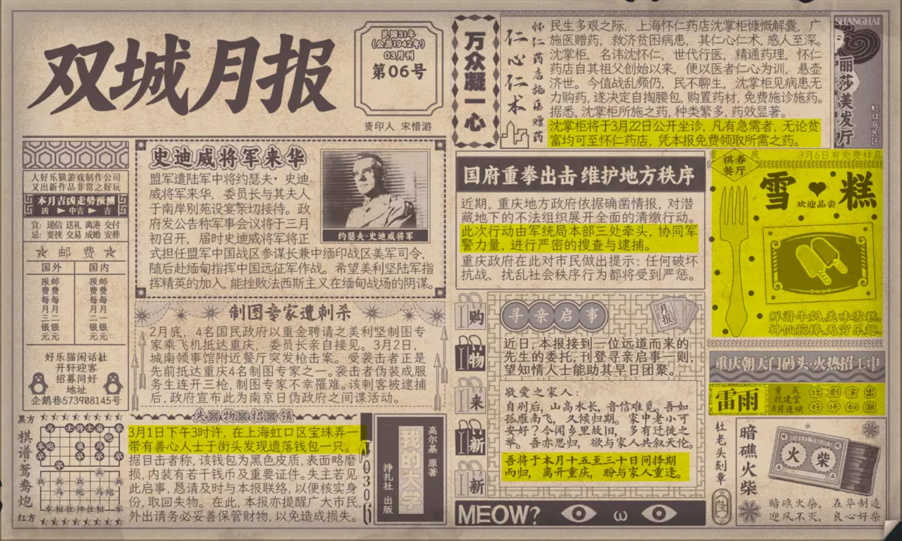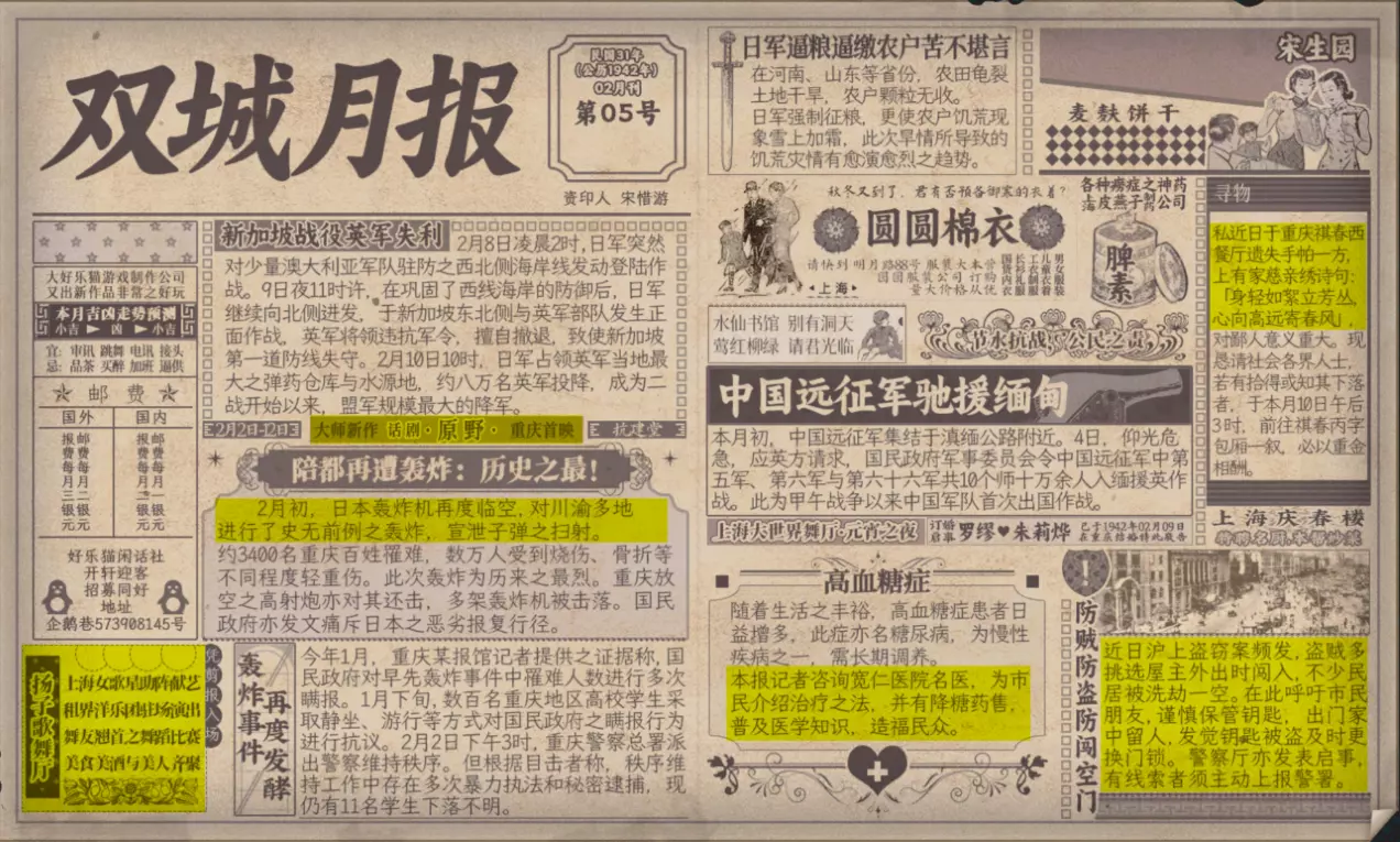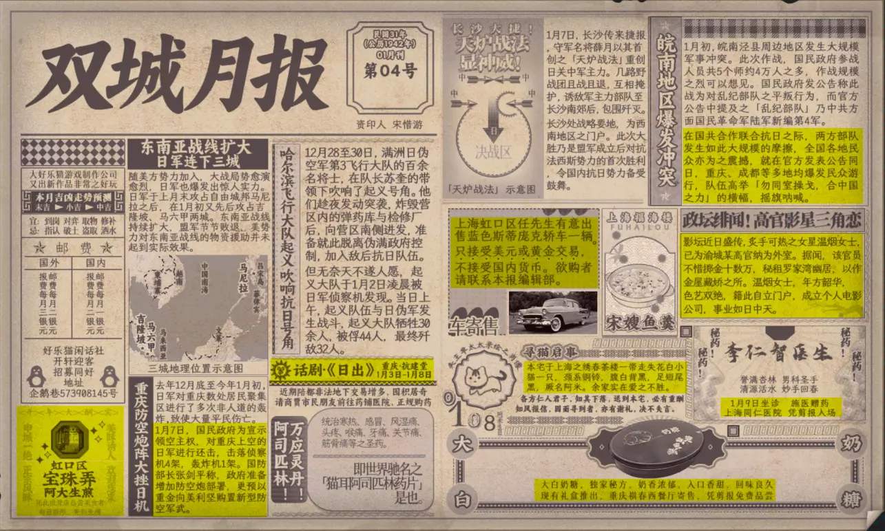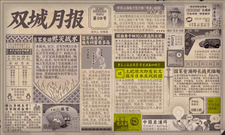 谢绝搬运。请尊重他人劳动成果! 本指南内含大量剧透!部分成就的达成方式如有错误,可随时指正我! 写在前面 本指南已按照时间(月份)分类,可直接通过右侧导航栏查找。 流程图只标注影响结局/成就的关键选项,因为绝大多数属性要求可通过购买道具达成,因此未在图中标注。 陈山-荒木惟,陈山-唐曼晴的好感度直接影响结局 陈山-荒木惟≥20,陈山-唐曼晴≥40 ,因此也在图中详细标注。 新新百货的商品每日日间更新,所以以防关键时刻买不到道具,最好提前备货!银元的获取可以通过隐藏事件奖励和地图上的墓碑。左侧【记事】选项卡把绿灯关了,选显示的摩斯密码获得成就【意外之财】和100银元。 相对重要的道具: 陈山:勇气、谨慎、忠诚 张离:勇气、智谋 陈夏:勇气 余小晚:勇气 好感度:陈山-余小晚,陈山-张离 综上所述勇气是最重要的,每个人都需要,此外张离的智谋以及陈山的谨慎会决定剧情能否继续推进(具体的检定要求见附录表2)。而完全没用的道具:余小晚:魅力。主包误以为这是非常有用的属性,于是大量囤积。 四个终篇结局的达成条件: 张离选择救陈山或余小晚,陈夏小梅好感度≥100(可获得成就【小梅喜欢的人】),千田英子好感度(根据评论区玩家反馈),是否获得成就【朝天一炷香】(根据评论区玩家反馈)。 基本上通关主线和所有隐藏事件可解锁所有成就,【八卦狂】和【生煎爱好者】需要另外注意。每天购买生煎的次数有上限,只打听隐藏事件必须的小道消息无法达到20条的要求! 1941年10月