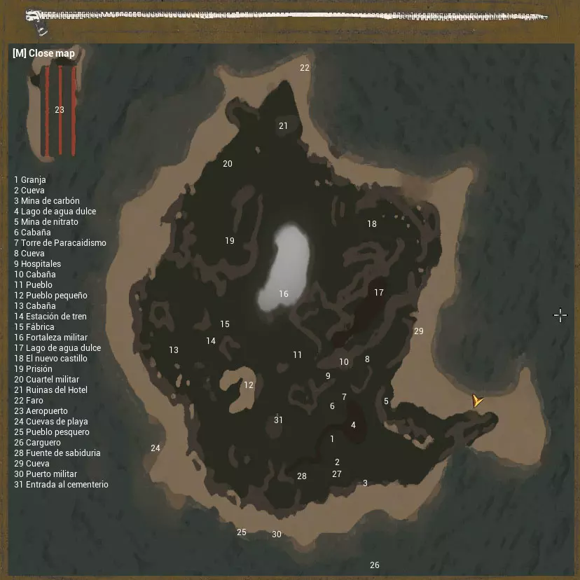 标记点1:可获取MP40冲锋枪、地图 标记点2:可获取大型军用背包 标记点3:可开采煤矿 标记点5:可提取硝石矿 标记点6:可获取狗 标记点7:可获取降落伞包 标记点8:可获取喀秋莎火箭弹 标记点9:可获取发电机、医疗包 标记点10:可获取链锯 标记点11:可获取改进型手枪塔配件、火焰喷射器 标记点14:可获取波波沙冲锋枪 标记点15:可获取工业机床配件 标记点16:可控制导弹标记点18:可获得STG自动步枪 标记点23:可获得战斗机 标记点26:可获得飞机发动机、司登冲锋枪、发电机 标记点28:可获得防毒面具 标记点29:可获得对讲机(用于呼叫远程炮火支援) 标记点30:淡水储存罐,摧毁后可获得大量经验值 此外:其他标记点可获得随机弹药及其他补给品