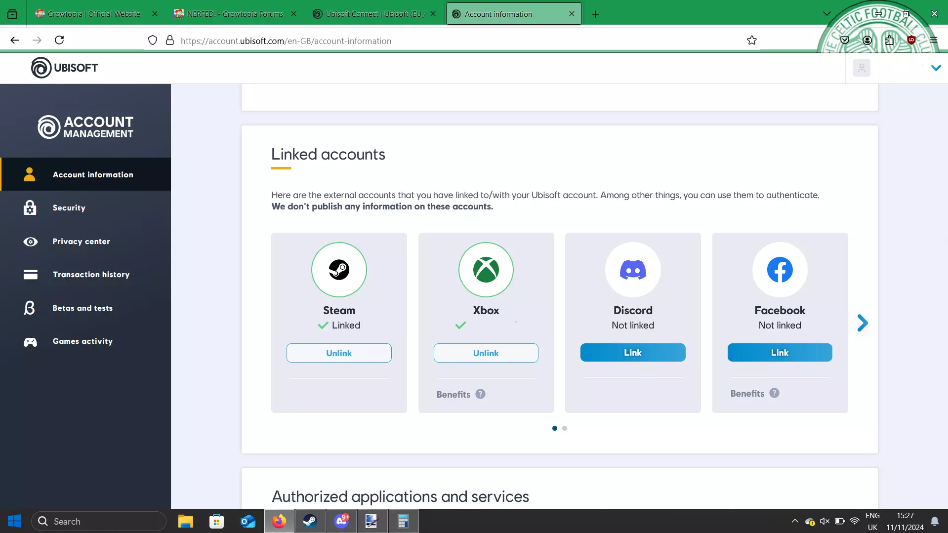 当你进入账户信息页面后,向下滚动至页面底部,你会看到已关联的账户。看到这部分内容后,你需要检查Steam是否已关联至育碧连接。如果在此页面看到Steam,则表示已关联;如果列表中未显示Steam,则表示未关联,你可以跳过下一步。