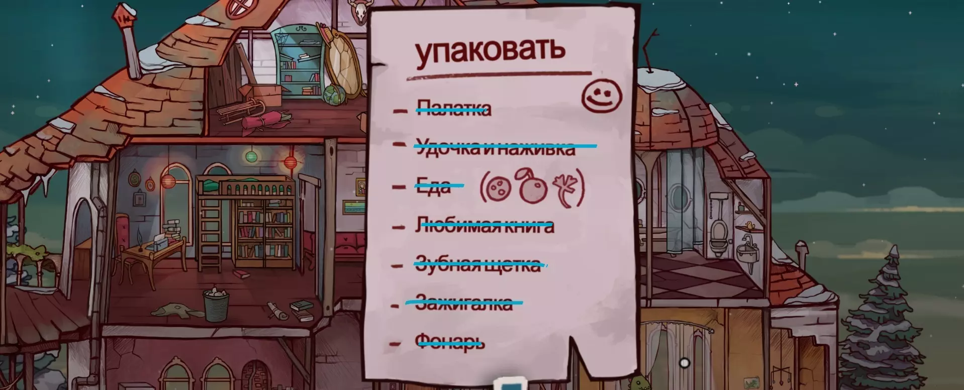 浴室。和橡胶鸭子对话,它说浴室里有浴室用品!从那里拿走它们,打开化妆包。里面有牙刷、海绵和牙线。这些我们都需要!接下来组装鱼竿:在背包里将牙线和棍子连接,然后将得到的部件和浮漂组合。一把很棒的鱼竿就做好了! 我们的清单上有两个新项目: