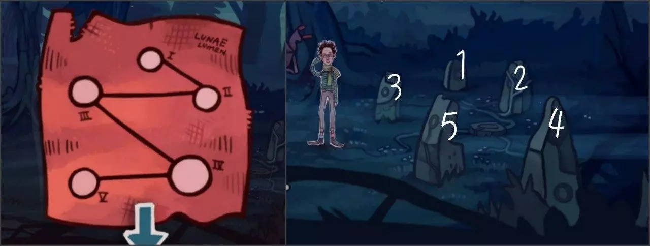 打开被遗忘的背包。里面有一只旧袜子、一块奶酪三明治和一个神秘的箱子。打开箱子:里面是一套缝纫工具和一块带有某种地图的神秘碎布。 靠近魔法石,在它们旁边捡起一根树枝。接下来需要靠近并按顺序“点亮”每块石头,顺序要与图案一致。