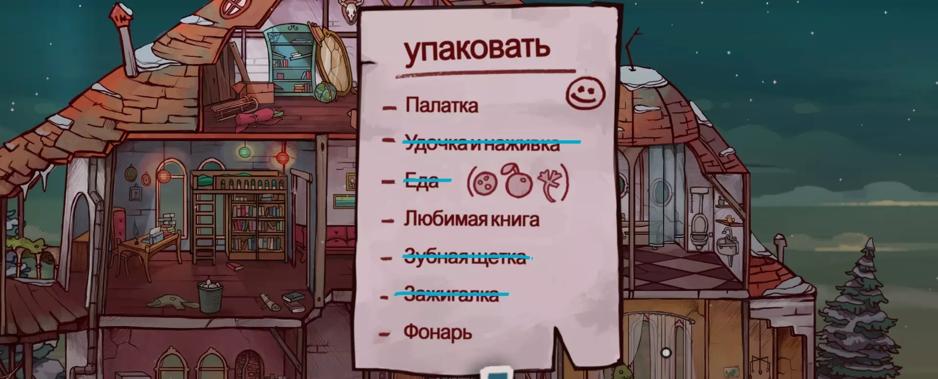 清单上的所有条目都已收集完毕。现在把所有东西交给鲁珀特。他已经多次提醒过,可以在走廊的入口处进行交接。 完成这一切后,前往门口,那里会有另一段过场动画,之后是小游戏。第二幕见! 第二幕:森林 旅途中大家表现得很棒! 我们已经抵达黑木岛的海岸。 首先前往观察哨。在路上捡一根树枝用来生火,再收集一些胡萝卜。从树上取下带钉子的木板。爬上去——观看过场动画。 前往营地,从背包里拿出树枝。向右走,捡起石头。 靠近童话树。折断一根木棍。 营地。在背包里将直木棍和空饼干盒组合。用制作好的工具去对付乌鸦——观看过场动画——乌鸦受到惊吓四散飞开。一只渡鸦帮助了我们,搭了一座过河的桥。谢谢你,小家伙!;) 我们来到了河对岸。开始采集蘑菇。 走近神秘的洞穴,把胡萝卜放在洞口。看看这里有谁!点击兔子,获取生火用的干树叶。