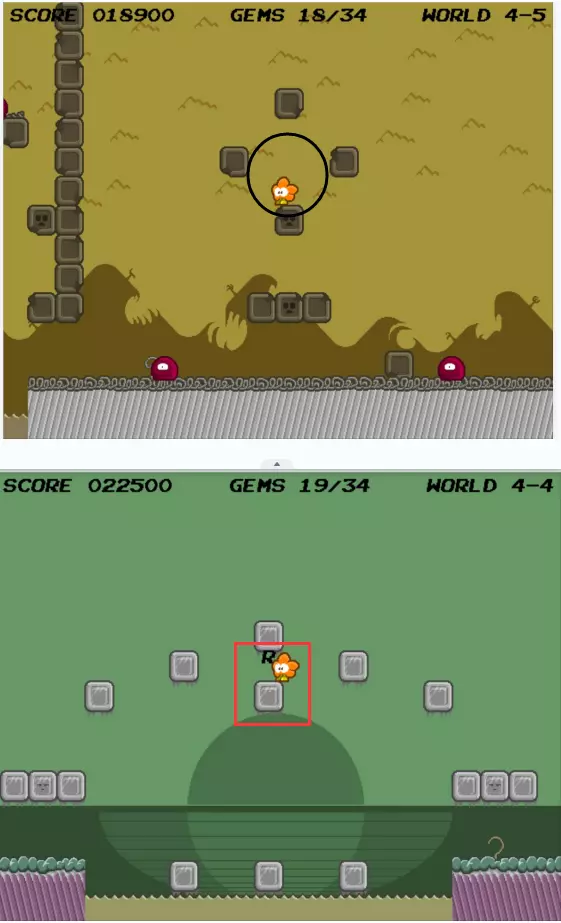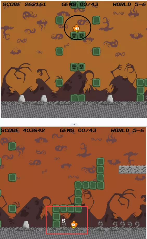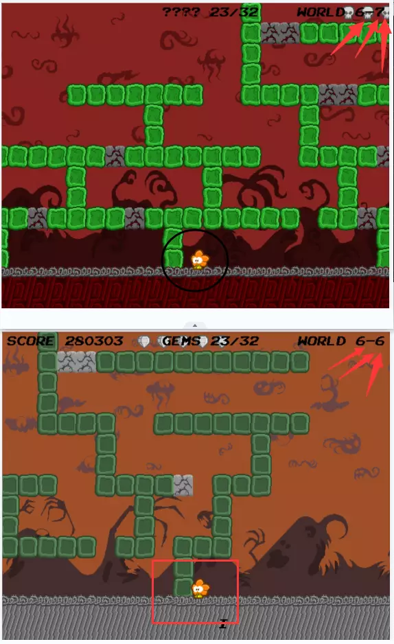 以第五层世界来到上图黑圈所示位置,转换成第四层世界,然后向左侧返回至下图中位置:这个位置在你刚来的时候有很多手怪物。跳到红色方框中的方块上,有点难度,要慢慢跳。
