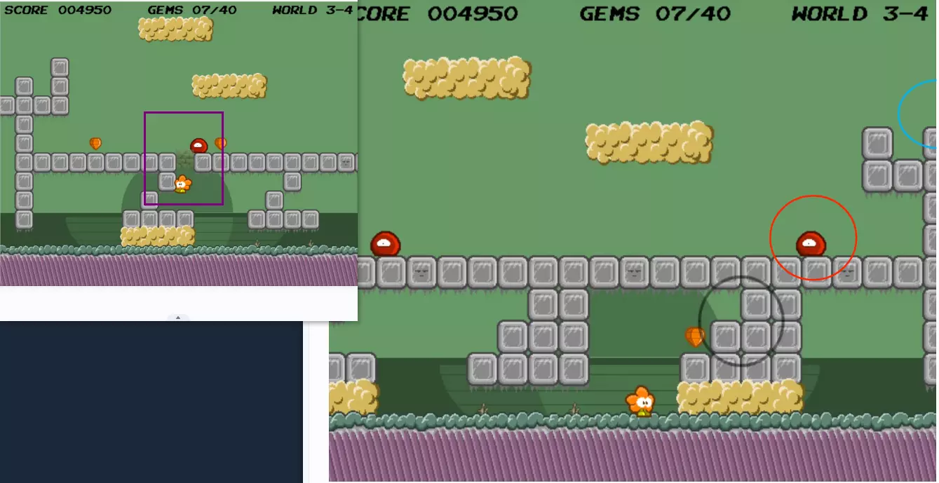 3-E 在初始位置,如图所示:首先在黑圈处转换到第四层世界,同时确保在红圈处留下一只可踩踏跳跃的小怪,然后向左返回至紫色标记砖块处,顶掉砖块来到上层,向右前进至红圈预留小怪处,踩着小怪跳至蓝圈处获得字母。