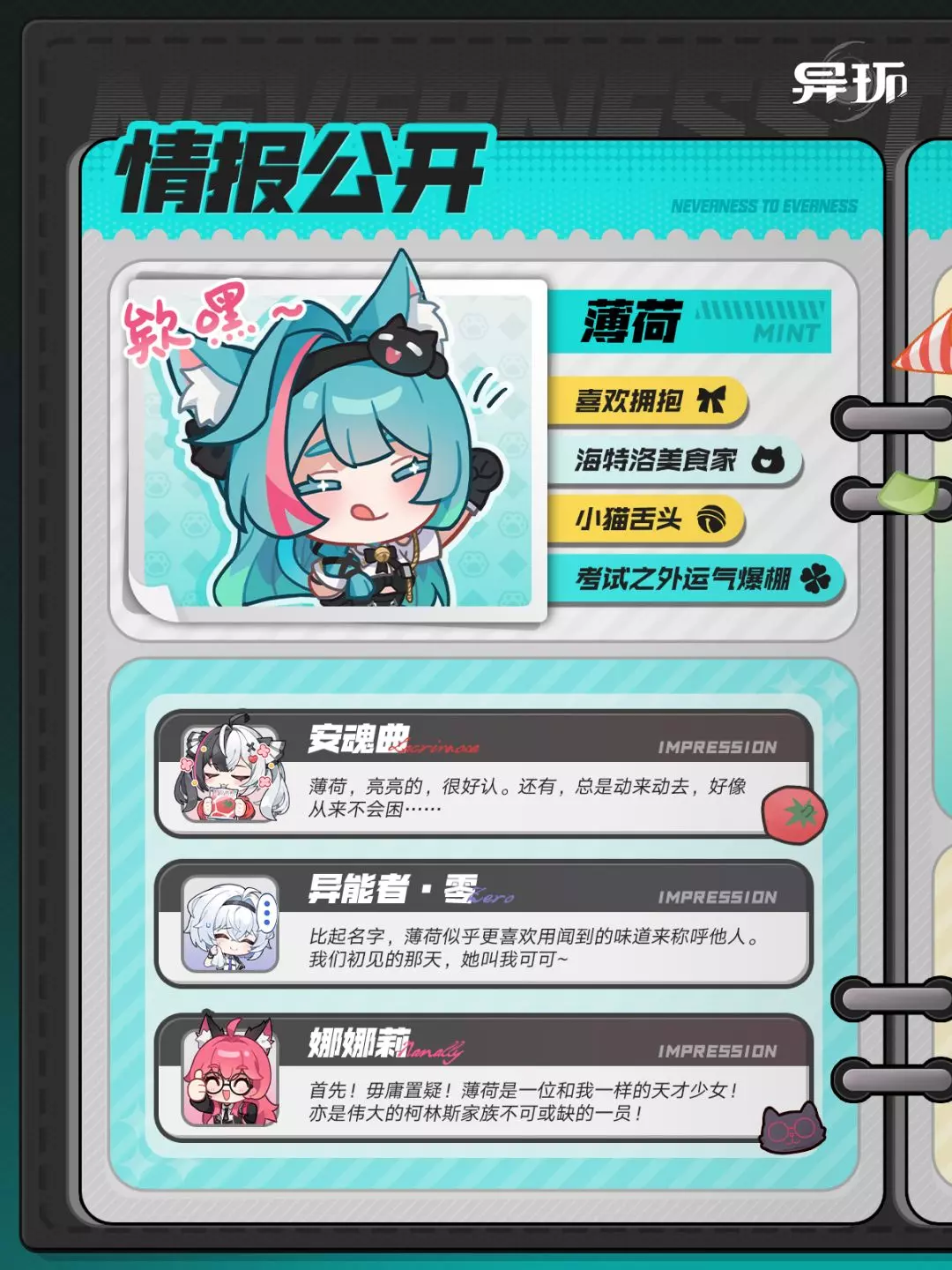 这是游戏《异环》的角色薄荷的情报公开内容,介绍了薄荷的喜好、特点,还有安魂曲、异能者·零、娜娜莉对她的印象,同时展示了薄荷完成任务后吃到冰淇淋的闲趣时光日常。