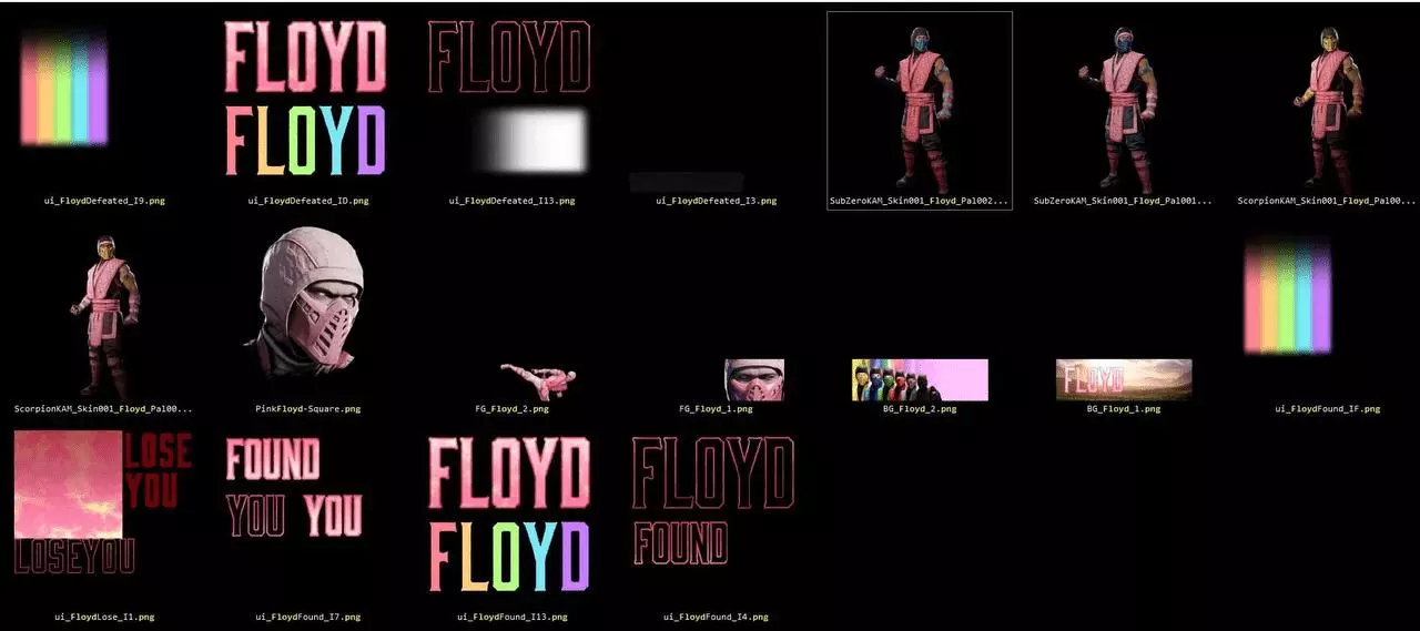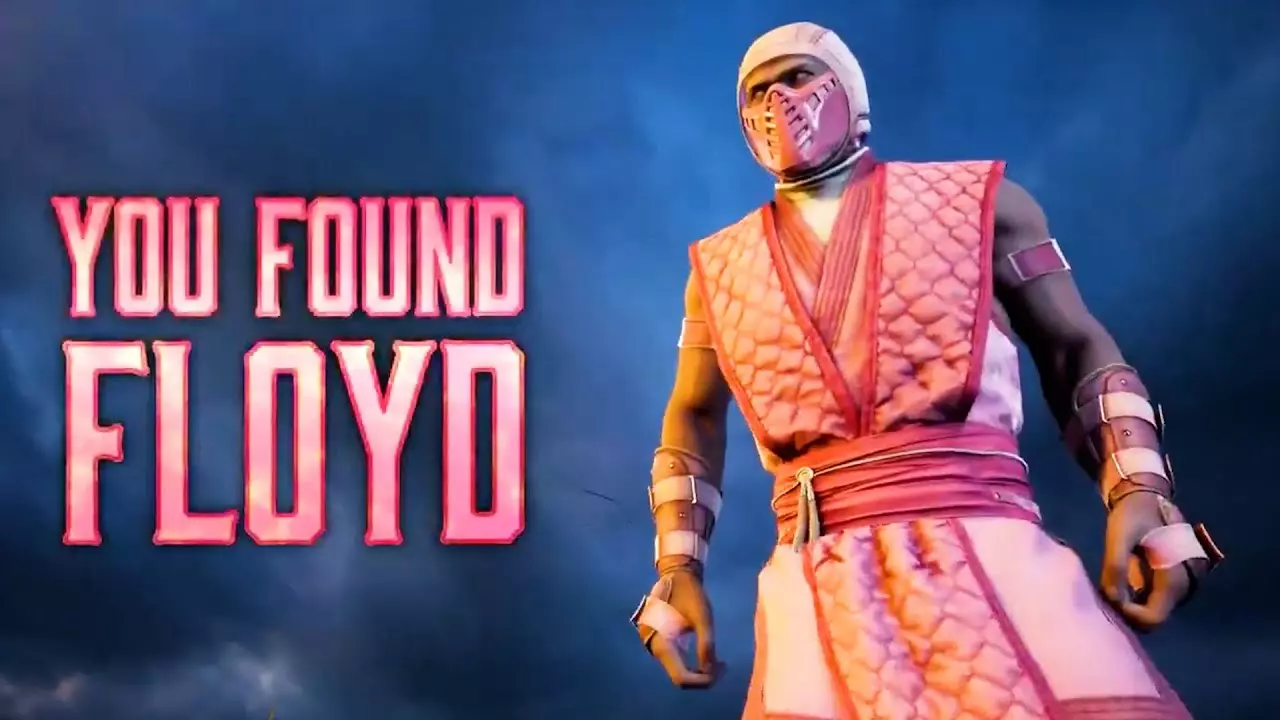 不过,正如一位用户在2025年1月22日所推测的那样,粉色忍者的想法很可能更早。这一提及表明,实际上正是马特·凯斯勒在2021年10月提议埃德·布恩创作一个名为弗洛伊德的粉色忍者。布恩在社交媒体上回应称,凯斯勒应该是在《真人快打3》期间提出的这个建议。弗洛伊德的存在不过是埃德·布恩口中的一个笑话或轶事,至少在那之前是这样。与此同时,一些追随者试图通过修改游戏代码来寻找这个潜在角色的踪迹。还有人发布了经过编辑的忍者类角色图片,将他们的衣服颜色改成了粉色。2024年9月,在《真人快打1》的扩展包【Khaos Reigns】发布后,一名玩家发现了一些理论上可能表明弗洛伊德是时光之塔模式隐藏角色的线索。但实际上,这些线索是开发团队一名程序员求婚彩蛋的相关内容。随着下一位可下载的客串角色【柯南】的公布,关于【弗洛伊德】存在的传闻再次成为《真人快打1》粉丝社群中的热门话题。有玩家通过分析游戏代码,证实了该角色的真实性,并发现了一些相关的图片以及解锁条件。解锁与弗洛伊德的战斗并取得胜利,玩家将获得名为【战场】的新关卡、Kameo格斗家蝎子和绝对零度的弗洛伊德主题备选颜色,以及徽章和背景图片。