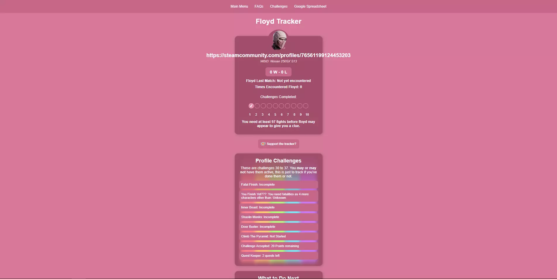 你可以在该网站追踪你为弗洛伊德完成任务的统计数据。它是安全的,无需登录任何地方。只需粘贴你的Steam个人资料链接,它就会显示你的统计数据。