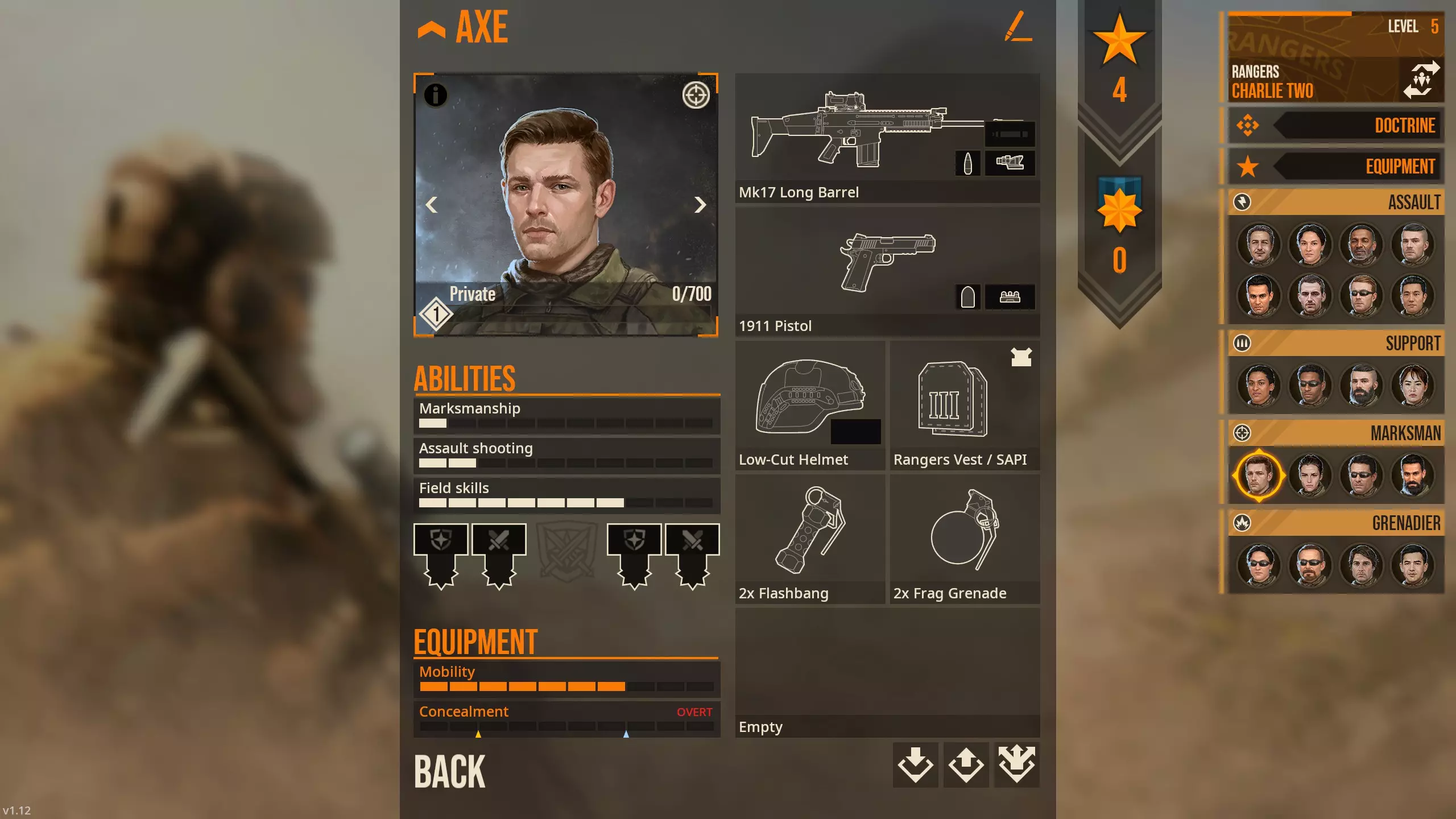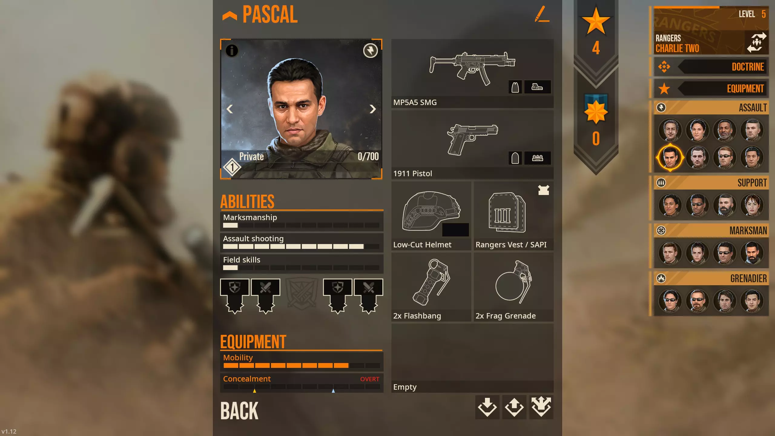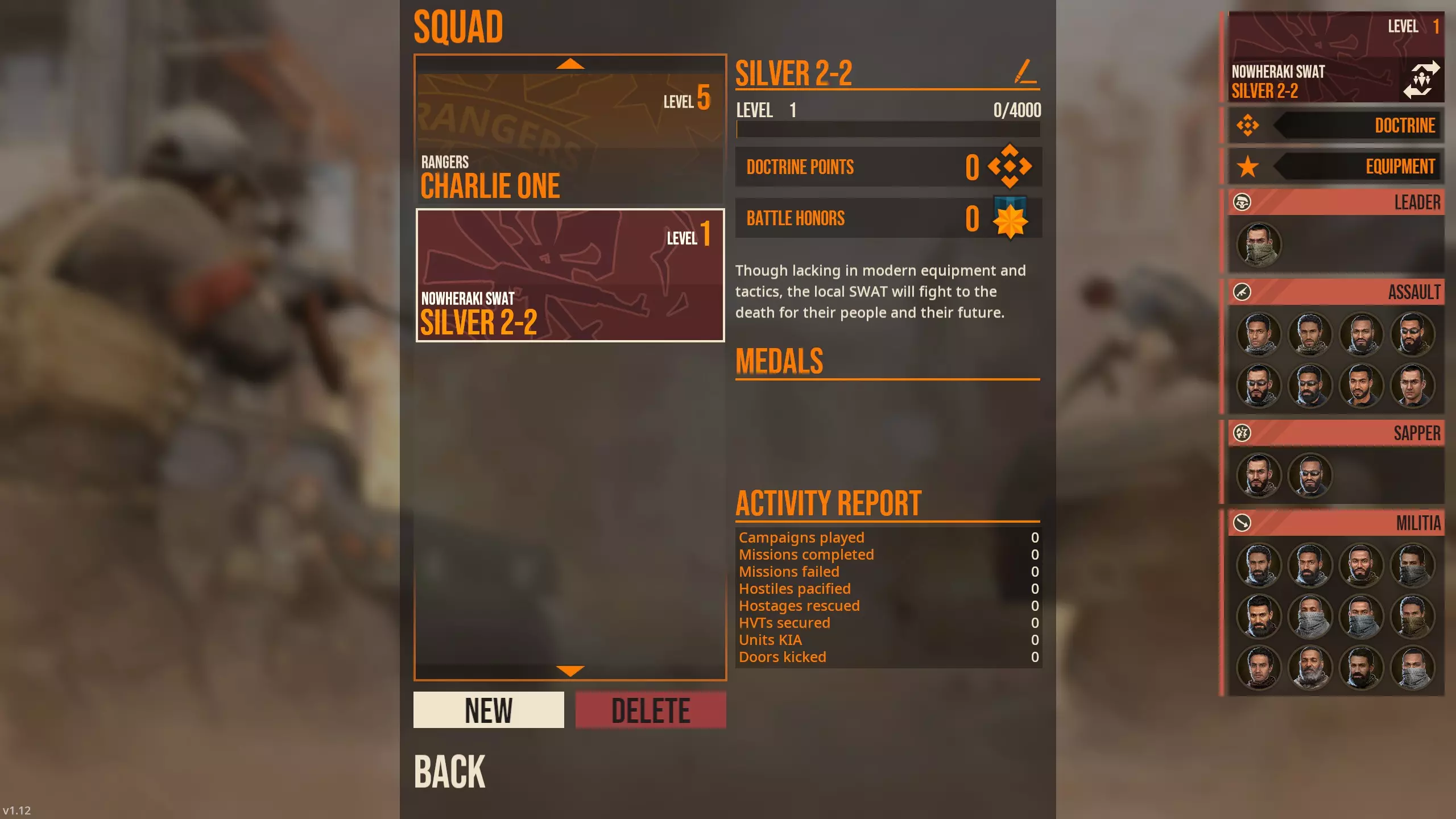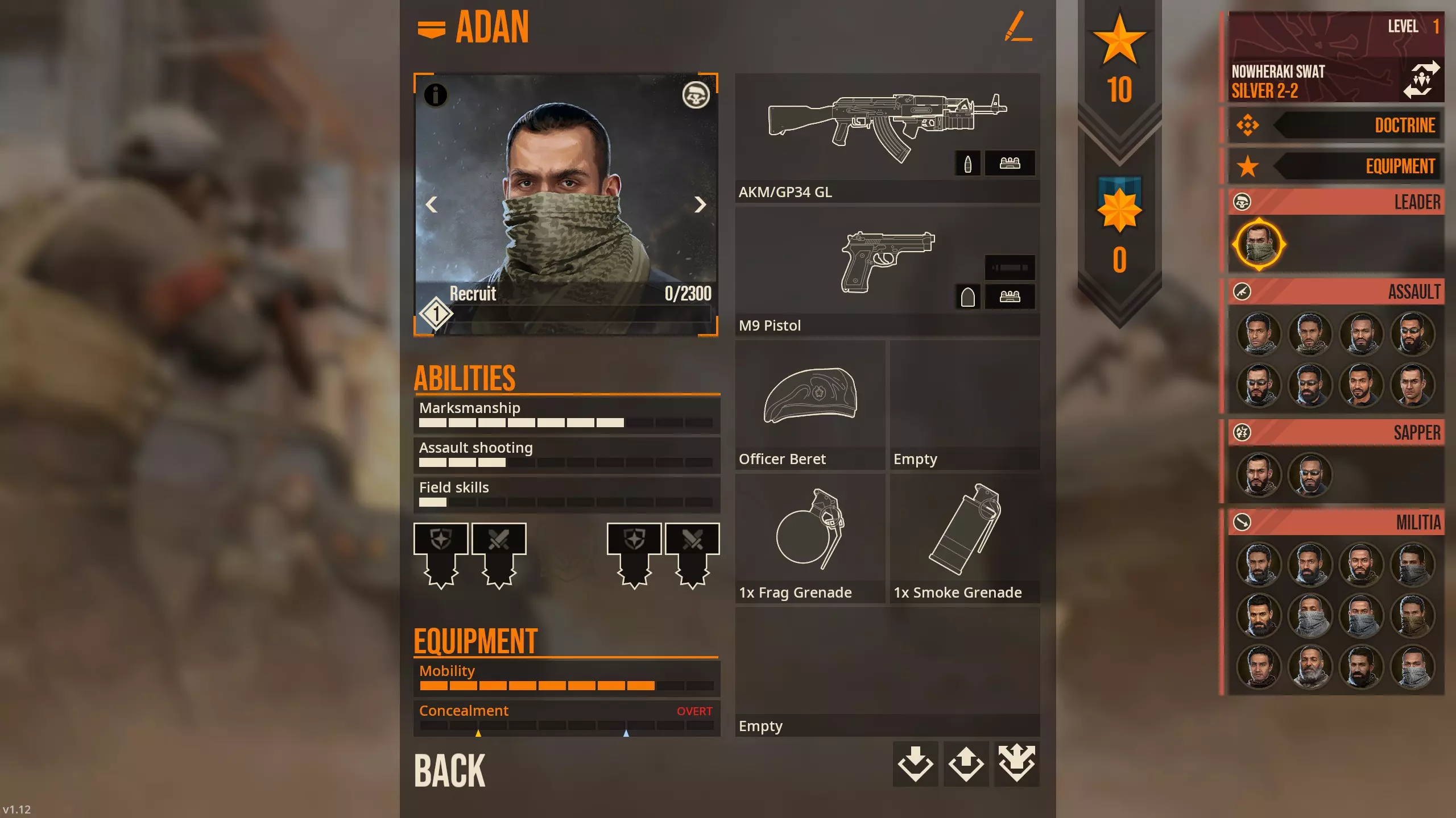 Pascal here has a mostly ideal spread of stats for an Assault trooper, having the only stat that really matters: Assault Shooting above 5. You see, enemies don't seem to have stats, and tend to shoot at the same time as your trooper if your Assault Shooting is 5 or so. If you buy an optic for your guns, you can outshoot them whenever, but there's still that first map you have to beat them on. The rest of his stats don't matter so much with the short distances, and the starting M16A4's accuracy on the Rangers compensates for bad Marksmanship by a wide margin. For early item buys, I recommend in no particular order [for the Rangers, obviously]: M1014 Shotgun - Equip to troopers with bad Assault Shooting stat to speed them up; especially consider for Support and Marksman troopers MP5A5 SMG or M4 Carbine or Mk18 Carbine (pick one) - Upgrade for CQC for Assaults Mk17 Long Barrel - shoots burstfire and does good enough at range, straight upgrade for Marksmen Holo Sight - best CQC optic 1911 Pistol - Excellent sidearm that serves a similar role to the M1014 in letting troopers with bad Assault Shooting to attack faster than their primary rifle - Equip to everyone unless you have something else you prefer 3x Slap Charges - Some halls are going to be too tight to breach from the side, this is where slap charges come in 1x Wall Breach Charge - Heck, some doors are too unsafe that maybe you'd want to make your own 'door'. Spy Camera - Might as well check under the door ahead of time, huh? For Nowheraki SWAT (in no particular order): Handguns are mostly useless, you can skip them Get single plates on everyone ASAP. You'll have to get 2x Battle Honor points to equip your Militia with them. Leader can equip Riot armor M4 carbines and the APC9 K are the ideal weapons for anyone that can equip them (don't forget the Western Weapons Doctrine). Leader can equip M4/203 M249 LMG by itself gives the SWAT something the other two squads can't - potentially 8x machine gunners all going HAM. This is more a luxury buy, get this after the M4 Carbine/APC9 K and armor for your SWAT members - just remember that this is best either micromanaged with suppressive fire or fired from cover; because by default the other weapons have slower minAimTimes that actually match the M249 LMG, this actually becomes a sleeper hit, but you're still better off treating it like a support gun.. M500-MEK Shotgun is borderline unusable without the 4 star 8 PEL 00 Buckshot ammo type. Normally I wouldn't recommend it, but its use as a weapon to breach doors with the Shotgun Breaching mod in of itself is pretty good. It also by default shoots faster than the other weapons out to like 5 meters, so that's worth considering, using it as a breaching weapon. This is a Doctrine, not a weapon, but the US Weapons Familiarization doctrine helps a LOT. [*[ Also a doctrine, but [b]DON'T[/b] take Rapid Fire. If you bought the M68 Red Dot 1x, then it's available for Nowheraki SWAT. The best use of Battle Honors is getting your militia plates. You only need 2 Battle Honors. The only other thing that's even close to worth it is the subsonic M1153 147gr JHP ammo for the APC9 K, which you'll need 5 Battle Honors for. The G3 Rifle otherwise is fine. The HK21E MG isn't worth it unless you're using Suppressive Fire or using it as a psuedo-DMR with 100 ammo. I don't play with shields, but it requires 8 battle points sooooo...[/list] CIA: Make your choice between the Glock 19 (the one that can equip a suppressor), the Mk24, and the MP5K for Undercover. The MkIV Hush Puppy is...doable, since it's essentially a coin flip whether or not you'll get the kill within 2m, but tbh having a gun that either shoots in bursts (MP5K) or kills in 3 bullets anyway (Mk24) is worth it IMO. PPK suppressed gives you an extra meter or two less sound radius and does roughly the same damage as the Glock but you have less than half the reserve ammo - doable, at least. M4 Carbine is 'good enough' for loud use, and once you get the doctrines up and running your CIA agents become pretty competent. You'll need Battle Honors to unlock the 4m sound radius subsonic ammo for the AK105 Alpha. It also unlocks the Undercover AKS74U suppressed-subsonic ammo, but it's like 6m or 6.5m or so. This ammo type does decently mediocre damage but it's probably your best suppressed primary for your Black Ops. MP5SD6 is the other best suppressed weapon Black Ops can use. 2.5m sound radius. M249 is the only other loud weapon I'd recommend since it's one of the top 3 guns in the game outright, just remember it's best used from somewhere you can mount it. There's a specific map in the mod 'Longer Day's Work' where having your two Black Ops dudes with LMGs vs enemy QRF is a godsend I don't recommend the Rattler Note to Self: To-Do [END OF GUIDE] Eventually I gotta clean up the rest of the guide. Probably going to keep the detailed explanation of the attackTypes, maybe go into deeper comparison of weapons, IDK right now. The rest of this guide is moderately outdated, though some things haven't changed so it's worth a look through Definitely want to directly compare weapons though. I think I'll do: Rangers - Compare Primaries Assault: MP5A5 vs Mk18 CQBR Assault: M4 vs SCAR-H CQC Assault: M16A4 vs SCAR-H STD Assault: M16A4 vs M7 Assault: URGI vs the others Support: Comparing the LMGs outright - M249 overall best with LAMG having the non-mounted niche Marksman: Comparing the rifles should be easy Grenadier: since their weapons are used at range All-class: Go over pistols SWAT - cover primaries Compare M4/M16A4 to the AKs ??? CIA - Compare primaries I guess - some times you're wanna go loud, while other times you need quiet Also compare sidearms - suppressed versions are roughly similar but sometimes you're wanna go loud Introduction [Outdated, v1.09 from here on] Prelude: I am currently adding information regarding the full release [v.1.09 upon editing], but earlier version is included for sake of reference. A lot of