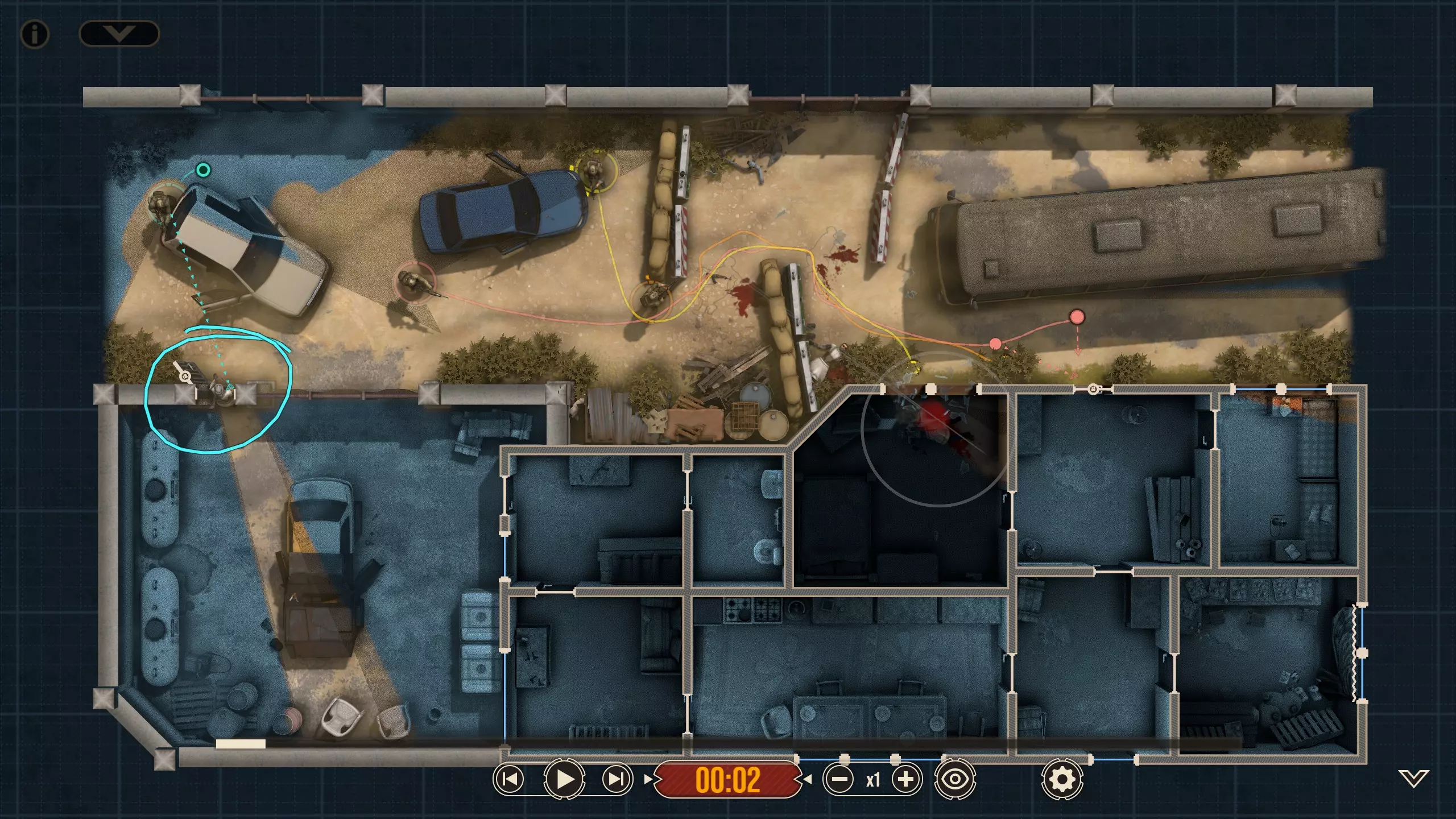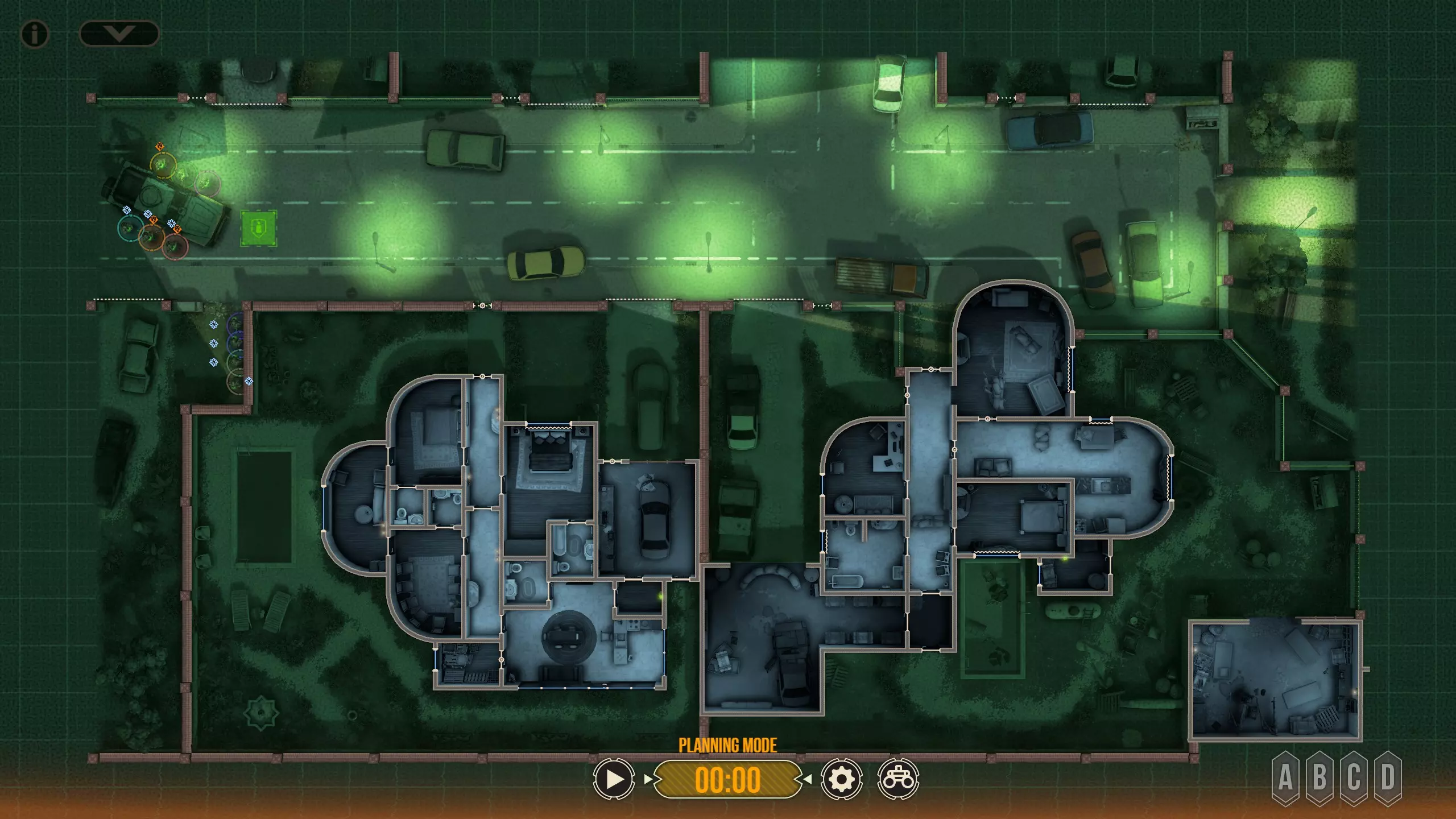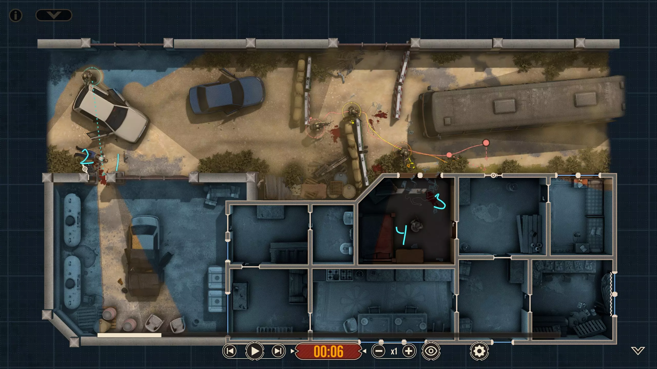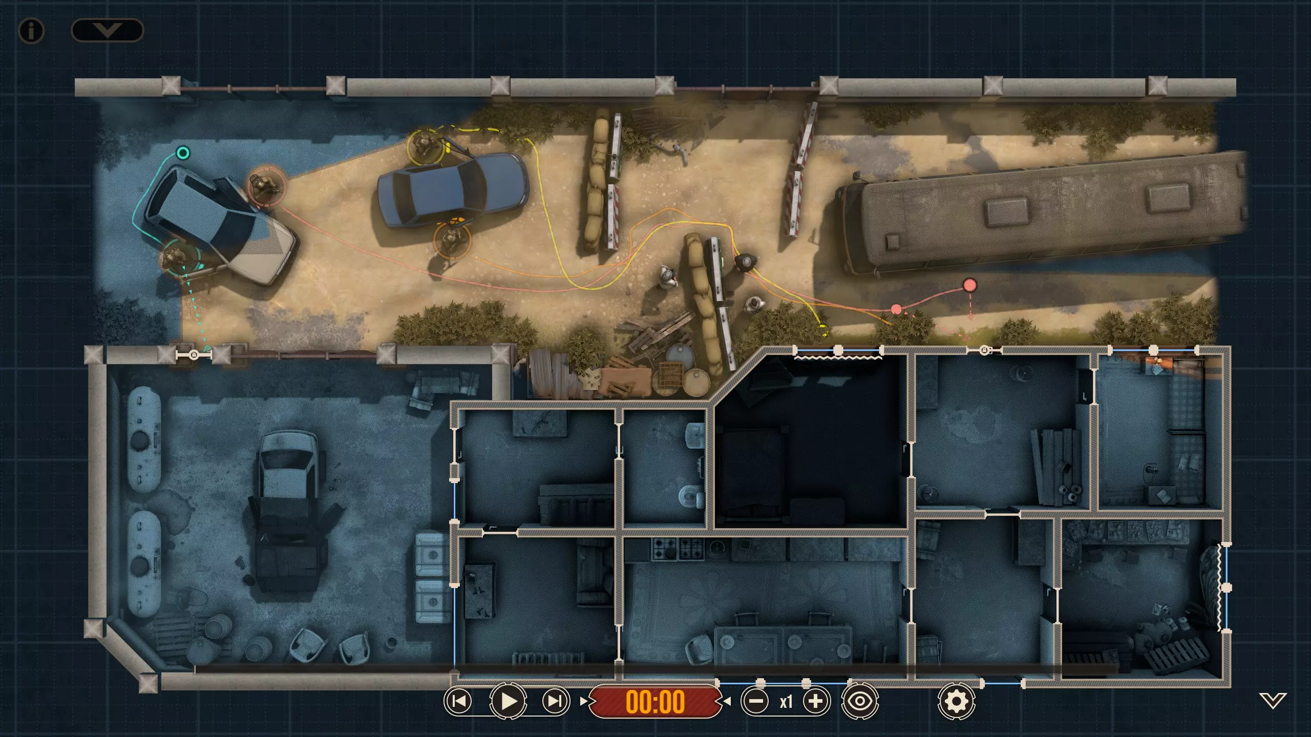 这里有四名特遣队员,每名队员都被选派执行特定任务。 出生点正南方有一扇上锁的门。在首轮交火后,我知道敌人会踹开那扇门并蜂拥而入,所以留下一人盯着那扇门(以防出现更多侧翼敌人)是个不错的选择。我让带有青色轮廓且手持轻机枪的特遣队员到汽车另一侧进行支援,因为我不确定他所瞄准的特定角度在他向即将被打开的门射击时是否会被火力压制。 地图中央的开阔区域有3名敌人,任何人都可以消灭他们。 右下角的房间里有一扇不坚固的门——门内有一名反应速度极快的敌人,因此破门时需要小心。这里还有一面可以突破的平整墙壁,但在这个存档中,我没有足够的星级点数来购买破墙技能——不过可以从北面的墙壁突破。 地图上最暗的房间,其窗户会在交火中被打破(黄色队员负责),所以我的计划是突入那个房间。一名擅长近距离战斗的突击队员最适合从窗户突入。因此,我选择的4名队员如下: 1. 支援型M249(青色轮廓) 2. 突击型MP5A5(黄色、橙色轮廓) 3. 掷弹兵M16A4/203(橙红色轮廓)