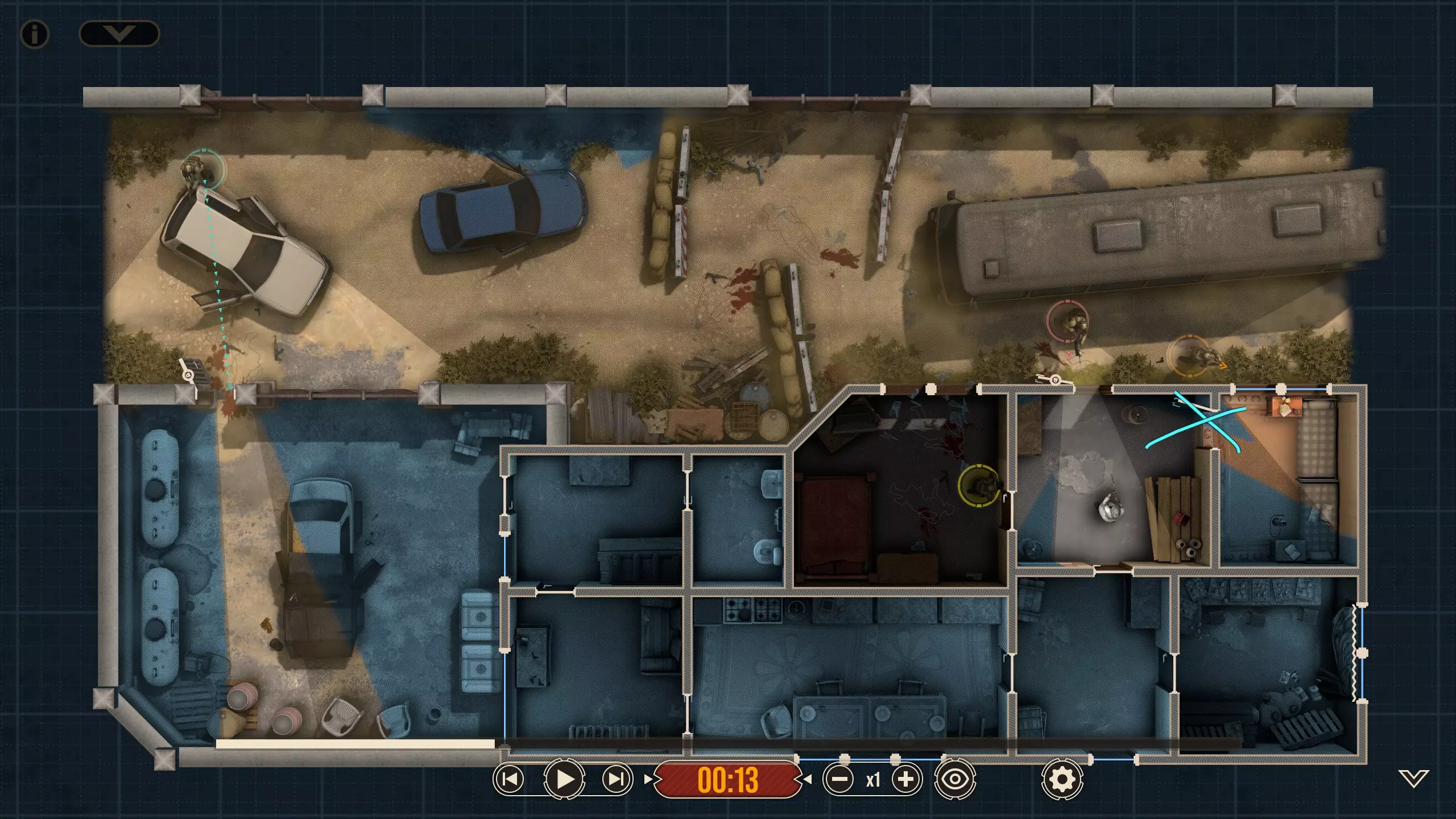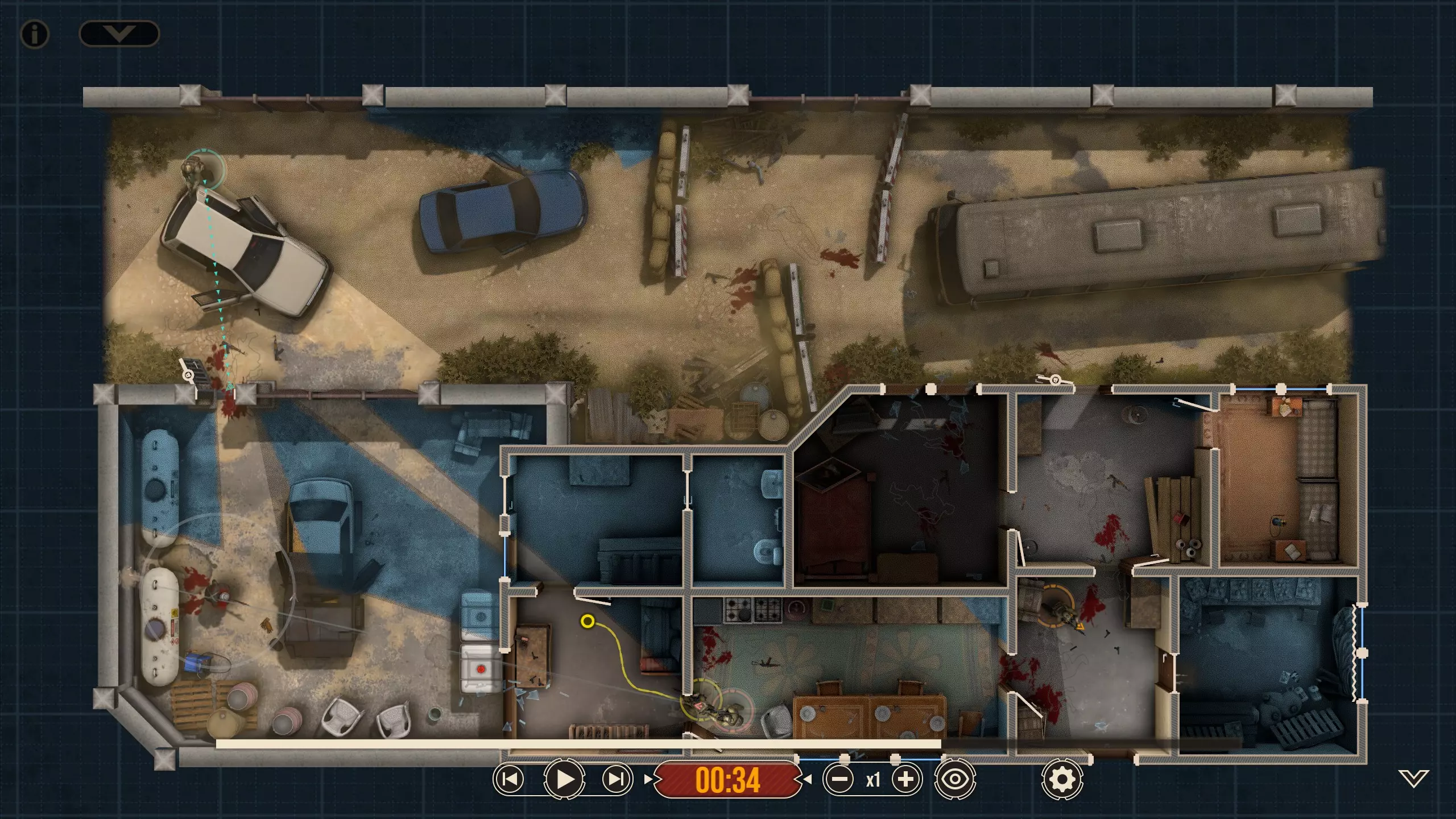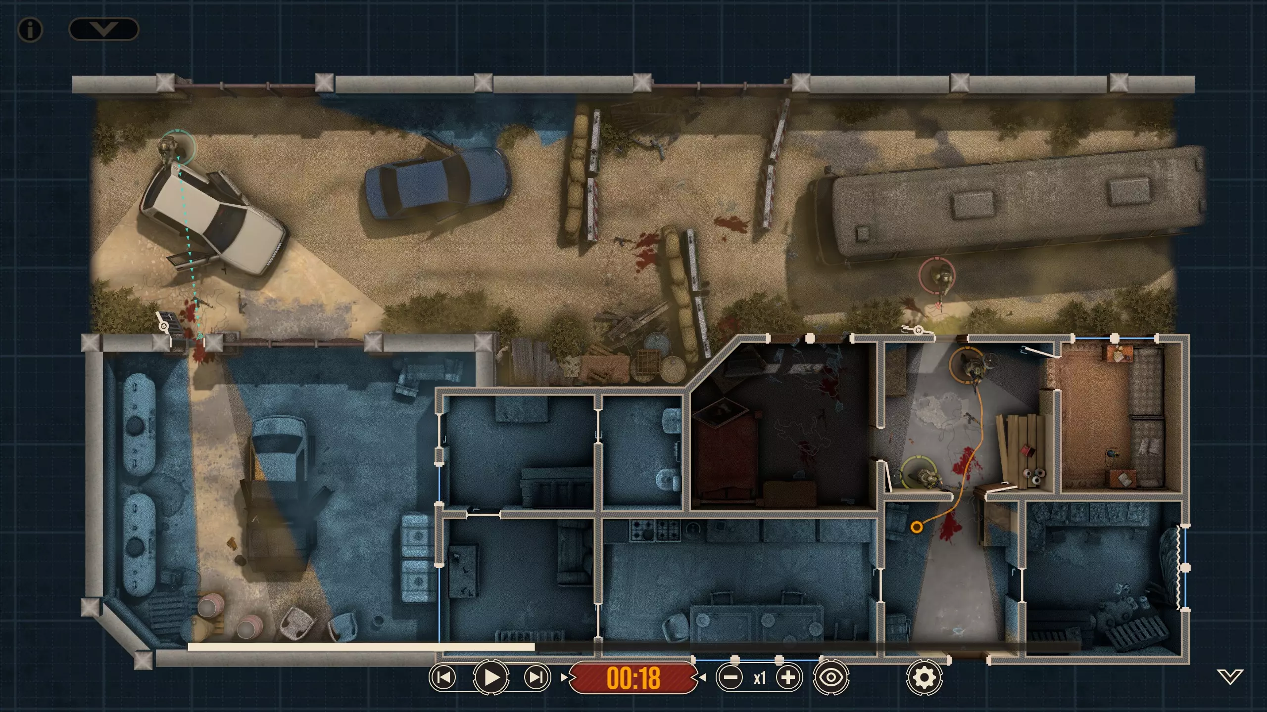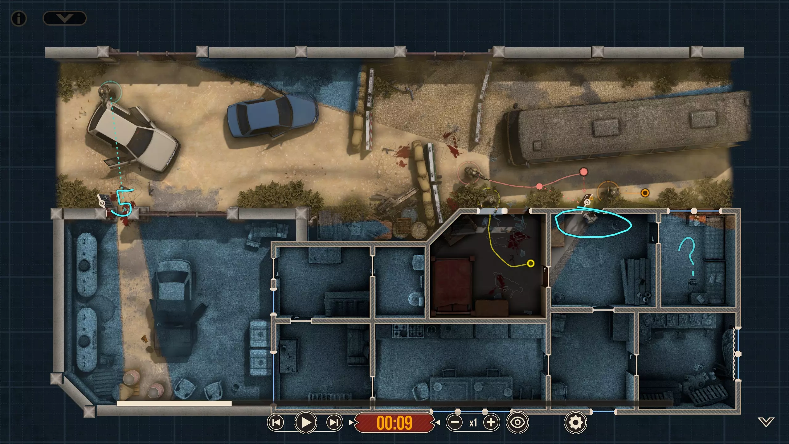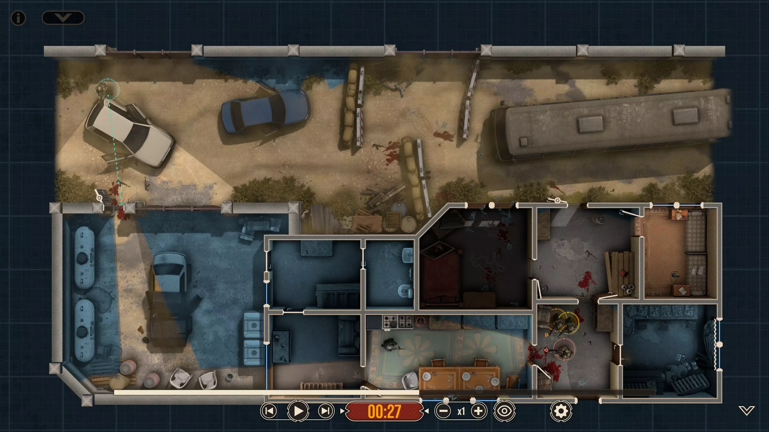 这里有四名特遣队员,每名队员都被选派执行特定任务。 出生点正南方有一扇上锁的门。在首轮交火后,我知道敌人会踹开那扇门并蜂拥而入,所以留下一人盯着那扇门(以防出现更多侧翼敌人)是个不错的选择。我让带有青色轮廓且手持轻机枪的特遣队员到汽车另一侧进行支援,因为我不确定他所瞄准的特定角度在他向即将被打开的门射击时是否会被火力压制。 地图中央的开阔区域有3名敌人,任何人都可以消灭他们。 右下角的房间里有一扇不坚固的门——门内有一名反应速度极快的敌人,因此破门时需要小心。这里还有一面可以突破的平整墙壁,但在这个存档中,我没有足够的星级点数来购买破墙技能——不过可以从北面的墙壁突破。 地图上最暗的房间,其窗户会在交火中被打破(黄色队员负责),所以我的计划是突入那个房间。一名擅长近距离战斗的突击队员最适合从窗户突入。因此,我选择的4名队员如下: 1. 支援型M249(青色轮廓) 2. 突击型MP5A5(黄色、橙色轮廓) 3. 掷弹兵M16A4/203(橙红色轮廓)