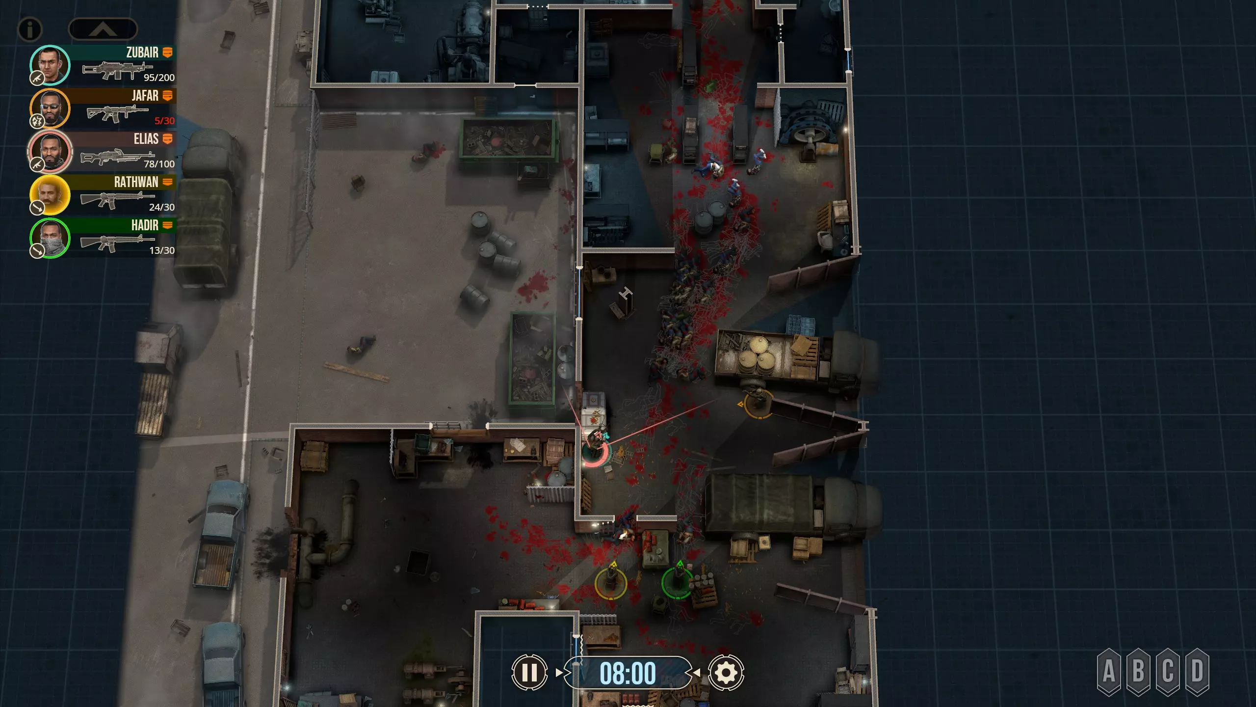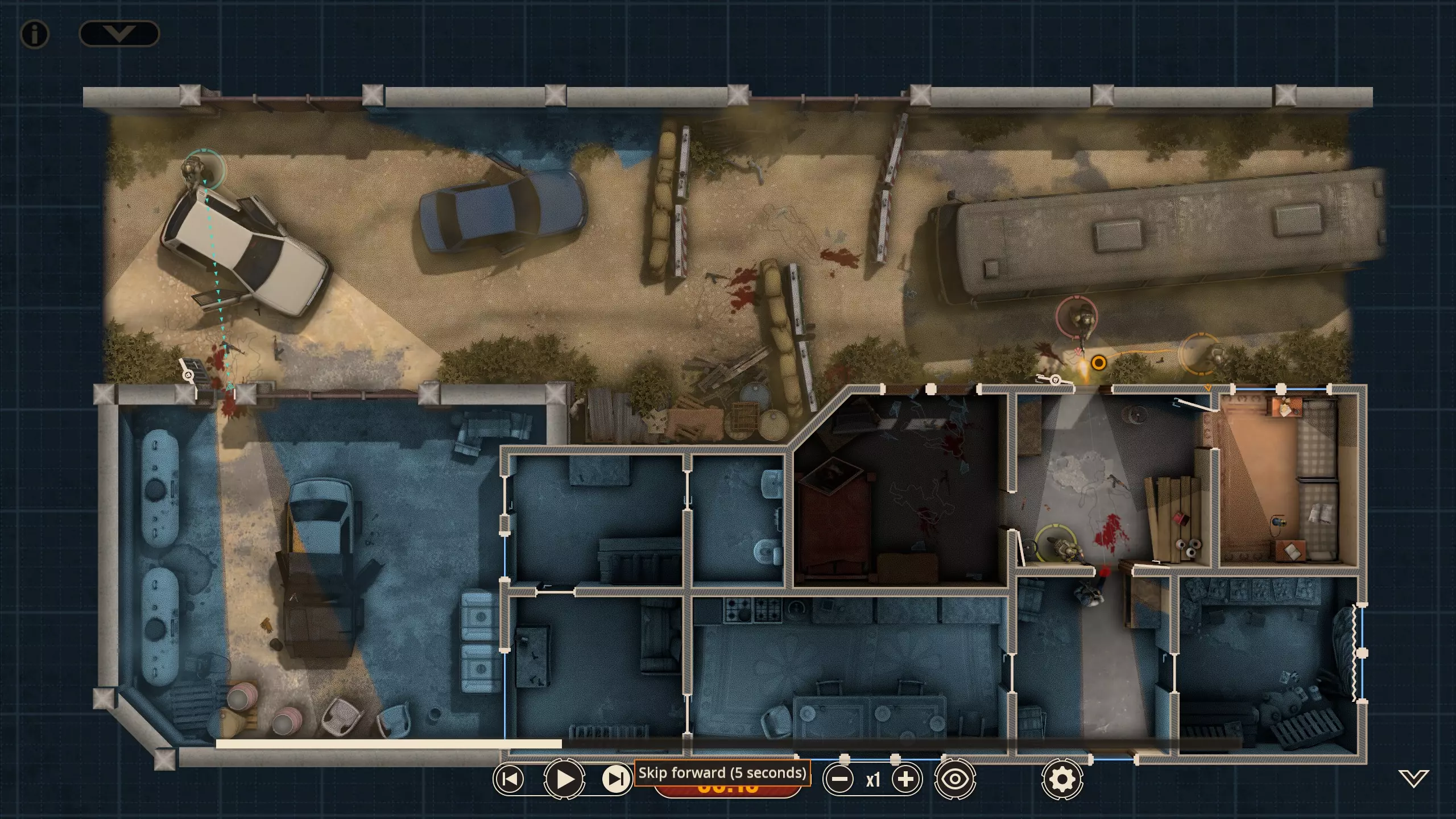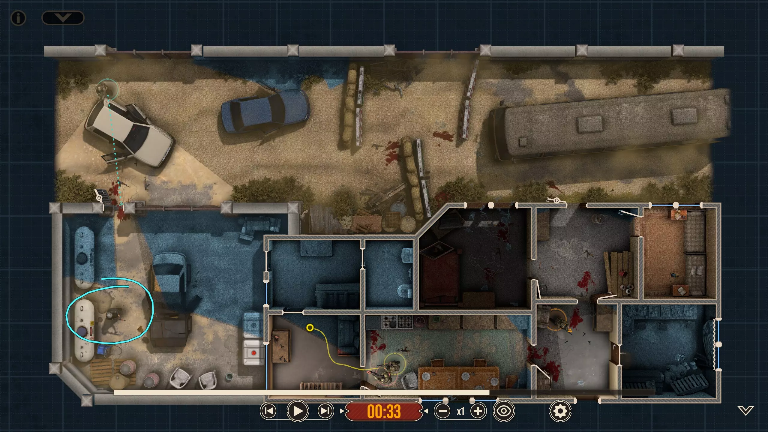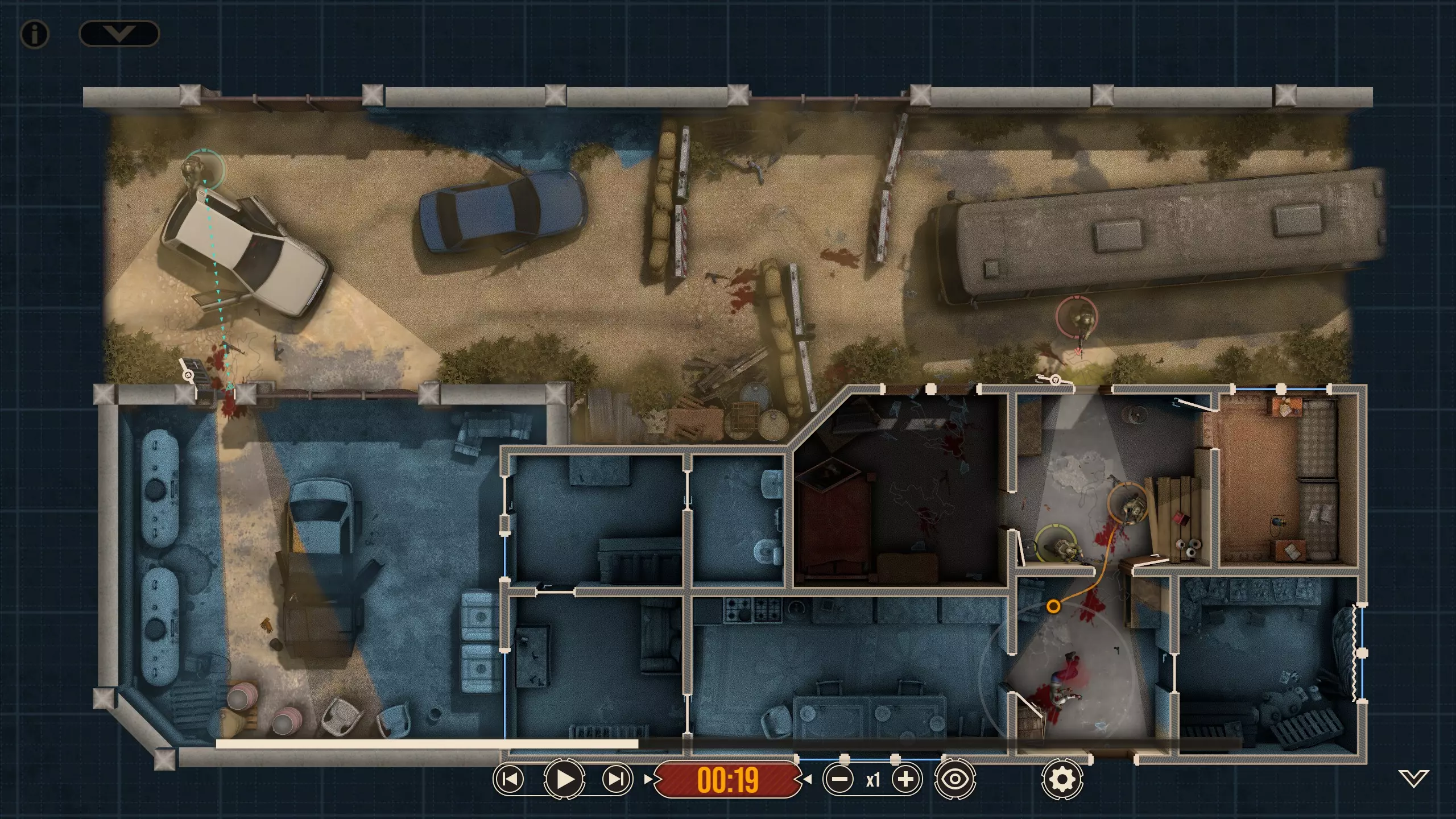 这里有四名特遣队员,每名队员都被选派执行特定任务。 出生点正南方有一扇上锁的门。在首轮交火后,我知道敌人会踹开那扇门并蜂拥而入,所以留下一人盯着那扇门(以防出现更多侧翼敌人)是个不错的选择。我让带有青色轮廓且手持轻机枪的特遣队员到汽车另一侧进行支援,因为我不确定他所瞄准的特定角度在他向即将被打开的门射击时是否会被火力压制。 地图中央的开阔区域有3名敌人,任何人都可以消灭他们。 右下角的房间里有一扇不坚固的门——门内有一名反应速度极快的敌人,因此破门时需要小心。这里还有一面可以突破的平整墙壁,但在这个存档中,我没有足够的星级点数来购买破墙技能——不过可以从北面的墙壁突破。 地图上最暗的房间,其窗户会在交火中被打破(黄色队员负责),所以我的计划是突入那个房间。一名擅长近距离战斗的突击队员最适合从窗户突入。因此,我选择的4名队员如下: 1. 支援型M249(青色轮廓) 2. 突击型MP5A5(黄色、橙色轮廓) 3. 掷弹兵M16A4/203(橙红色轮廓)