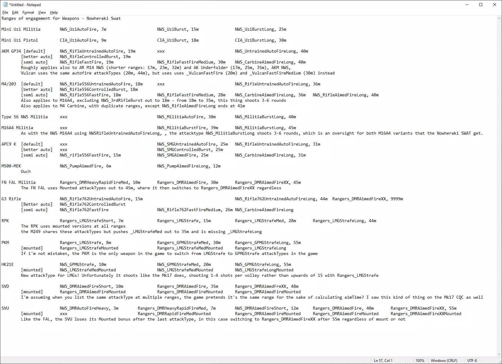 诺瓦赫拉基特警派系……条件比较简陋。看看初始装备里少了什么? 他们一开始没有护甲。要通过完成单人任务获得4颗星,才能为领袖/突击职业的所有人配备仅有的前板(单块SAPI板),而且还得再为民兵职业付费——而这需要2个战斗荣誉!既然我先提到了游骑兵的战斗荣誉,那我也来梳理一下特警的战斗荣誉选项: - 队长可以花费3点战斗荣誉获得一把AK-47M SF卡宾枪,这把枪顶多算平庸。 - 突击手可以花费3点战斗荣誉获得一把G3战斗步枪。 - 突击手可以花费4点战斗荣誉获得一把HK21E轻机枪。 - 突击手还能获得盾牌,其中四级盾牌需要8点战斗荣誉。 - 所有非民兵职业可以花费4点战斗荣誉获得一把HS-45手枪。 - 所有非民兵职业可以花费1点战斗荣誉获得殉道者护甲,该护甲能提供速度加成。 - 所有非民兵职业可以花费5点战斗荣誉获得ESAPI/SAPI复合护甲。 - 队长和突击手可以花费8点战斗荣誉获得低切头盔。 - 头部装备方面,有头带/PVS-7夜视仪可选,需要3点战斗荣誉。 - 显然,还有多种弹药类型可以用战斗荣誉购买。战斗荣誉也是如此。9x19毫米口径有M1153 147格令JHP(空尖弹)作为例子,这为诺瓦赫拉基特警的APC9 K提供了基础伤害和暴击加成,还能让他们使用亚音速弹药配合消音器。 特警的初始表现看起来不太理想,但仔细想想,你真的需要全套防弹板吗?前面有一块就够了,对吧?至少它只有4星难度…… 诺瓦赫拉基特警的APC9 K,堪称“游戏中最佳武器”的有力候选。 至于游骑兵,有两把武器在正确使用的情况下,基本上可以被认为是游戏中最出色的武器: 使用SOST弹药的M16A4,其交战速度与所有其他近距离战斗武器(霰弹枪和手枪除外)相当,并且一个3发点射就能消灭敌人。我再强调一遍,这款武器有多出色——实际上,我之前的指南版本已经充分赞扬过它了。 M249(架设状态下)一旦开火,大多数武器都会相形见绌,而且如果让队员使用压制射击,其射速甚至能超过M1014霰弹枪。XM250几乎是M249的直接升级版,但200发的弹容量需要更长时间才能打光。 这两款武器均为诺瓦赫拉基特警队可用,此外还有一个游戏中综合最佳武器的有力竞争者——APC9 K。 必须承认,它的伤害有点不尽如人意,从21降至19(在50米距离时——在25米距离时达到6发击倒的阈值),但其射速却高达惊人的每秒18.3发。其攻击类型也很出色(只要你不选择快速射击战术)<攻击类型名称="NWS_步枪556快速射击"射程米数="15"已禁用="true"/> <攻击类型名称="NWS_冲锋枪未训练自动射击"射程米数="25"/> <攻击类型名称="NWS_冲锋枪可控点射"射程米数="25"已禁用="true"/> <攻击类型名称="NWS_冲锋枪瞄准射击"射程米数="25"已禁用="true"/> <攻击类型名称="NWS_步枪未训练长距离自动射击"射程米数="31"/> <攻击类型名称="NWS_卡宾枪长距离瞄准射击"射程米数="31"已禁用="true"/> <攻击类型名称="游骑兵_卡宾枪XX瞄准射击"射程米数="9999"/> 暂时忽略_Rifle556FastFire、_smgAimedFire和_CarbineAimedFire,因为它们都是半自动:启用点射战术可改善冲锋枪的使用将_SMGUntrainedAutoFire修改为_SMGControlledBurst。在25米范围内: <AttackType name="NWS_SMGUntrainedAutoFire"> <ModifiableParams 最小瞄准时间="400" 最大瞄准时间="600" 最小射击次数="5" 最大射击次数="8" 重置时间="0" 精度修正="-20" 后续射击精度修正="-21" 暴击率修正="-10"/> <AttackType name="NWS_SMGControlledBurst"> <ModifiableParams 最小瞄准时间="390" 最大瞄准时间="600" 最小射击次数="5" 最大射击次数="7" 重置时间="400" 精度修正="-20" 后续射击精度修正="-15" 暴击率修正="-10"/> 而在25-31米范围内: <AttackType name="NWS_RifleUntrainedAutoFireLong"> <ModifiableParams 最小瞄准时间="600" 最大瞄准时间="700" 最小射击次数="3" 最大射击次数="6" 重置时间="600" 精度修正="-33" 后续射击精度修正="-10" 暴击率修正="-18"/> 这么说吧:在25米范围内,默认情况下你的APC9 K角色会射出所需的5发子弹无论如何都要击杀敌人,即使稍有偏差,也很可能对敌人造成大量压制。如果你没有投入【连射】战术,他们会持续射击直到敌人被消灭(我的意思是在25米范围内),而激活该战术时,你将获得精准度加成和瞄准时间缩短——投入2点技能点可将【SMG受控连射】的瞄准时间降至350毫秒,这与突击队员相当,考虑到诺瓦赫拉基特警的默认最小瞄准时间通常为400毫秒,这是一个非常必要的升级。派系总结 - 诺瓦赫拉基特警队 [派系职业与子职业] APC9 K,或者说(可能是)游戏中综合性能最佳的武器。我注意到APC9 K在25米范围内全自动射击效果显著,最近发布的G3步枪也有着不错的有效射程,所以我确实应该好好研究一下所有枪械,但这不是一小时内能完成的事。 我没有在这里全部打出来,而是整理到了记事本里。这是我的研究结果。
