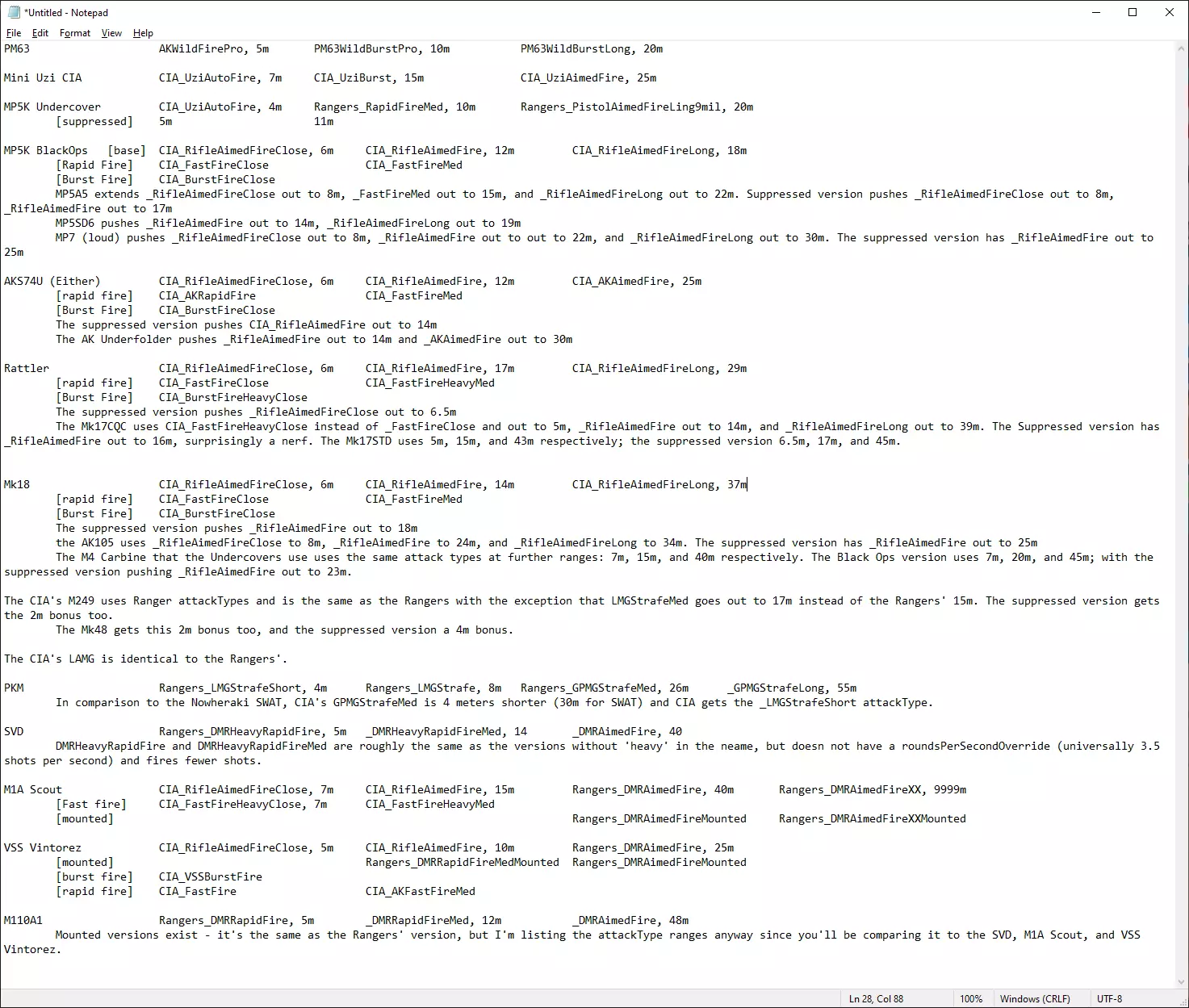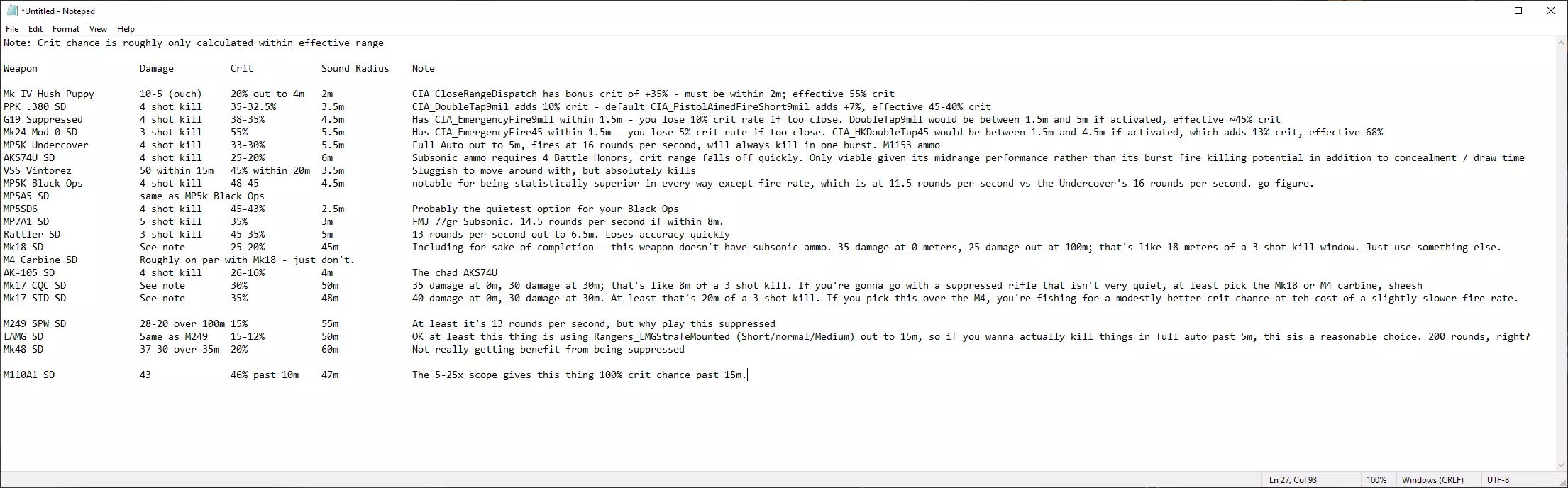 武器在很大程度上可以按相似的作用进行整合,但需要注意的是,对于大多数能够全自动射击的武器,你的中央情报局士兵在超过约6米的距离时会使用半自动模式射击——PM63、迷你乌兹和轻机枪除外。 自然,有时需要强行突入,但由于中央情报局士兵在多数情况下都会使用半自动射击,所以如果决定强行突入,最好关注武器的原始伤害。说到这里,伤害最高的武器是VSS Vintorez(使用SP5弹药时),在15米范围内每发子弹造成50点伤害。M110A1和M1A Scout的伤害为43点。Mk17STD在约20米范围内是三枪 kill,其伤害范围与Rattler相同,除非你使用超音速弹药,这种弹药基础伤害为35点(同样是三枪 kill,但会破坏潜行能力)。5.56口径步枪则使用Mk318 SOST弹药,在约16.5米范围内是三枪 kill,并且步枪的弹药量也更多。 选择你的武器:M110A1可以加装消音器(效果如何就看你了),弹容量为20发。VSS更适合近距离暗杀。而Rattler、M4卡宾枪和Mk17STD在远距离时精准度会大幅下降,Rattler下降40,M4/Mk17STD下降50。M1侦察步枪略有提升,但其精准度仅在150至100之间——至少在近距离作战中还算可用,不过它本质上是Mk17STD的换皮版本,用近距离全自动模式换取了15米外的暴击率。 因此,你的中情局干员并非神射手……但值得一提的是,M110A1是远程作战的唯一可靠选择——它不仅拥有稳定在450的精准度,还能装配5-25倍瞄准镜,从而在15米外获得100%的暴击率。 顺便说一下,SVD的精准度从30米时的200下降到70米时的100——用于中距离作战尚可,但不值得费心。 在大约6米至15米的距离内,你将依赖CIA_RifleAimedFire攻击类型,或者CIA_FastFireMed与CIA_FastFireHeavyMed攻击类型。【步枪精准射击】每秒发射4发子弹,【快速射击中型】每秒发射5发,【快速射击重型中型】每秒发射4.5发,射速有小幅提升,并且取消了射击次数限制,改为“持续射击直至目标被消灭”,而【步枪精准射击】在再次射击前会先发射1到2发子弹并稍作停顿。 至于近距离,【近距离连射】和【近距离重型连射】会以全自动模式进行短点射,发射2-4发子弹;而【近距离快速射击】以每秒6发的速度持续射击,【近距离重型快速射击】则为每秒5发。这与游骑兵基于射速使用【游骑兵中型速射】和【重型中型速射】攻击的方式类似,但只有在5米左右的范围内才能达到如此快的射速。我个人认为,射出更多子弹比更快的半自动射击更好,因为快速射击类技能只能提供4%的暴击率加成——还是直接用火力压制敌人更好……但即便如此,这也只在大约5米范围内有效。 需要注意的是,这对于中情局(CIA)的预期任务来说已经足够了——在极端近距离使用消音武器进行暗杀。 不过,你那些在中距离开火的枪械至少能提供掩护。对于卧底干员而言,M4卡宾枪几乎是你唯一的选择。而对于黑色行动干员,你还可以考虑Mk17STD和M1A侦察步枪。其中,Mk17STD在5米范围内可全自动射击;M1A侦察步枪则具备DMR攻击模式,在15米外有30%的暴击率加成,但其效果有待商榷。如果必须强行突破,选择适合任务的武器即可。 不过,我不建议默认选择强行突破。接下来我们谈谈消音武器选项。 在此之前,最佳的强行突破手枪是M1911或G22。G22能完成所有9毫米手枪能做到的事,且有约10%的暴击率加成;M1911则拥有更高的基础暴击率、更强的伤害以及比HK45更远的射程。同样值得一提的是迷你乌兹和PM63,因为无论战术如何,它们在5米外都能全自动射击。我的意思是这还行,但你基本上会像使用配备迷你乌兹的民兵那样使用它们——可行,但你有更好的方式来部署你的士兵。在这两者之间,迷你乌兹射速更快,且不会低于5发击杀。 补充:实际上LAMG看起来好得多,它能像架设状态一样在15米范围内射击。如果你需要让中央情报局小队强行突入,让两个装备这种武器的士兵四处行动其实是个不错的主意——只需记住15米对士兵来说算是一个相当严格的限制。解锁它需要消耗6个战斗荣誉。 中央情报局的匕首——消音武器 至于消音选项,老实说有不少选择可供使用: