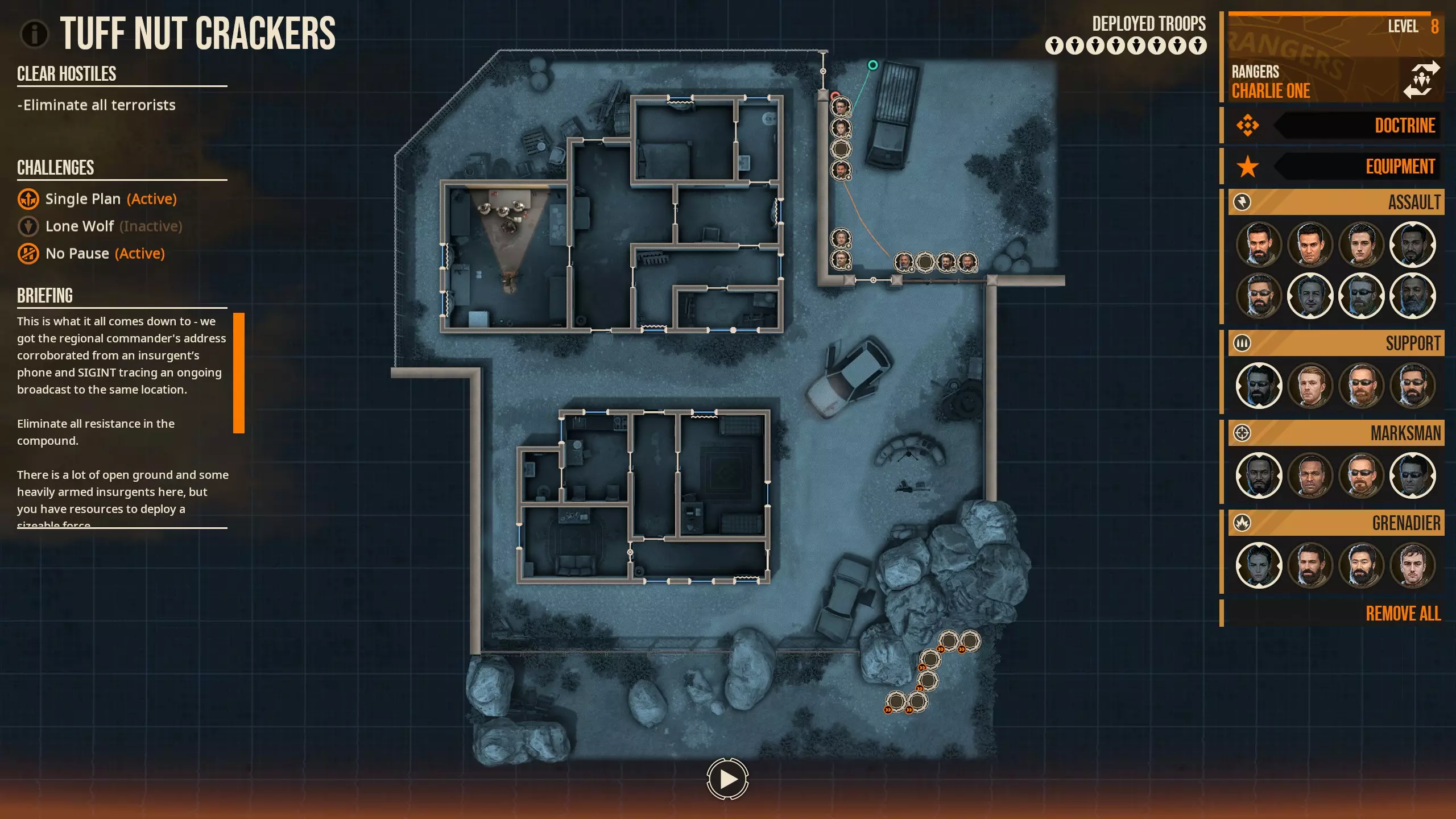 这是来自任务包【卡牌组】的【一对八】任务。 如你所见,这里有非常长的视野范围——而且还是在黑暗中——在这里部署至少一名携带轻机枪的支援兵和/或一名携带精确射手步枪的神射手是完全可行的,让他们移动到其中一辆载具旁并面朝地图右侧。敌人会从地图中央或右上角进行增援,这意味着你的轻机枪支援兵/精确射手步枪神射手将拥有一片类似射击场的区域来进行交战。 同时,你可以让你的中场队员和近距离战斗人员进入地图南半部分的两座房屋(个人建议带一名破门手,用来炸开地图最底部的墙壁,以便从一个后院进入另一个后院)。使用中场手(Midfielders)来占据更持久的射击角度,同时让近距离战斗人员(CQC guys)突入各个房间。这相当简单,只要留意可能出现的侧翼敌人就行。 记住,只要有可能,先用中场手进行“切角”(slice-the-pie)战术探查门口,然后再让近距离战斗人员清理房间和盲区。另外,游骑兵(Rangers)的手枪开火速度比任何主武器都要快,你也可以考虑这一点。 游骑兵——角色与武器快速回顾 我已经在指南后面部分深入分析过武器了,但之后的版本可能会删掉这部分内容。你可以看看之前版本里的这些想法……或者不看也行,我在这里总结一下。【加粗武器是我的个人建议】。一旦解锁【诺瓦赫拉奇特警队】,只需点击主菜单右上角的【小队】按钮即可。突击兵:你确实应该让这些家伙用于近距离战斗,但如果你愿意,他们的数量也足够灵活应对中场作战。 近距离战斗武器:M1014霰弹枪、MP5A5冲锋枪、Mk18 CQBR突击步枪、M4卡宾枪可作为全能武器使用 中场武器:M4卡宾枪/URGI突击步枪、M16A4突击步枪、Mk17 STD突击步枪也可以使用,因为它有40%的基础暴击率 备注: MP5A5是我挑选的最佳近距离战斗武器,因为其每次连射的子弹数量较多。Mk18 CQBR使用SOST弹药时可以发挥作用,但我多次遇到它只射出2发子弹后敌人未被消灭,反而遭到反击的情况。 我更倾向于将M16A4用于中场作战,但你也可以把它留给掷弹兵,这样就有M4卡宾枪或Mk17 STD作为中场选择——我个人认为M4卡宾枪用于中场已经“足够好”,而且足够灵活,在紧急情况下也能用于清理房间。Mk17CQC在所有关键方面都可以说是Mk17STD的直接降级版,虽然它的敏捷性与M4卡宾枪相当,但弹容量更少,而且我遇到了和Mk18 CQBR(近战步枪)类似的令人失望的情况。至少Mk17 STD拥有更好的伤害范围和更高的暴击率。更新:XM7步枪与使用SOST弹药的5.56口径步枪大致相当,但穿透力更强,并且在所有关键方面都优于Mk17CQC。 MP5SD6在就绪时间/警戒时间方面明显更为迟缓,但如果你需要一把消音武器,确实没有其他选择,所以至少值得一提它的存在。 M1014霰弹枪最适合支援兵/神射手使用,因为突击兵专属使用自动步枪。掷弹兵:使用默认的M16A4/203,配备SOST弹药,可在15米内享受单发 burst 消灭敌人的快感。此外还拥有40毫米榴弹。其其他武器在机动性、举枪时间/警戒时间方面均不及突击兵的同类武器,但如果你确实想换下游戏中综合性能最佳的武器,关于这些武器的说明同样适用。 神射手:若无法让敌人进入掩体,可在20米外使用。 伪中场武器:Mk17长 barrel,因其在10米内可自动射击。 DMR( loud):M14EBR,因其射程更远。 DMR(消音):Mk20 SSR——除消音状态下声音半径为37米(M110A1消音状态下声音半径为47米)外,其余方面与M110A1基本相同。 若为神射手配备M1014霰弹枪,他们也可承担近距离战斗任务。支持武器:伪中场机枪:LAMG 通用机枪:M249 从数据上看,LAMG的每秒伤害(DPS)低于M249,但在推进房间时需要的微操作更少。意思是你可以命令携带LAMG的队员使用压制火力,使其射击速度比一般机枪更快。在所有攻击类型中,除了手枪外,它的射击速度都更快,但需要队员保持静止,而且精准度中等。不过,LAMG在14米范围内会模拟架设状态,所以只要能避免LAMG因碰撞墙壁或队友而降低,它在室内就能成为强大的火力输出。 如果想要使用弹链供弹机枪,否则就选择M249。 其他武器本质上都是有缺点的替代选择。XM250在常规使用中几乎是M249的全面升级版,建议有条件就购买。 按射程排序:要开门的队员应尽可能从侧面开门,或者直接炸开房门。如果必须从正面手动开门,让他们切换到副武器,并且/或者让另一名队员紧跟其后,保持一定距离,确保步枪已准备好且尽量靠近门。 M1014在12米范围内表现出众。 5.56口径步枪的 burst fire(点射)有效射程约为15米左右,MP5系列则为12米。MP5系列武器明显较短且举枪速度快,因此意外撞到队友或墙壁的后果不会太严重。Mk18在各方面几乎都可以被视为MP5的直接升级版,但武器尺寸是个例外。在7至15米无依托情况下,M16A4使用SOST弹药时能实现可靠的1发点射击杀,从而发挥其优势;而LAMG在14米范围内未架设时会启用LMGStrafeXXXMounted模式,这使得你的队员能在该距离进行自动射击,其子弹数量多于2-6发的点射(后者可能无法完成击杀)。 超过15米则是精确射手步枪的领域,任何长度与M4卡宾枪相当或更短的武器都会面临精度问题。M16A4在紧急情况下表现相当不错,但精确射手步枪配备5-25倍瞄准镜时能获得100%的暴击率。轻机枪(和精确射手步枪)架设到掩体上时,在这些距离也因其更快的接战速度而表现出色。我希望这能让你明白关于室内清理(近距离战斗)与中远距离(中距离/架设武器)的区别,以及你应该如何根据任务/地图的需求来选择单位。 派