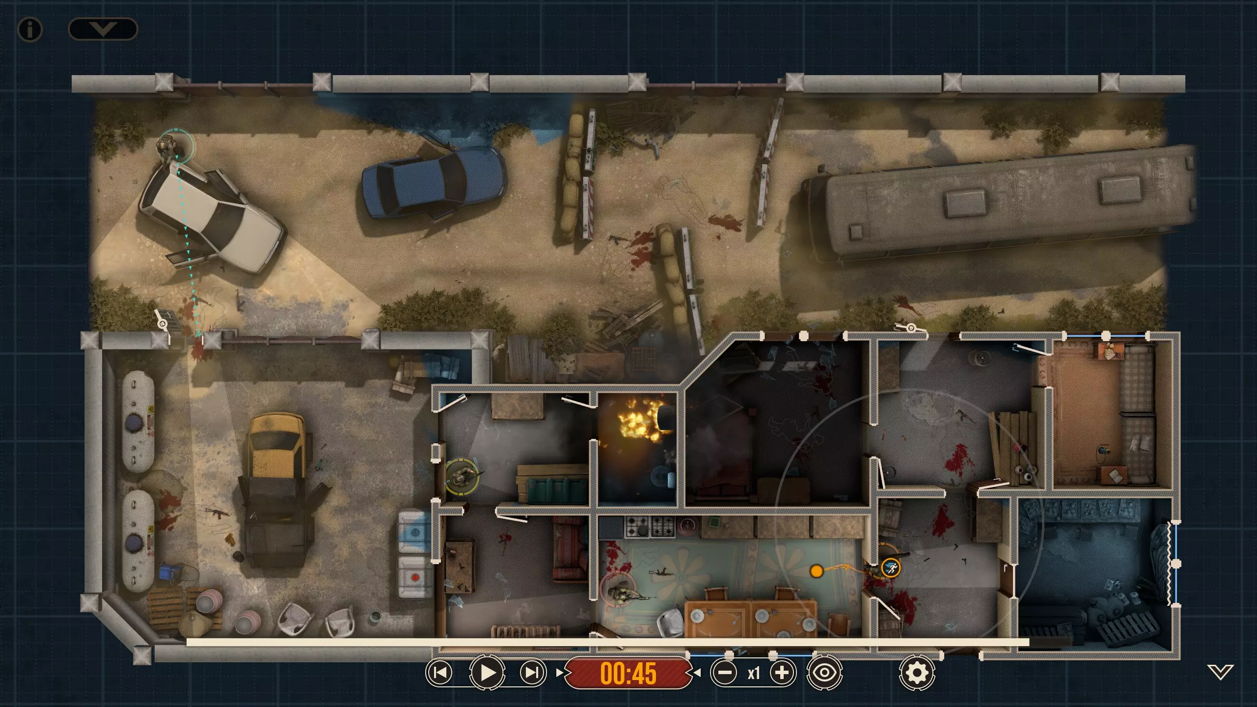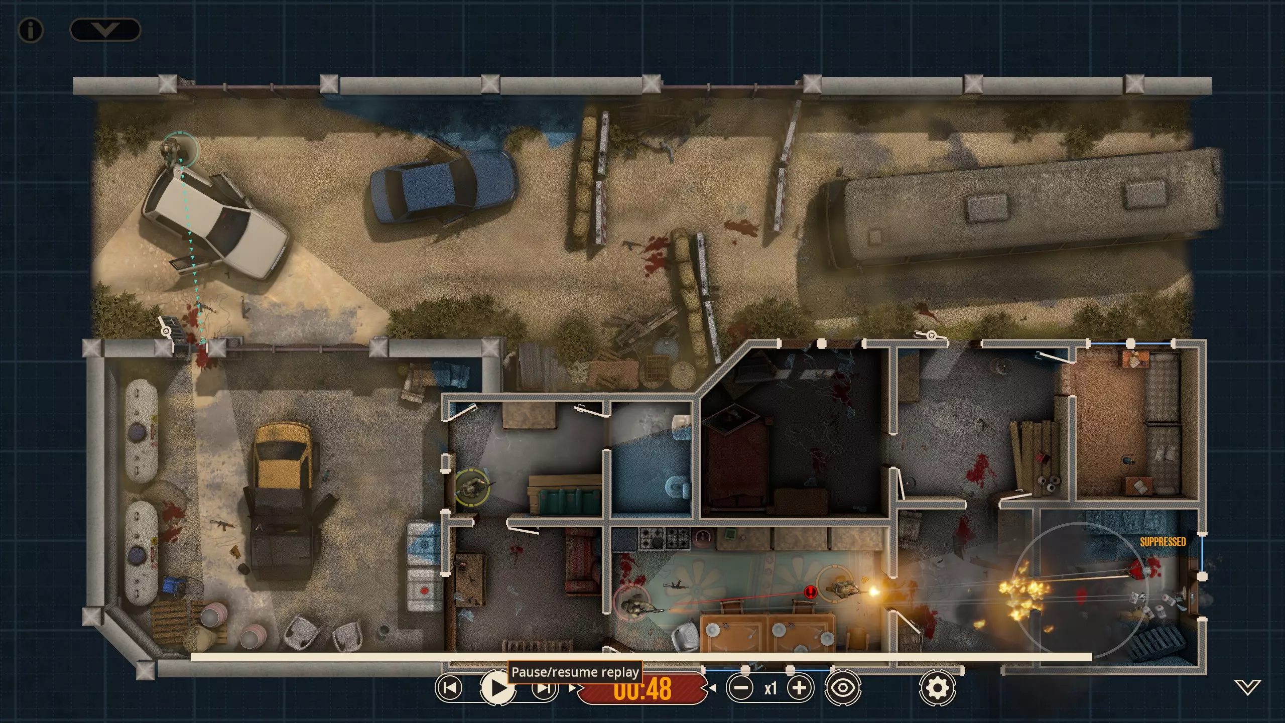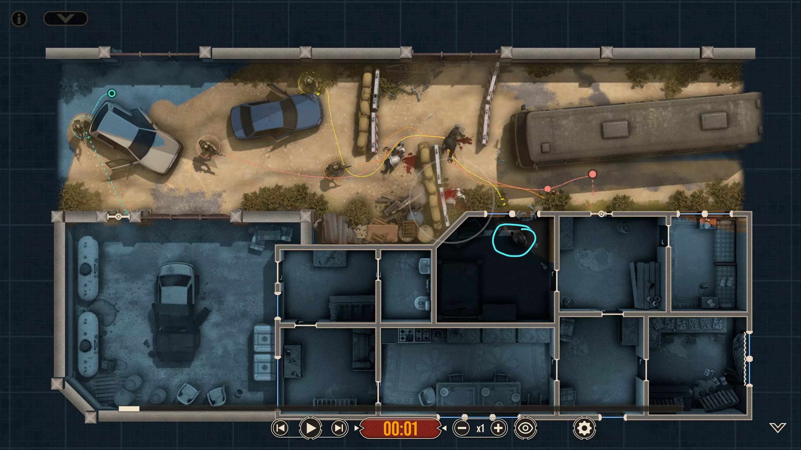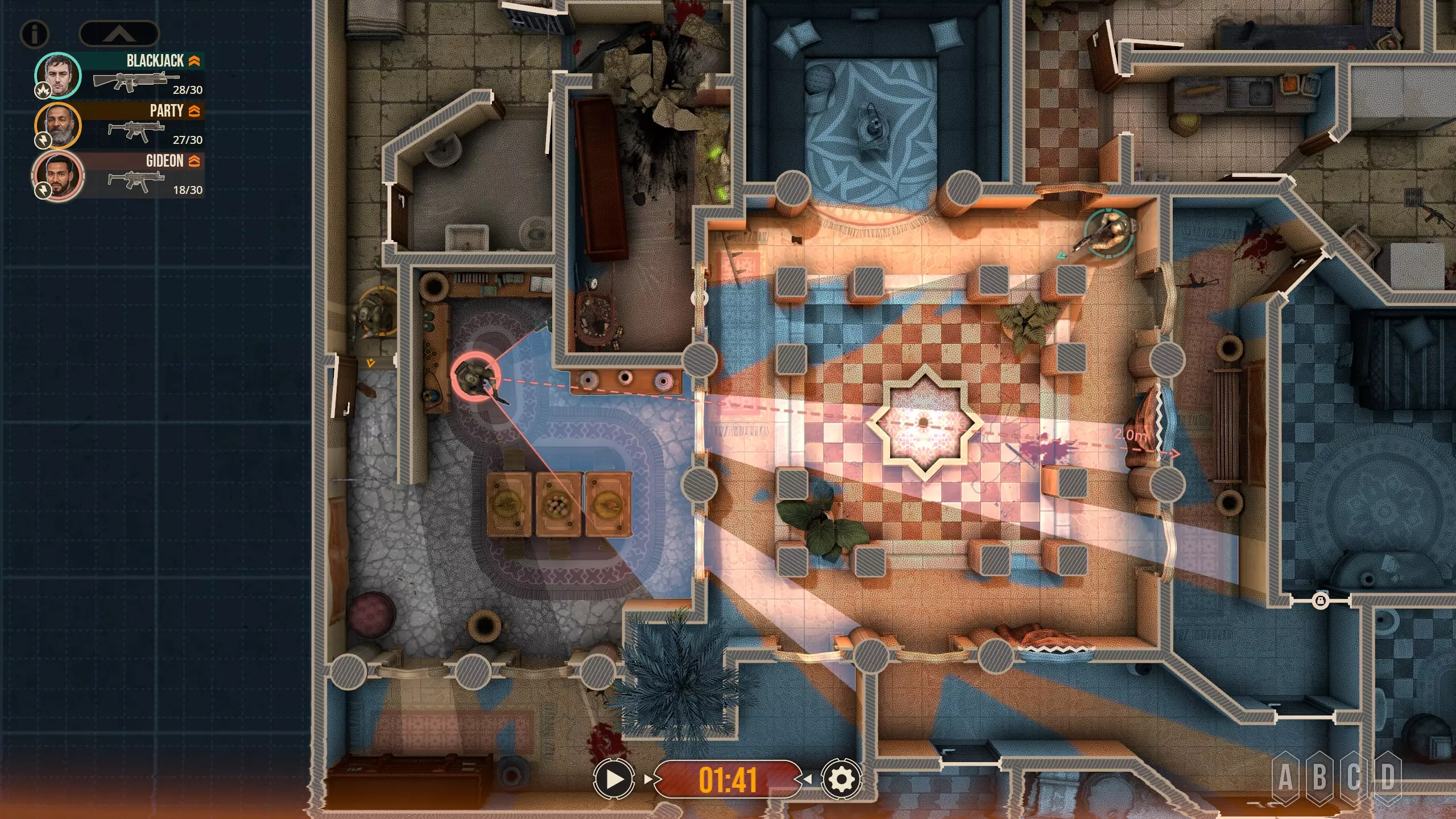 不出所料,随着三名敌人被解决,黄色突击队员射穿了窗帘,现在暗房里出现了一个清晰可见的敌人。他没有面朝我们,而是指向那扇他为了探查听到的“动静”必须经过的门。这并不会改变我们选择派谁参战的策略,但谁不喜欢来点小小的解说呢?