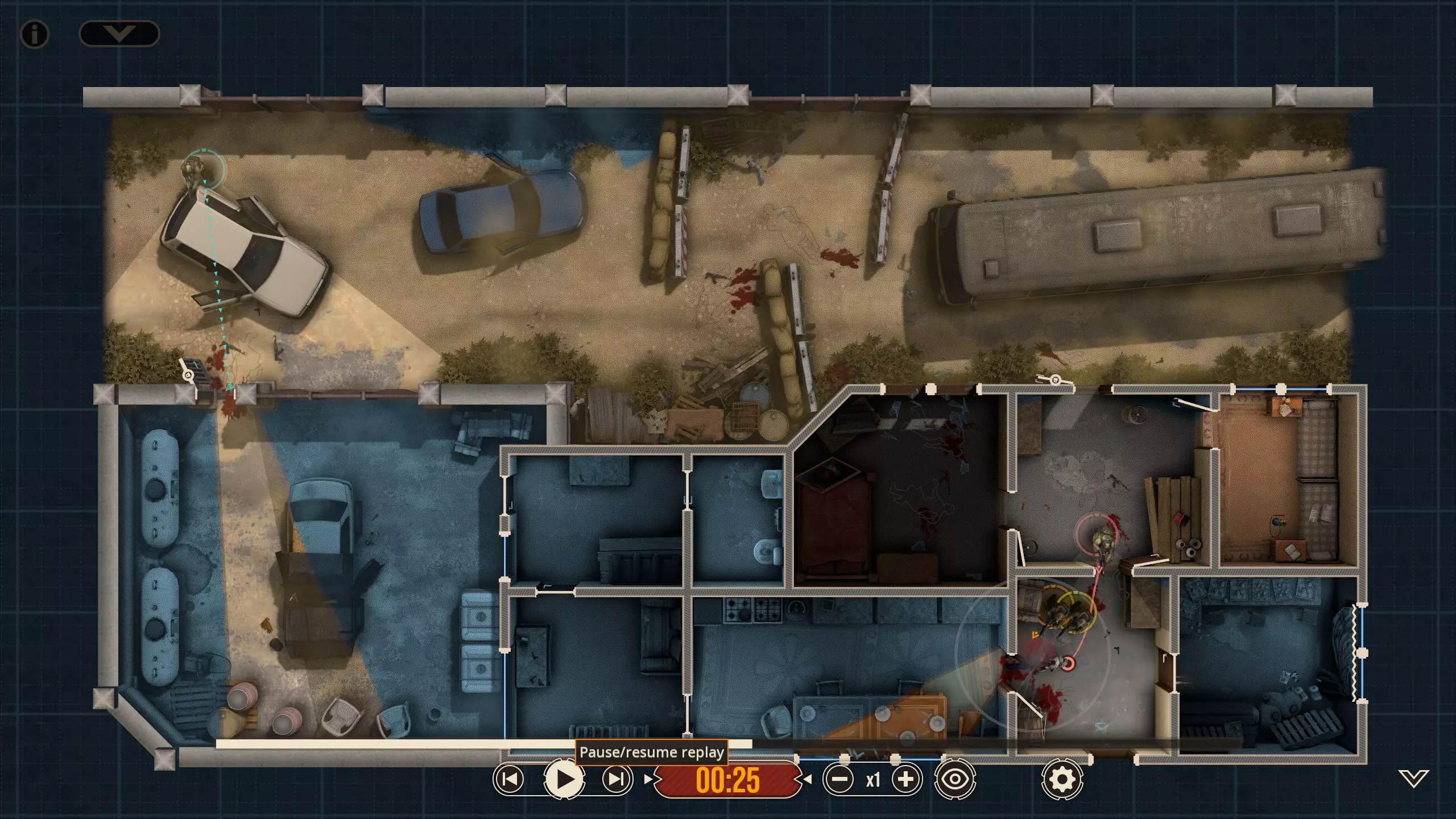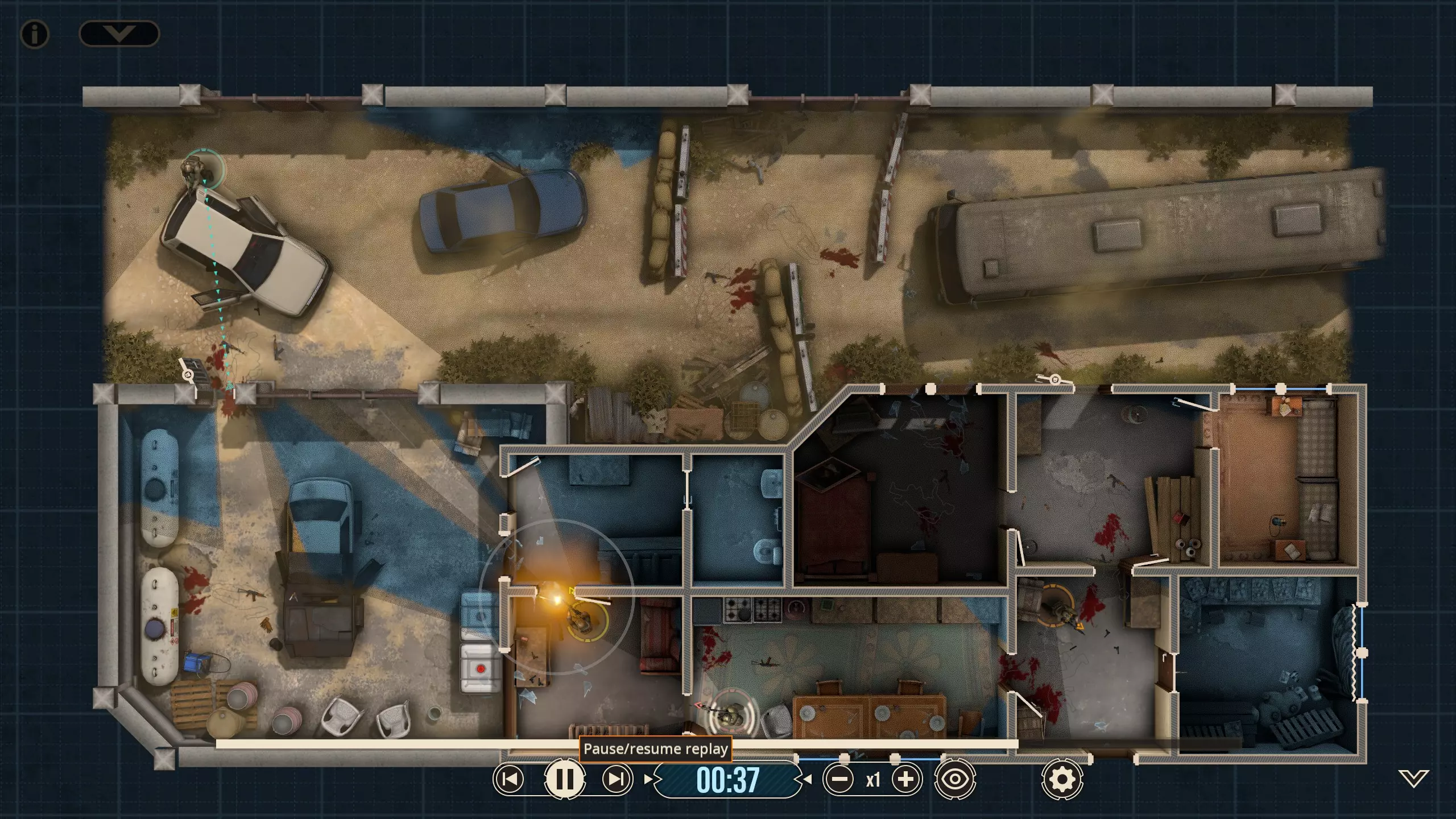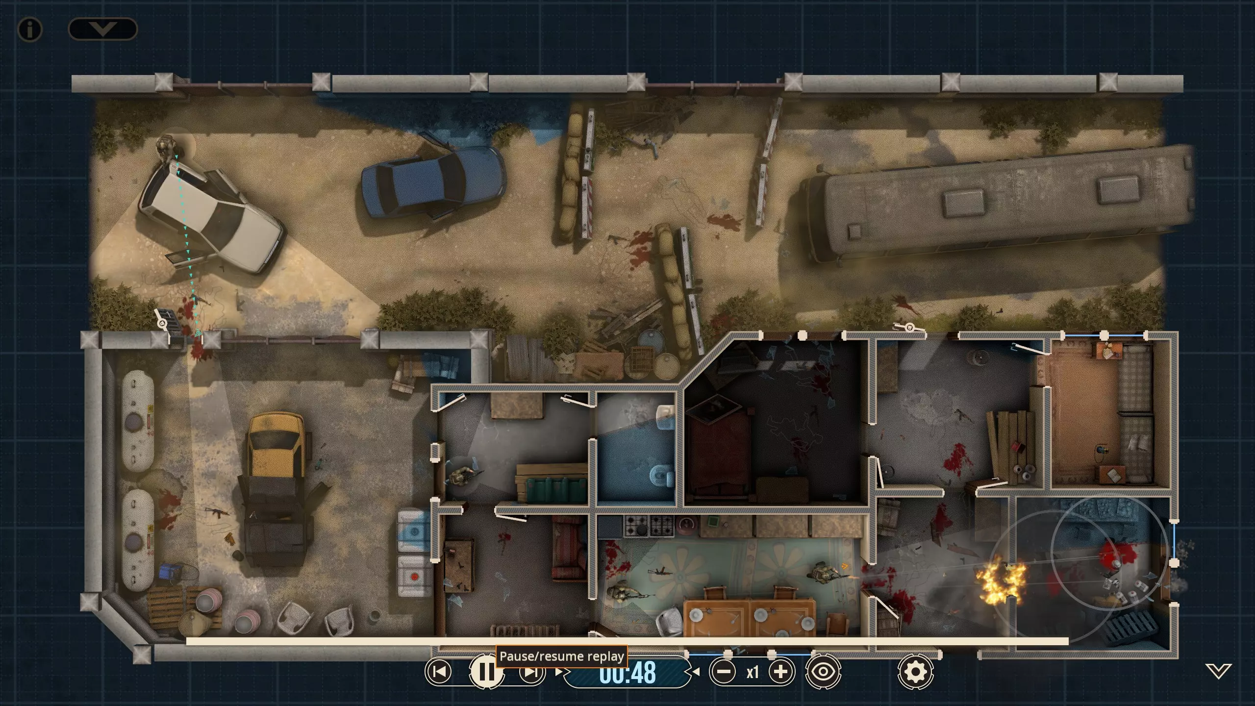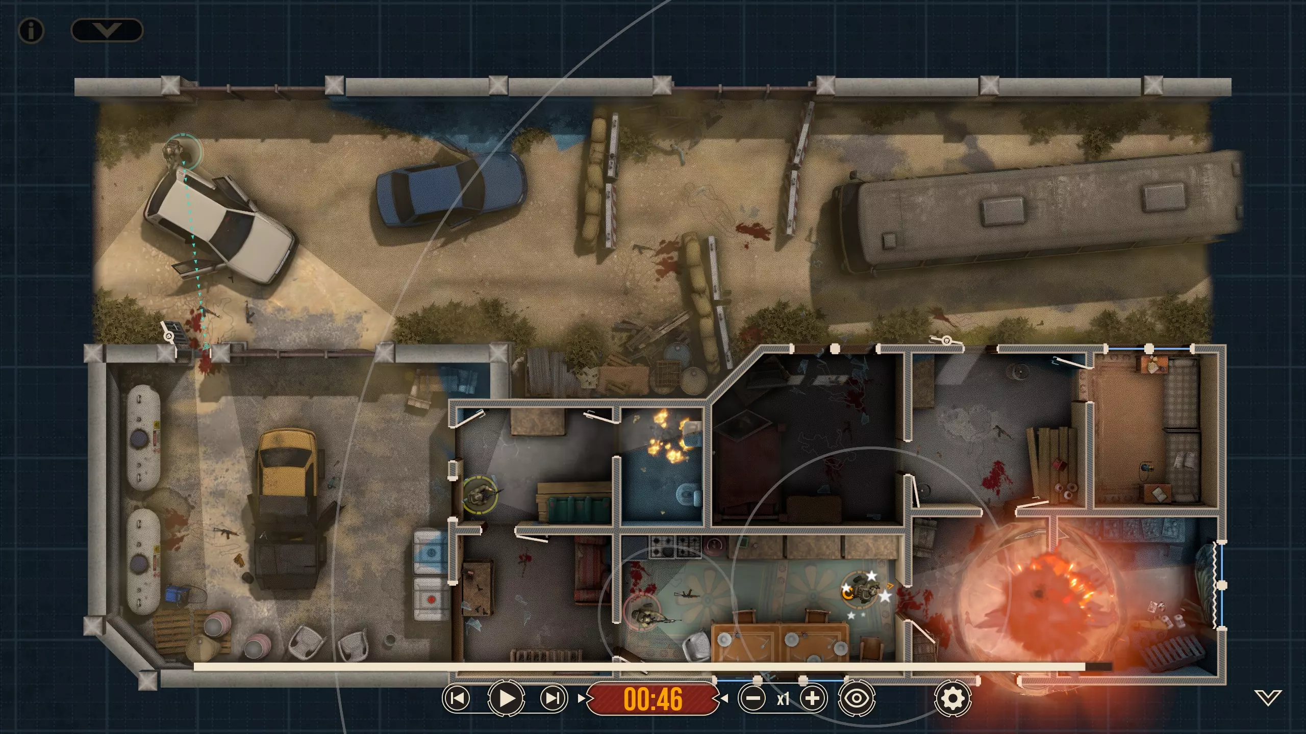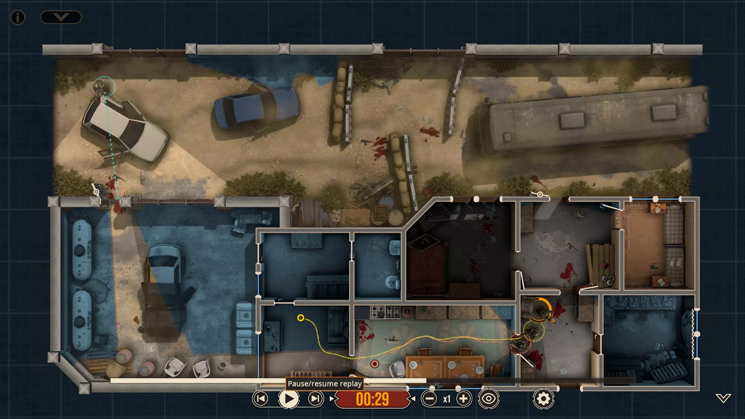 不出所料,随着三名敌人被解决,黄色突击队员射穿了窗帘,现在暗房里出现了一个清晰可见的敌人。他没有面朝我们,而是指向那扇他为了探查听到的“动静”必须经过的门。这并不会改变我们选择派谁参战的策略,但谁不喜欢来点小小的解说呢?