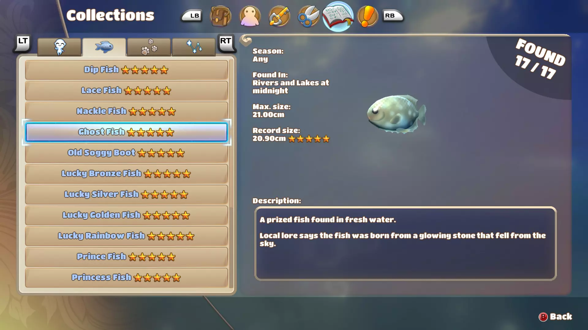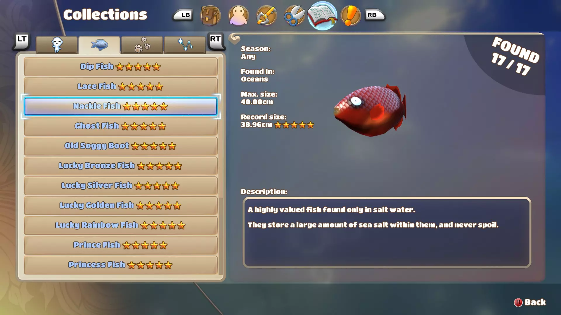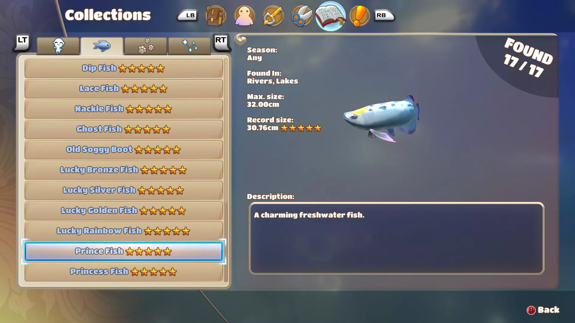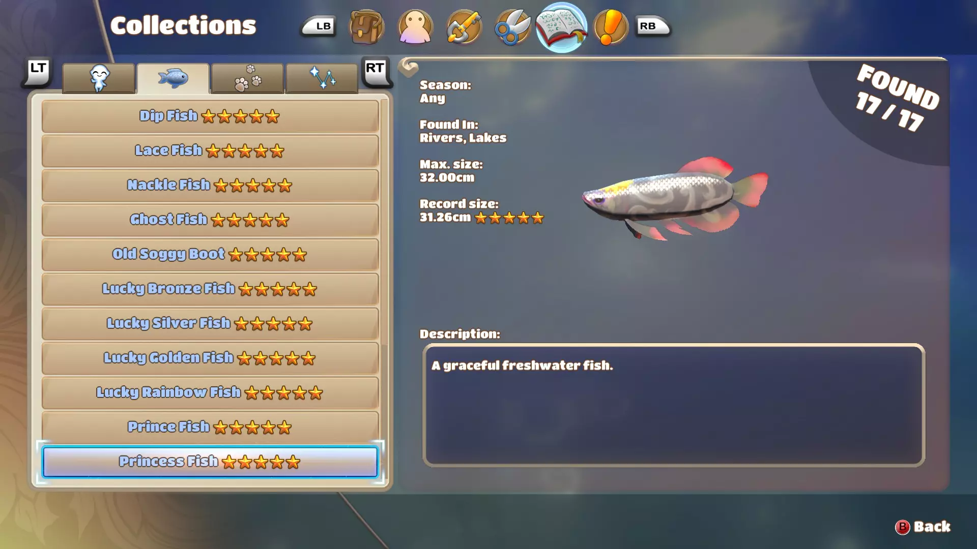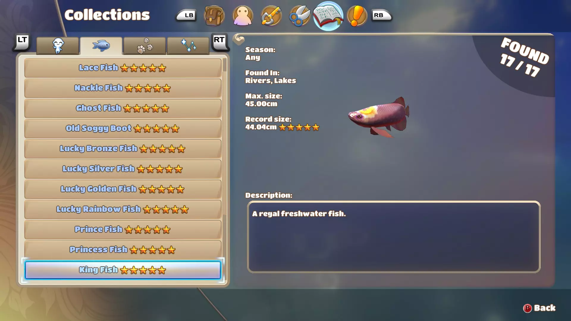 公主鱼和王子鱼颇为相似,体型和游速都差不多,但它们通常生活在不同的水域,因此很容易分辨水里游的是哪种鱼。由于这种鱼游速较快且体型较大,所以不太容易上钩,耐心点并避开其他鱼就好。 国王鱼