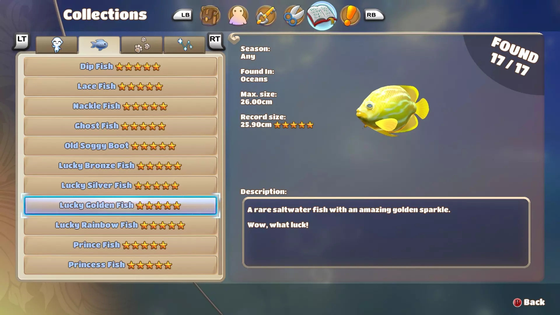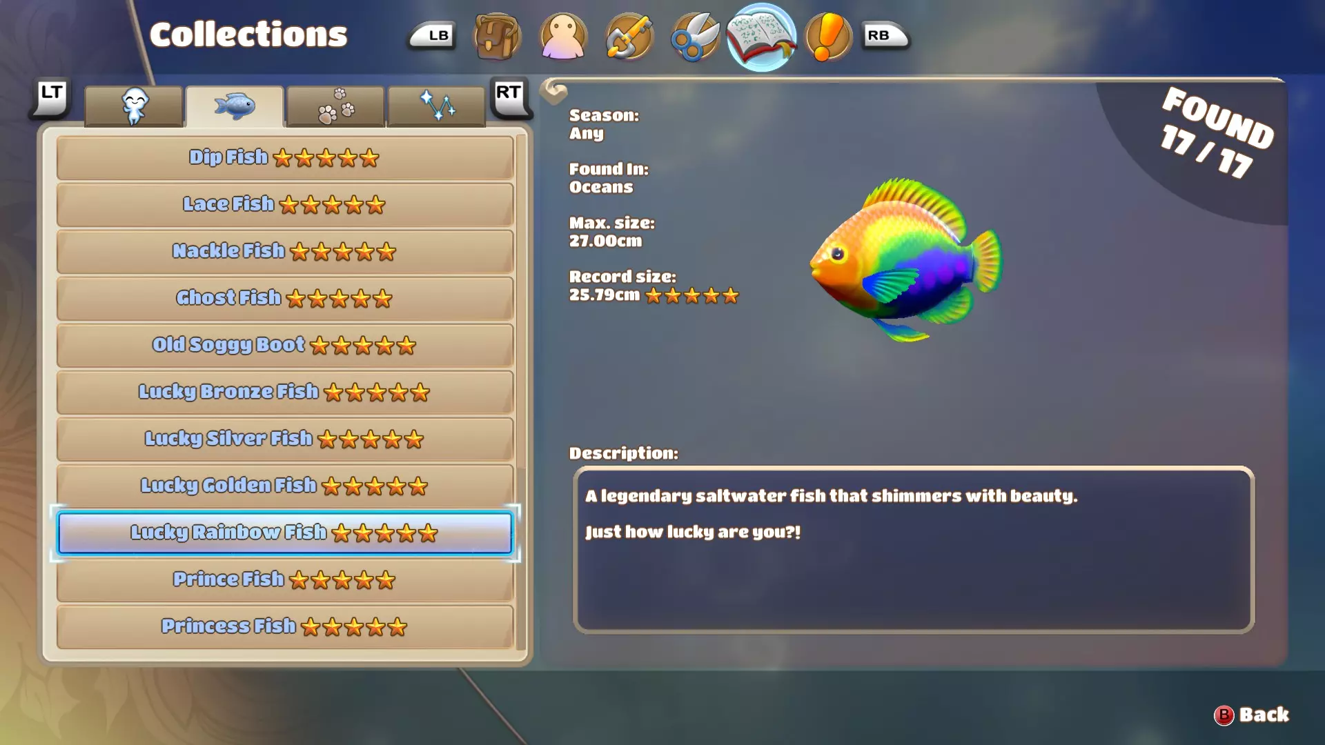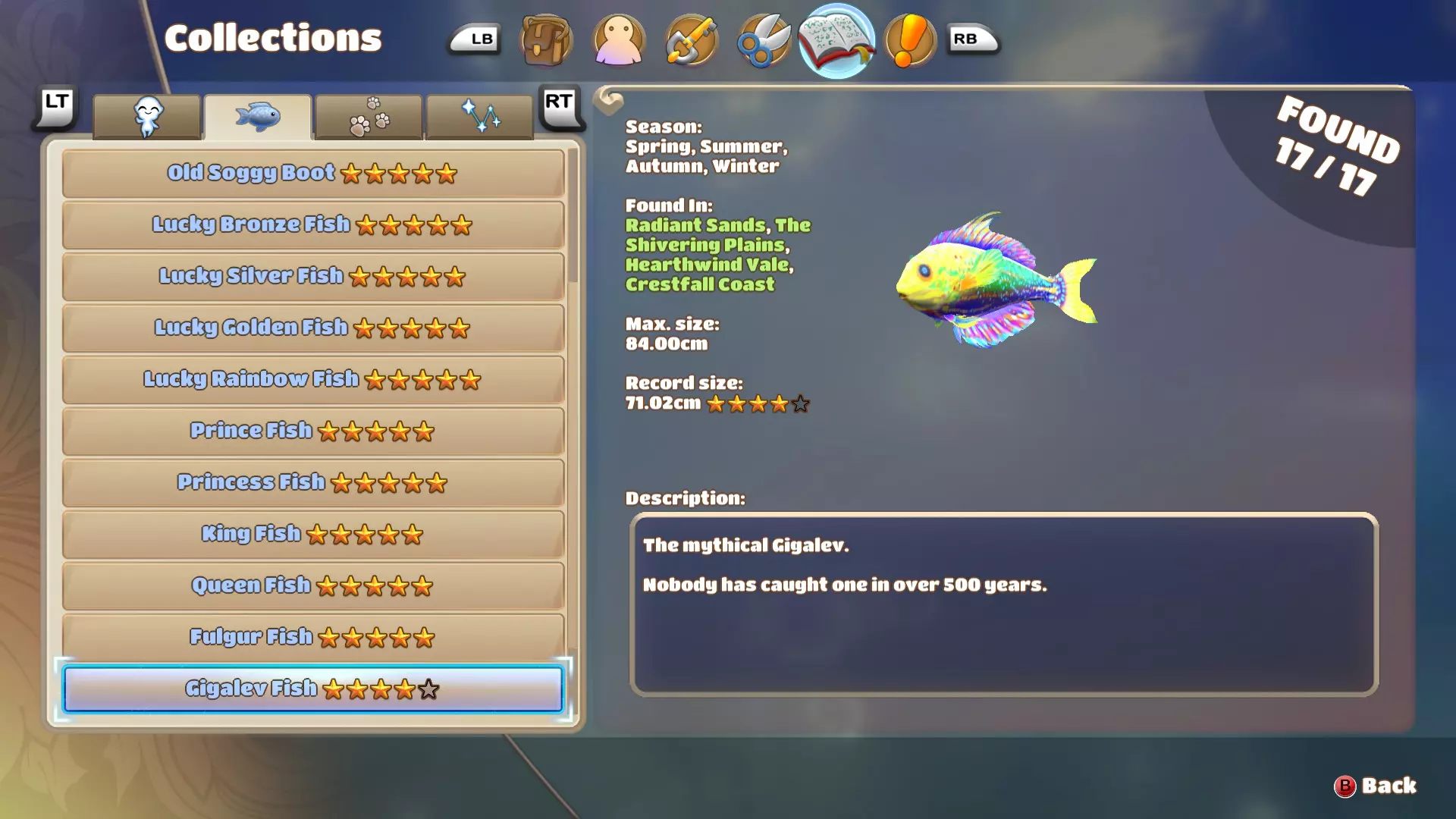 对大多数玩家来说,幸运彩虹鱼可能是最难找到的鱼类。由于游戏没有提供关于这种鱼的任何信息,我不得不花很长时间去寻找它。幸运彩虹鱼看起来与幸运金鱼和幸运银鱼非常相似,它们的体型和游速都颇为接近。但幸运彩虹鱼和幸运青铜鱼一样,在其后鳍上有一个相当大的钩形裂口,因此可以很容易地与其他鱼类区分开来。 巨列夫鱼