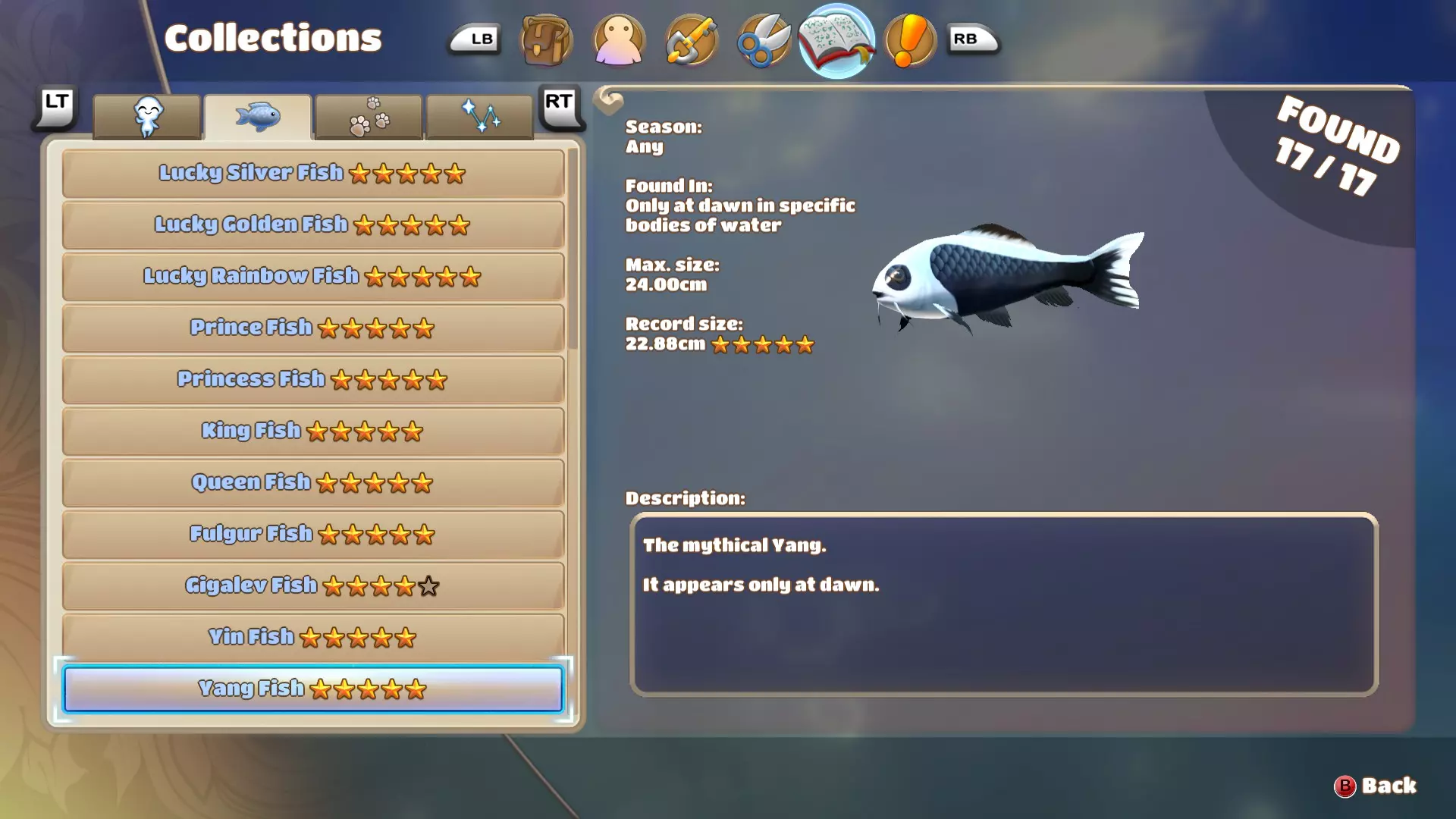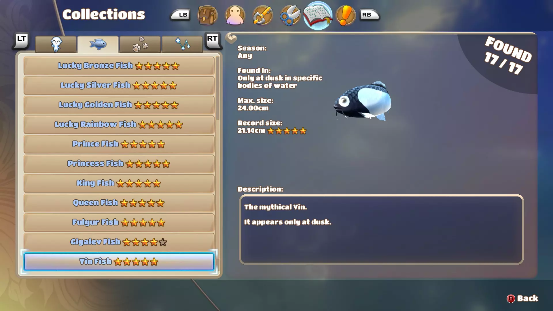 阴鱼只在黄昏时出现。我在尝试钓五星阴鱼时发现,它的出现时间大约在下午5点到7点30分之间。阴鱼体型肥硕,外观与其他淡水鱼不同,但和闪电鱼有些相似,不过体型比闪电鱼小很多。运气好的话,一天可能钓到2条甚至3条。我花了相当长的时间才钓到五星阴鱼。 阳鱼