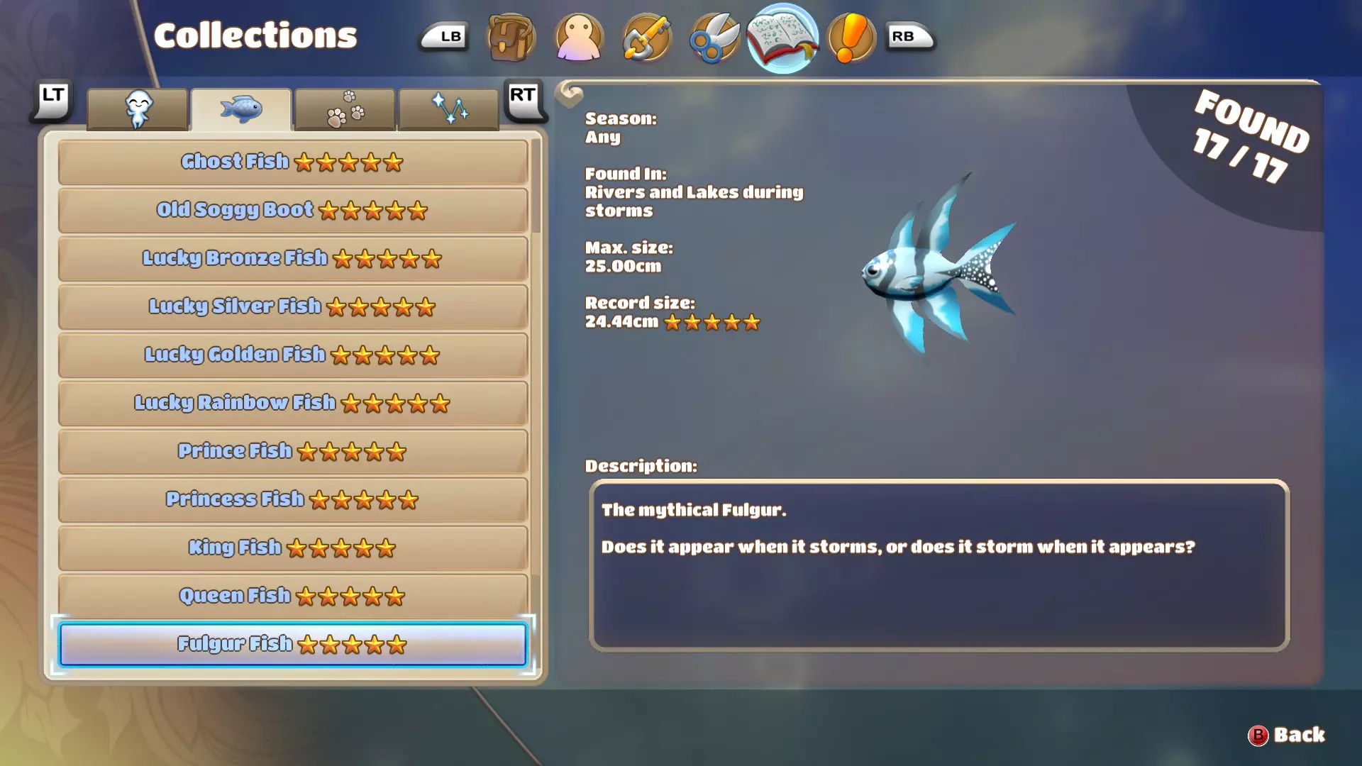 闪电鱼体型相当大,实际上,即便是王鱼和后鱼在它旁边也显得矮小。唯一比闪电鱼更大的鱼是巨雷鱼。因此,当闪电鱼出现时,你会立刻注意到。通常在暴风雨天气时,闪电鱼的出现频率相当高,但我也曾在晴朗天气发现过它。这可能是因为岛上其他地方有暴风雨,或者即使没有暴风雨,它也有一定的出现几率,又或者这只是一个漏洞。捕捉这种鱼的唯一难点在于它体型很大。由于体型庞大,找到合适的位置放置浮漂来吸引它并不容易,而且它的身体下方可能还藏着其他较小的鱼,这些小鱼可能会在你没注意到的情况下对你的鱼饵产生兴趣。 阴鱼