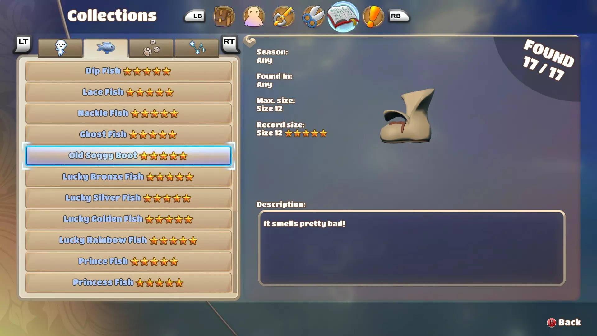 【浸水鱼】随处可见,甚至在咸水中也能找到。正如游戏内描述所说,这种鱼很容易对鱼饵产生兴趣,因此它常常会在你试图钓其他鱼时咬钩,比较令人烦恼。 【旧 soggy 靴子】