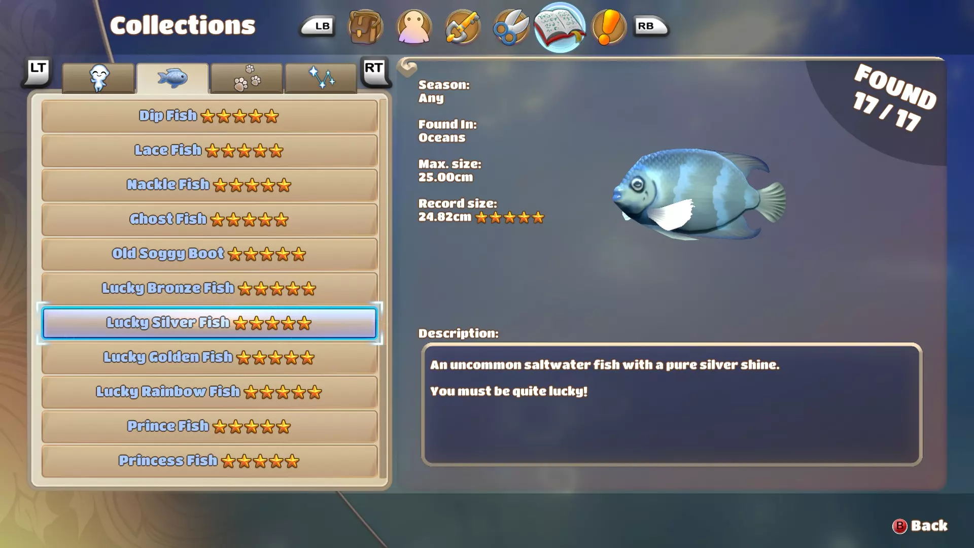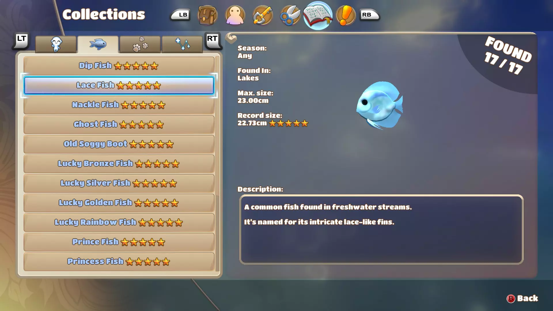 了解在哪里以及如何找到并捕获所有鱼类。 简介 大家好! 在游戏中寻找所有鱼类可能需要漫长的搜索,并且带有一些运气成分。因此,如果你只想获得钓鱼成就,知道应该在哪里下竿可以为你节省数小时的时间。 如果你和我一样,有志于捕获所有五星评级的鱼类,那么本指南可能也会对你有所帮助。 我将首先介绍游戏中的所有鱼类,之后会展示我经过数小时钓鱼后发现的最有希望的钓鱼地点,以及在那里能钓到的鱼类。请注意,我还会描述如何区分这些鱼类,例如,这对于寻找幸运彩虹鱼会非常有帮助。我会尽量保持本指南的更新,若未来有任何变化,我会将其添加到指南中。 钓鱼的基本信息: 当你抛竿后,鱼会开始在水中生成并四处游动,直到你钓到一条鱼或收竿为止。最多会生成6条鱼,如果你未能钓到任何一条,所有鱼都会游走,之后最多会生成6条新的鱼。不同的鱼在水中看起来也会有所不同,所以如果你有一些经验,观察周围游动的鱼的形状和大小,就能轻松分辨它们是什么鱼。如果你想钓特定的鱼,这一点尤其重要。我会告诉你要留意哪些细节,以便区分那些看起来非常相似的鱼。 要让鱼对你的鱼饵产生兴趣,你得把鱼饵悬在它面前,但要小心,一旦它们对鱼饵产生兴趣,就会跟过来并试图咬住它。所以,如果你想钓特定的鱼,要注意不要意外吸引到其他鱼。 淡水鱼 浸鱼